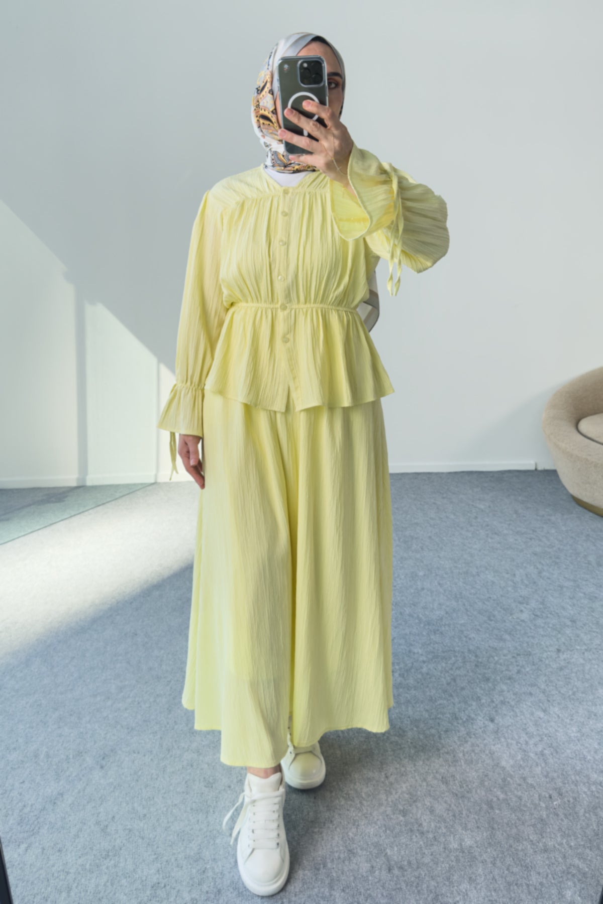 Hatunatila'nın özenle tasarladığı bu büzgülü kat detaylı takım, kaliteli işçiliği ve modern çizgisiyle gardırobunuzun favori parçalarından biri olacaktır. Hemen sepetinize ekleyerek bu özel elbiseye sahip olun!