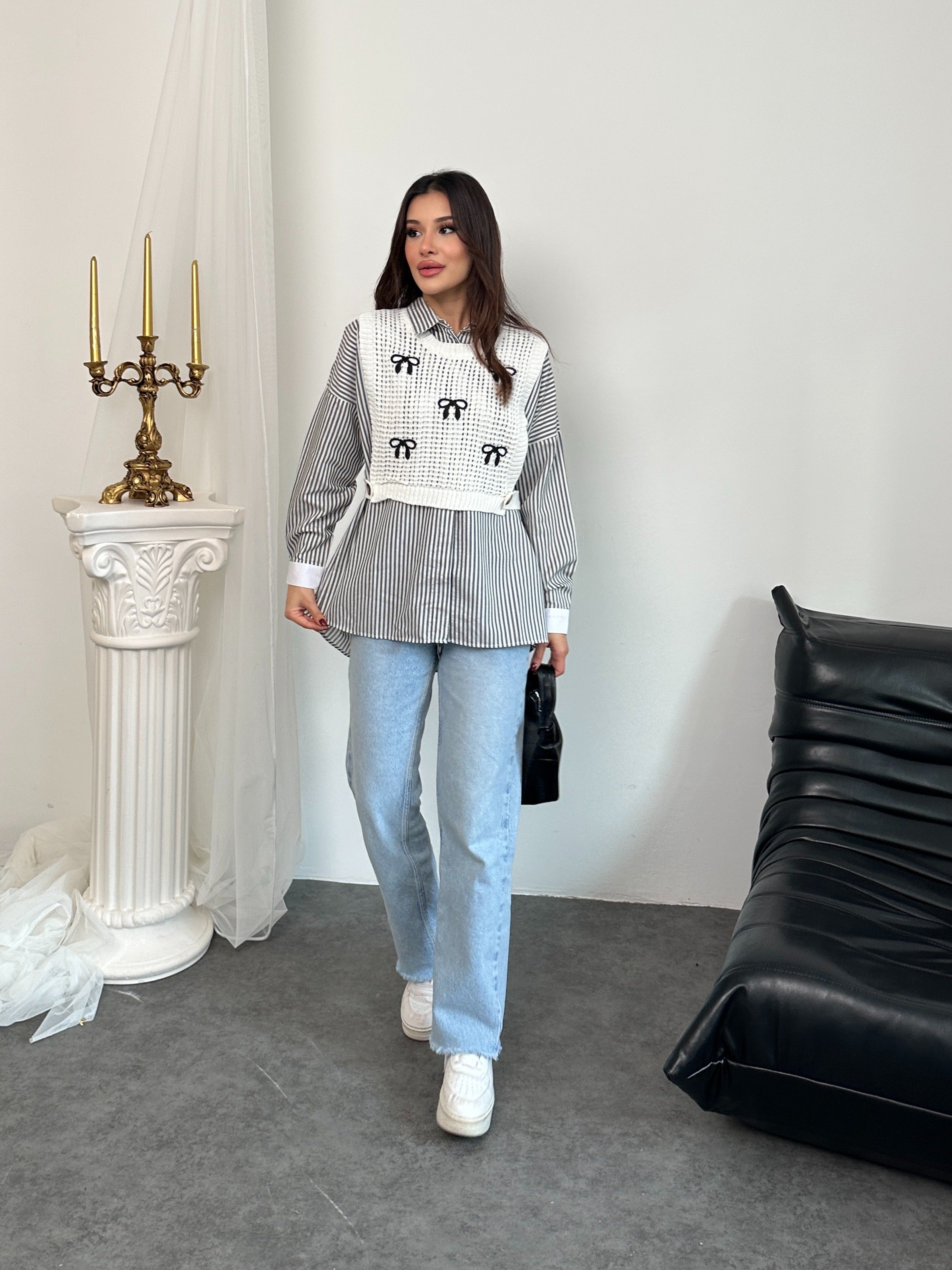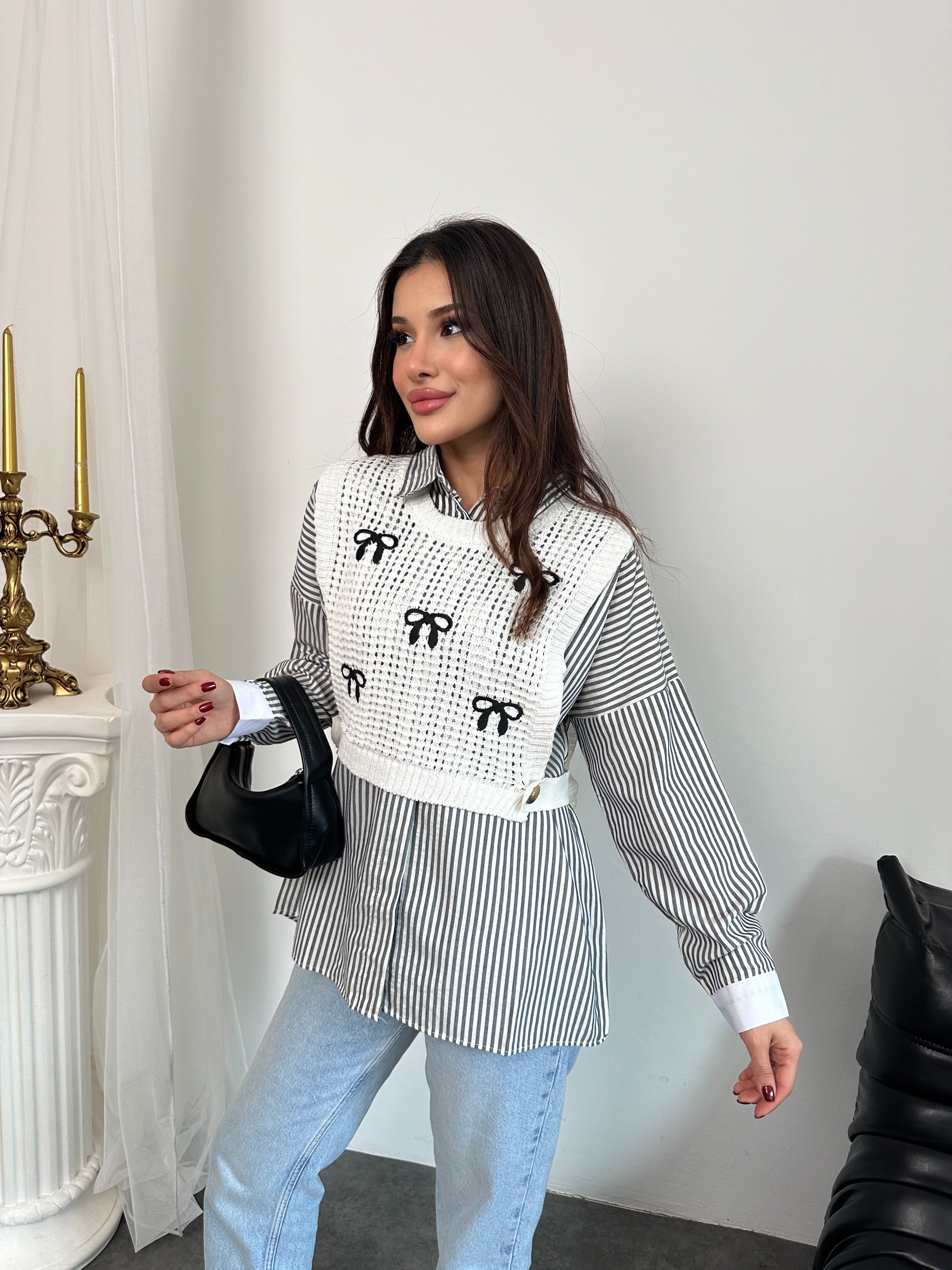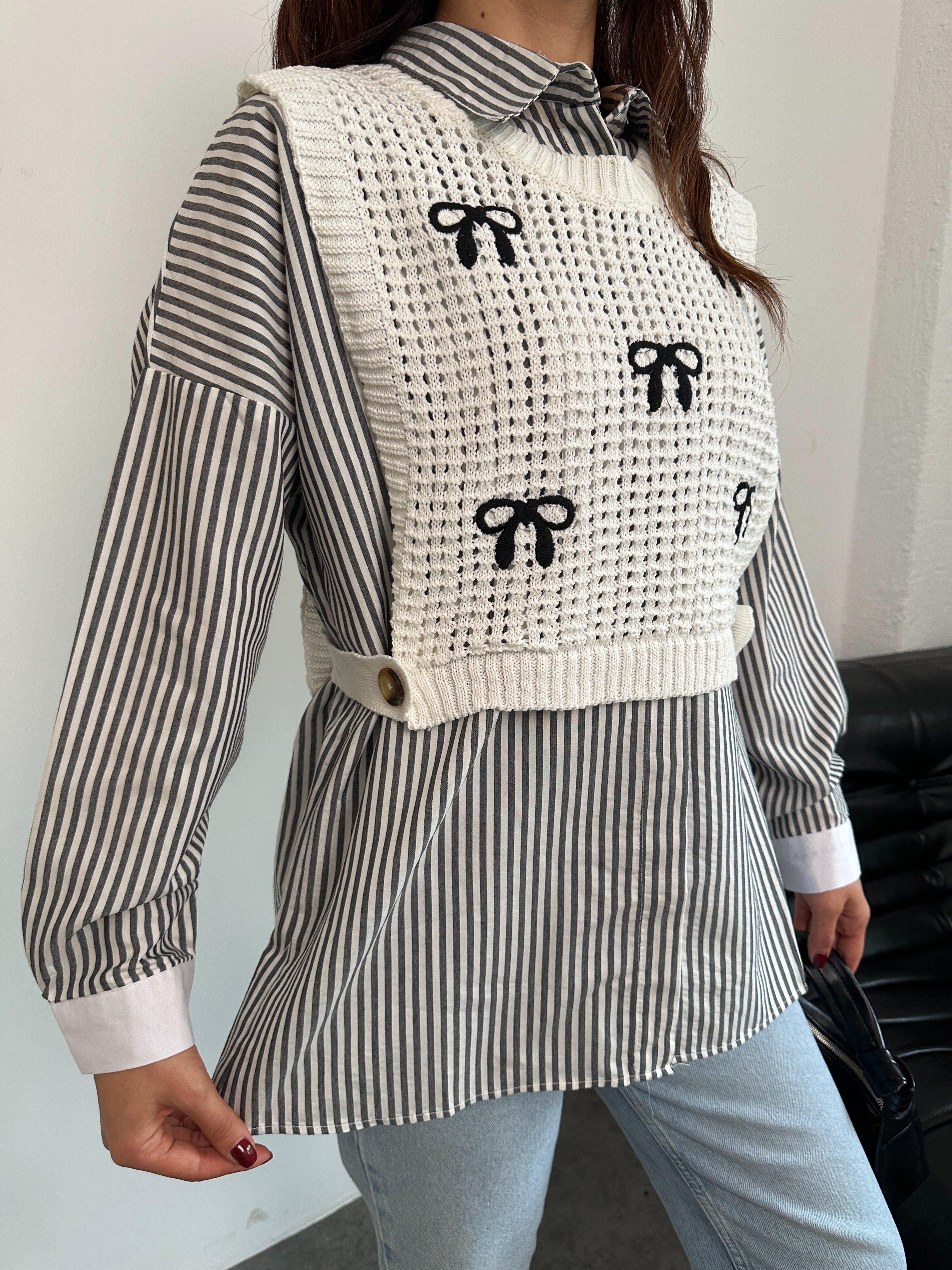 Çizgili Gömlek ve Fiyonk İşlemeli Süveter İkili Takım - Antrasit