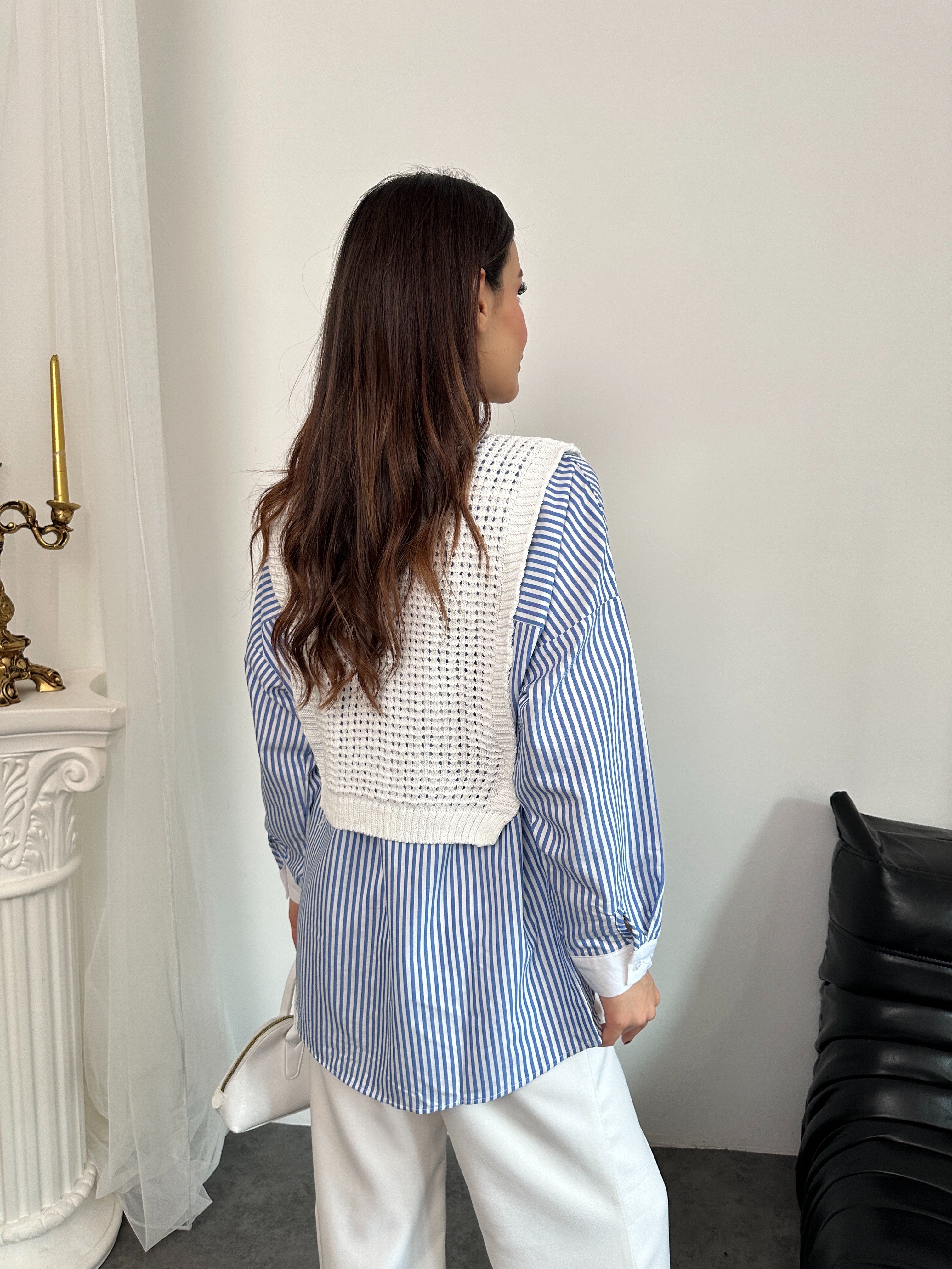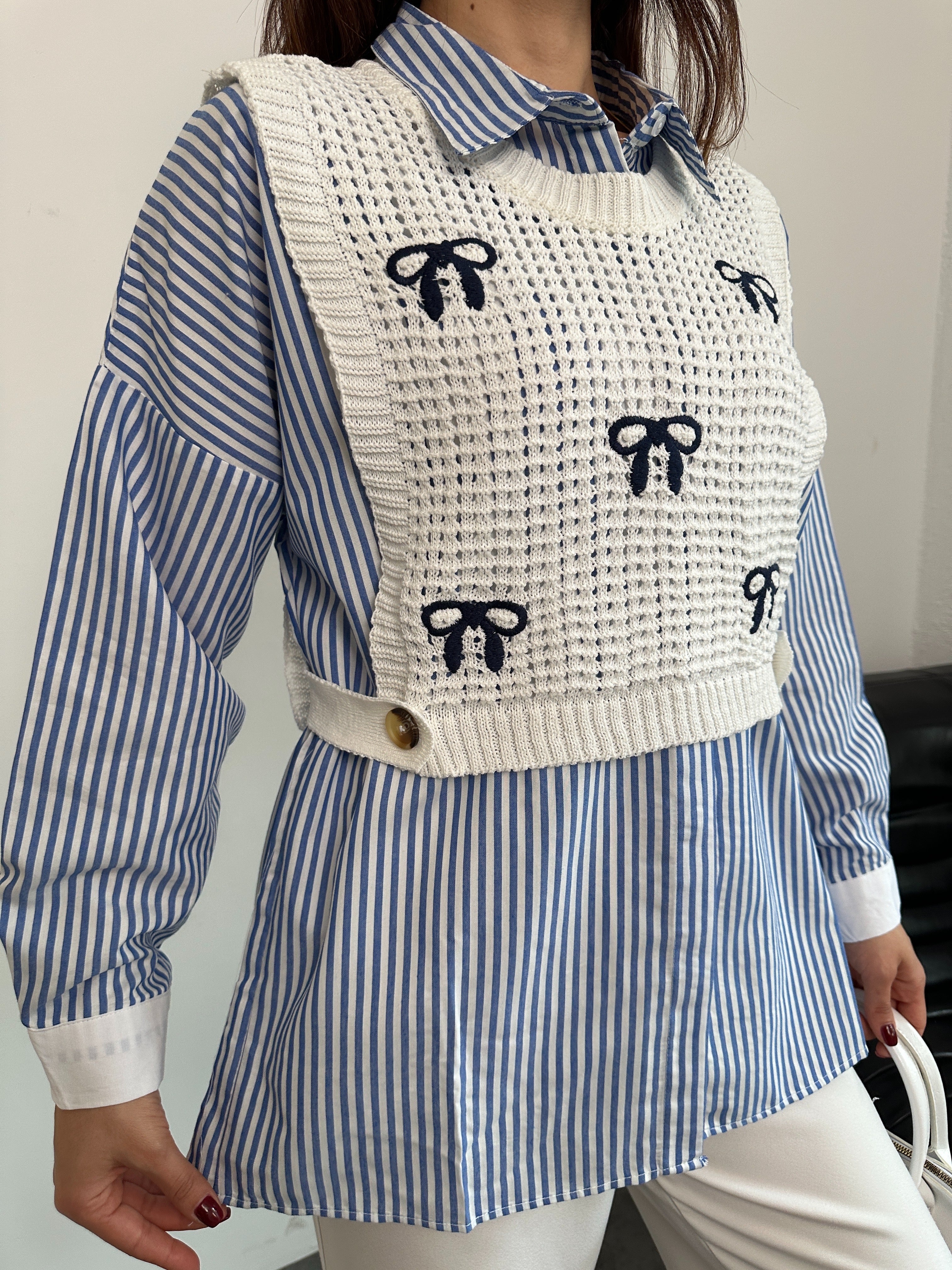 Çizgili Gömlek ve Fiyonk İşlemeli Süveter İkili Takım 0241 - Lacivert