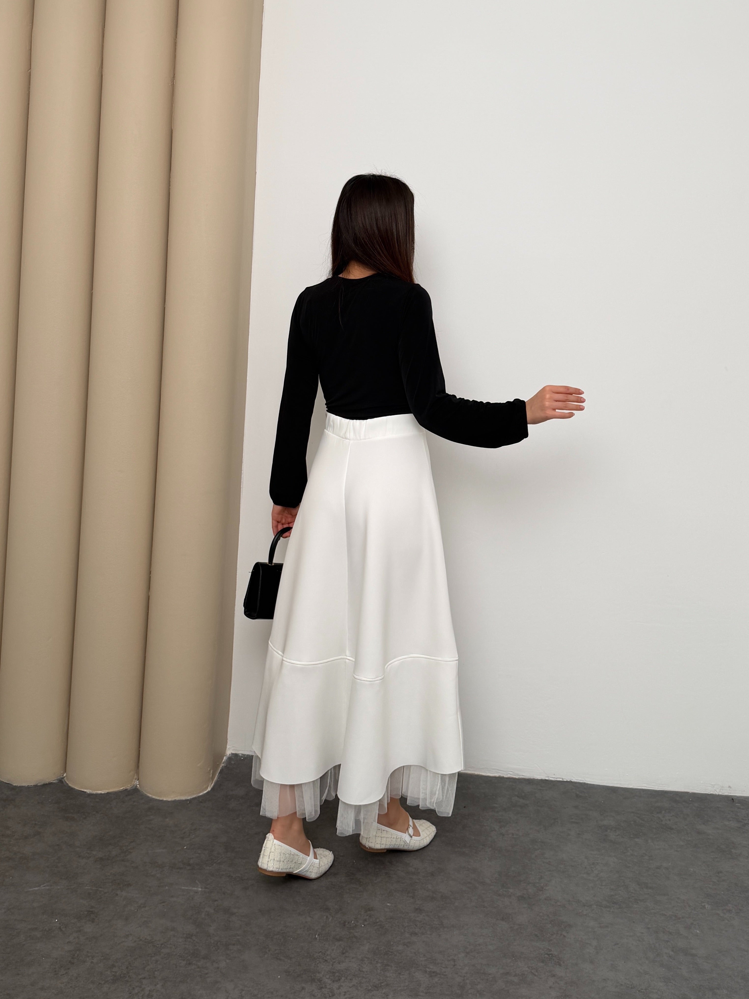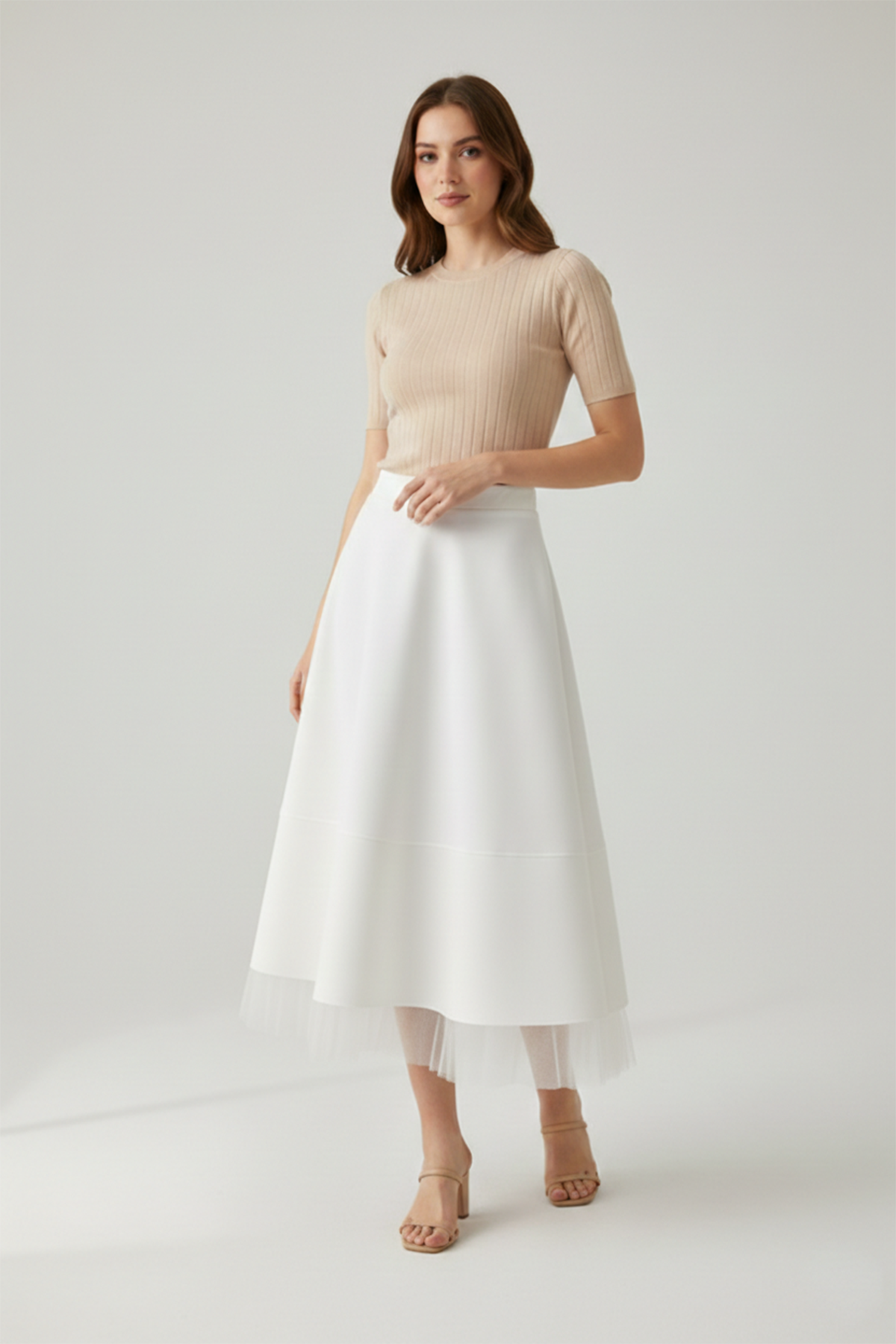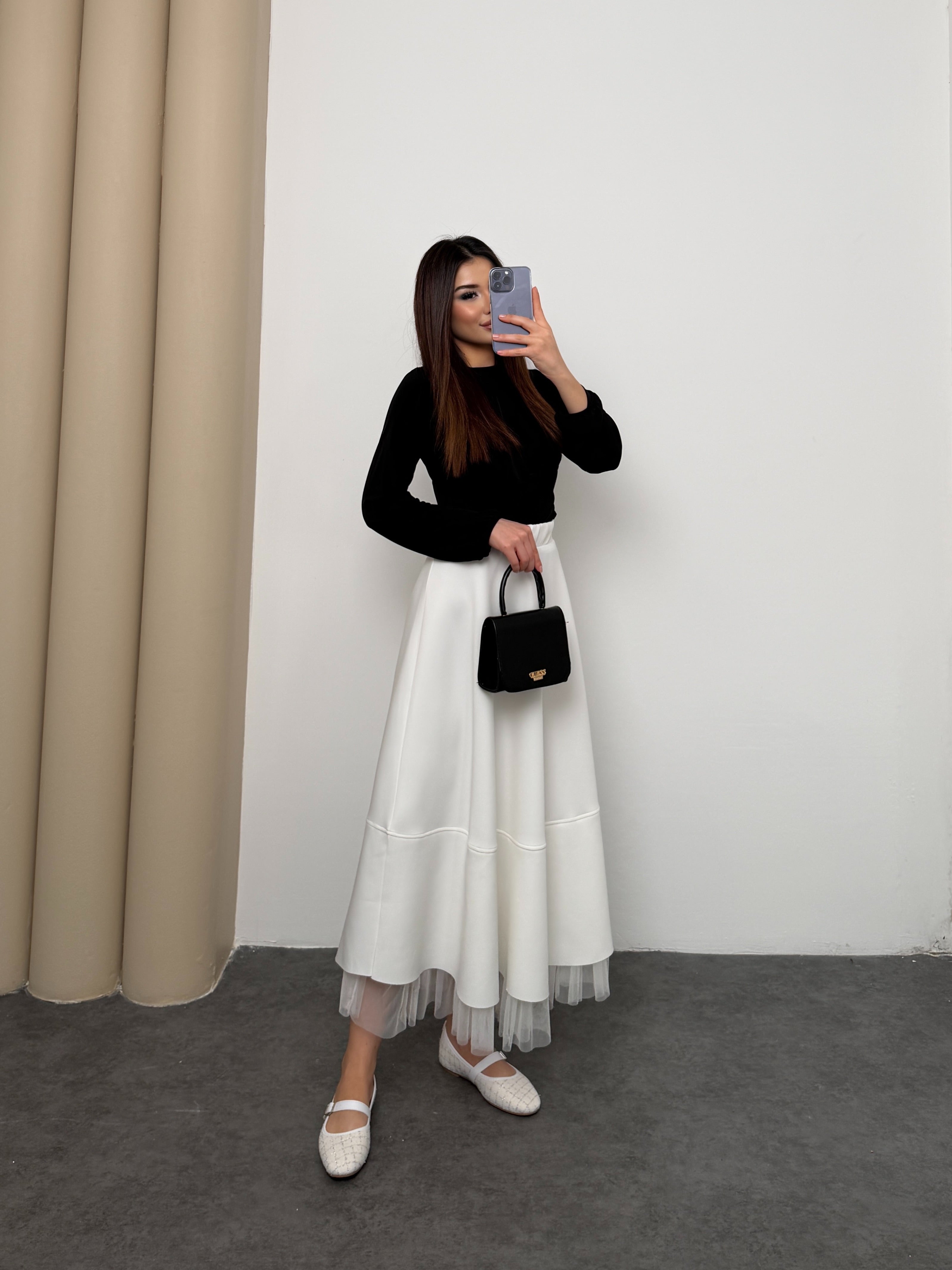 Zarafeti ve modern tasarımı bir arada sunan bu beyaz etek, gardırobunuzun en asil parçalarından biri olacak. ✨ Yüksek bel kesimi ve aşağıya doğru genişleyen kloş formuyla her adımda şıklık sunarken, alt kısmındaki tül detayıyla stilinize sofistike bir dokunuş katar. Ofis kombinlerinden özel davetlere kadar geniş bir kullanım alanına sahiptir. 🤍