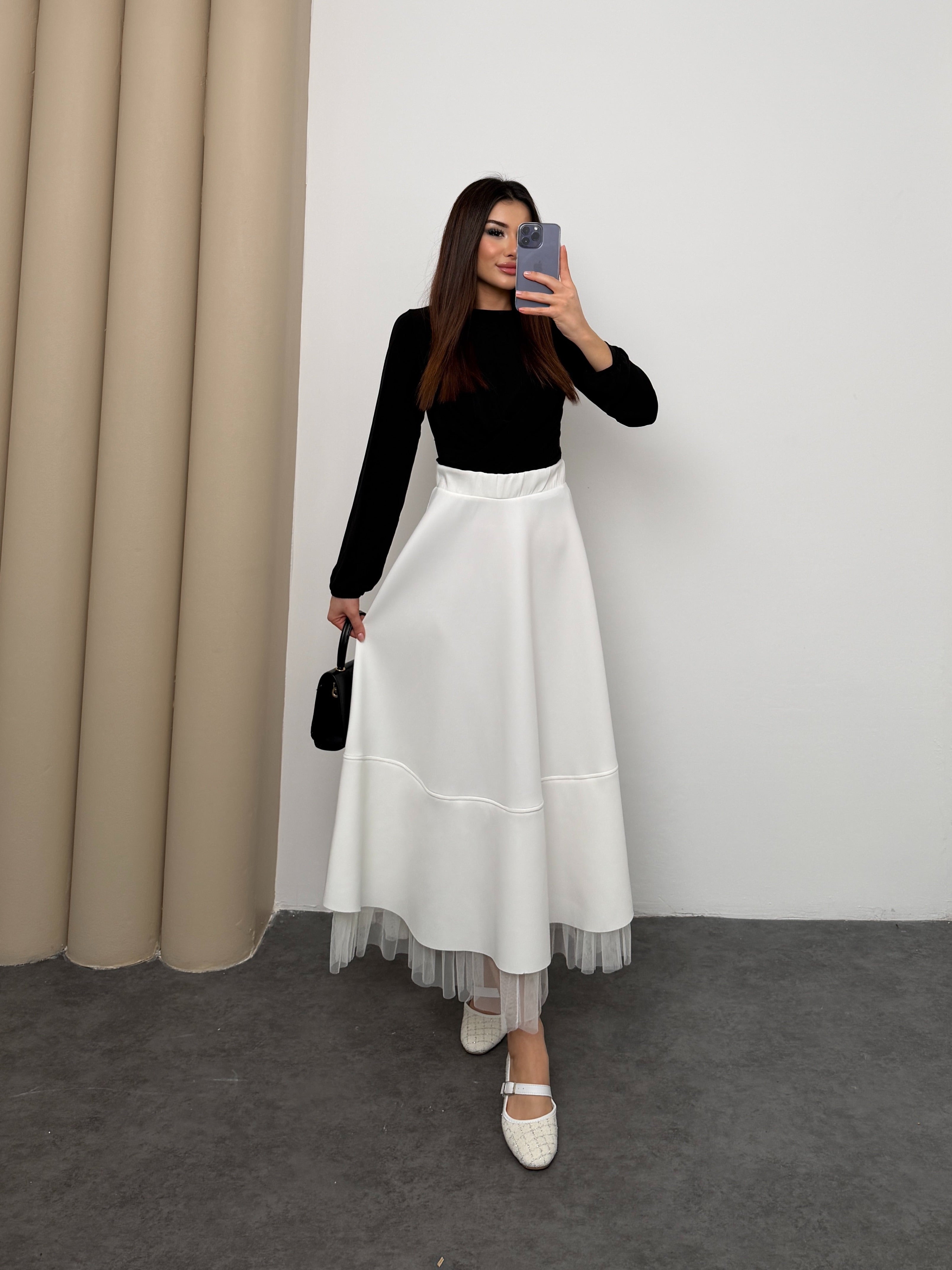 Kadın Tül Detaylı Beli Lastikli Kloş Uzun Etek 5281 - Beyaz