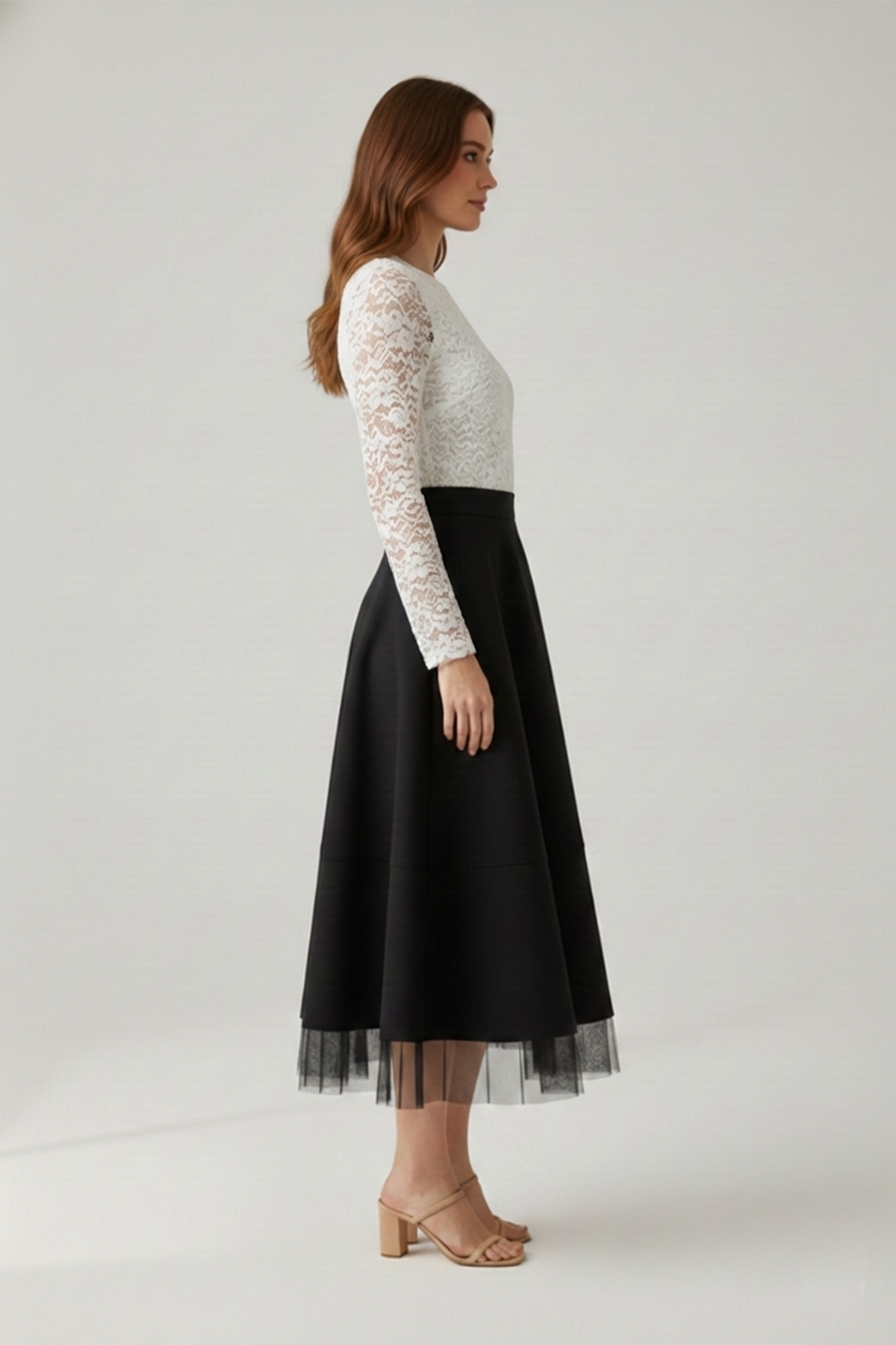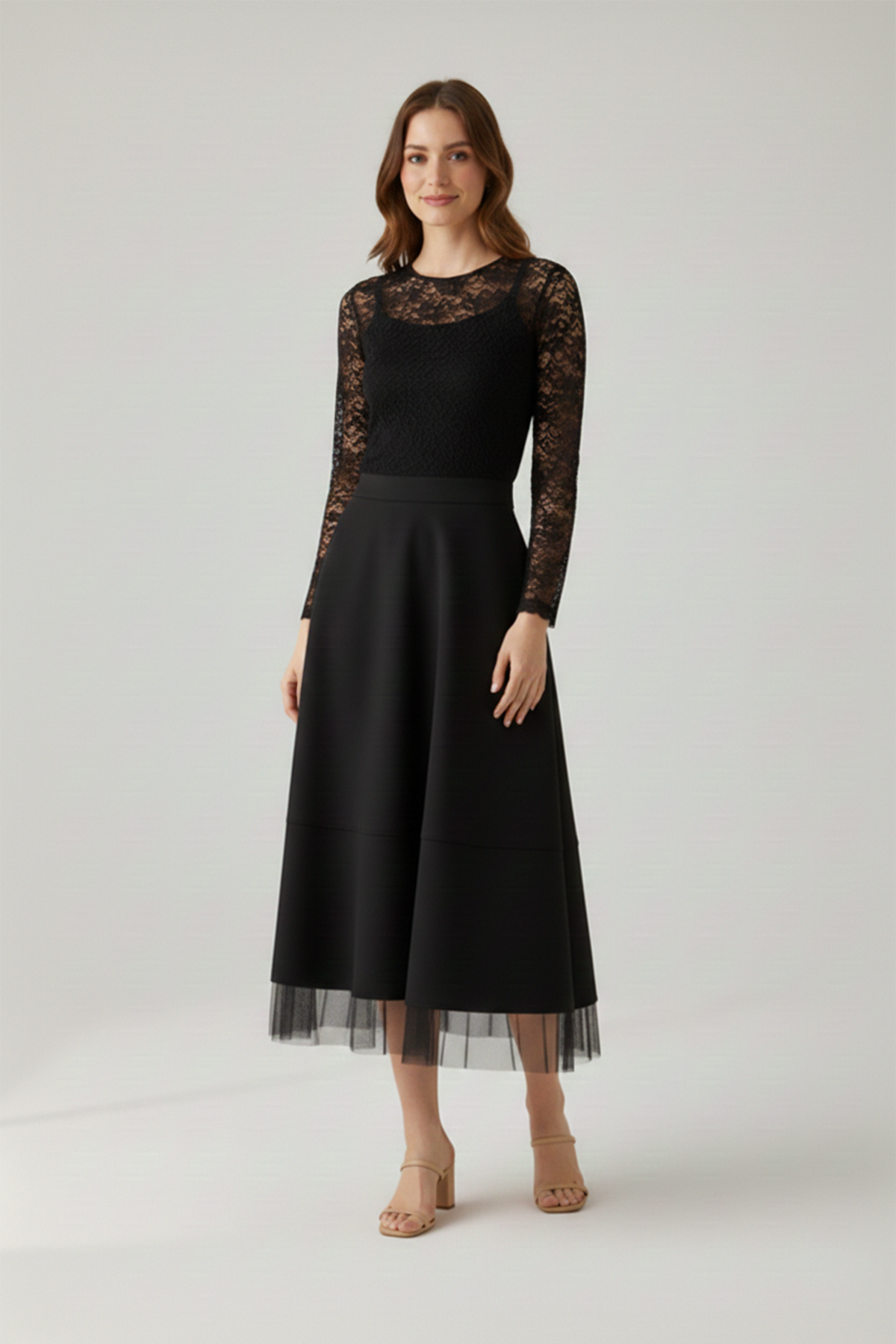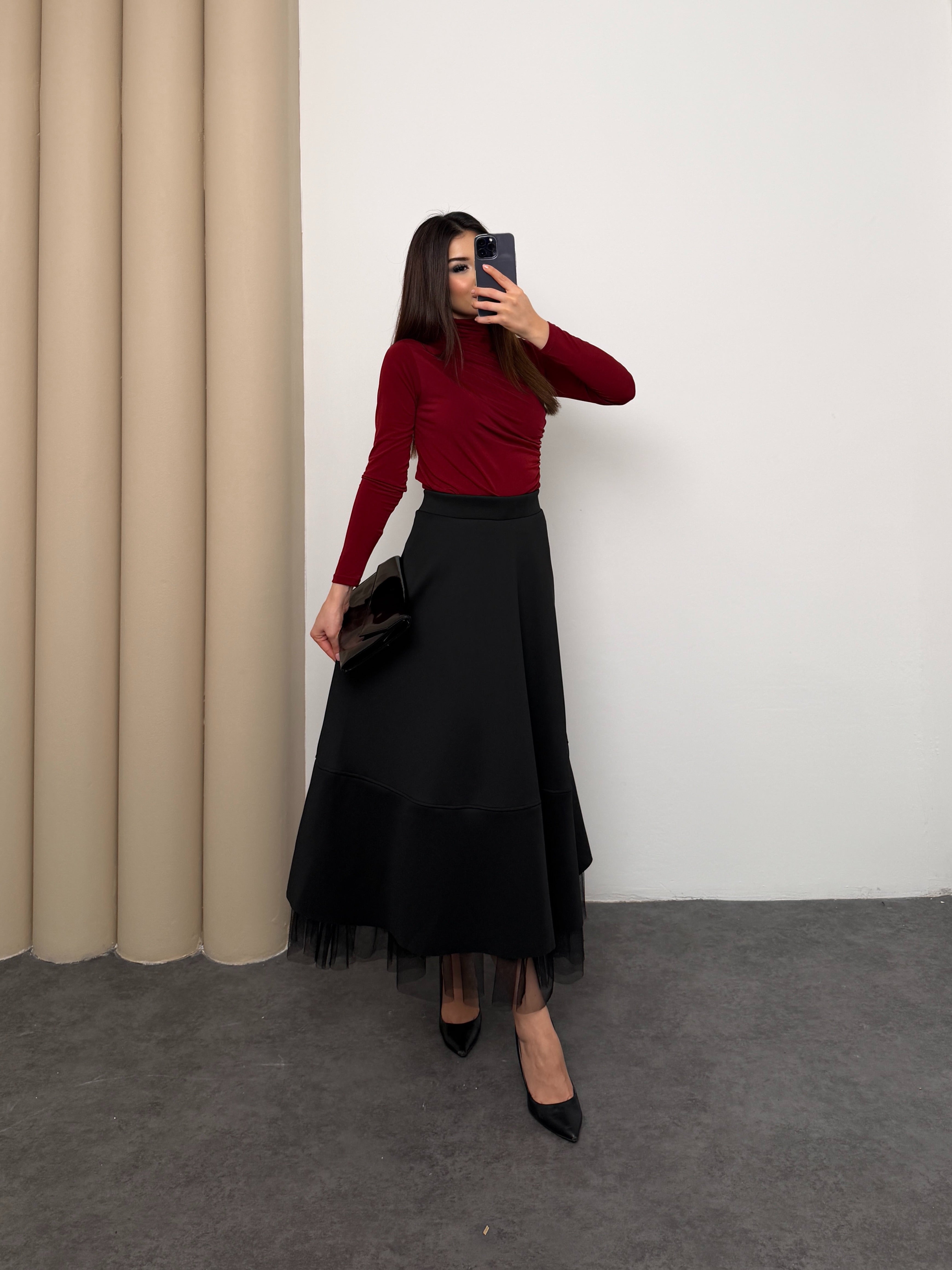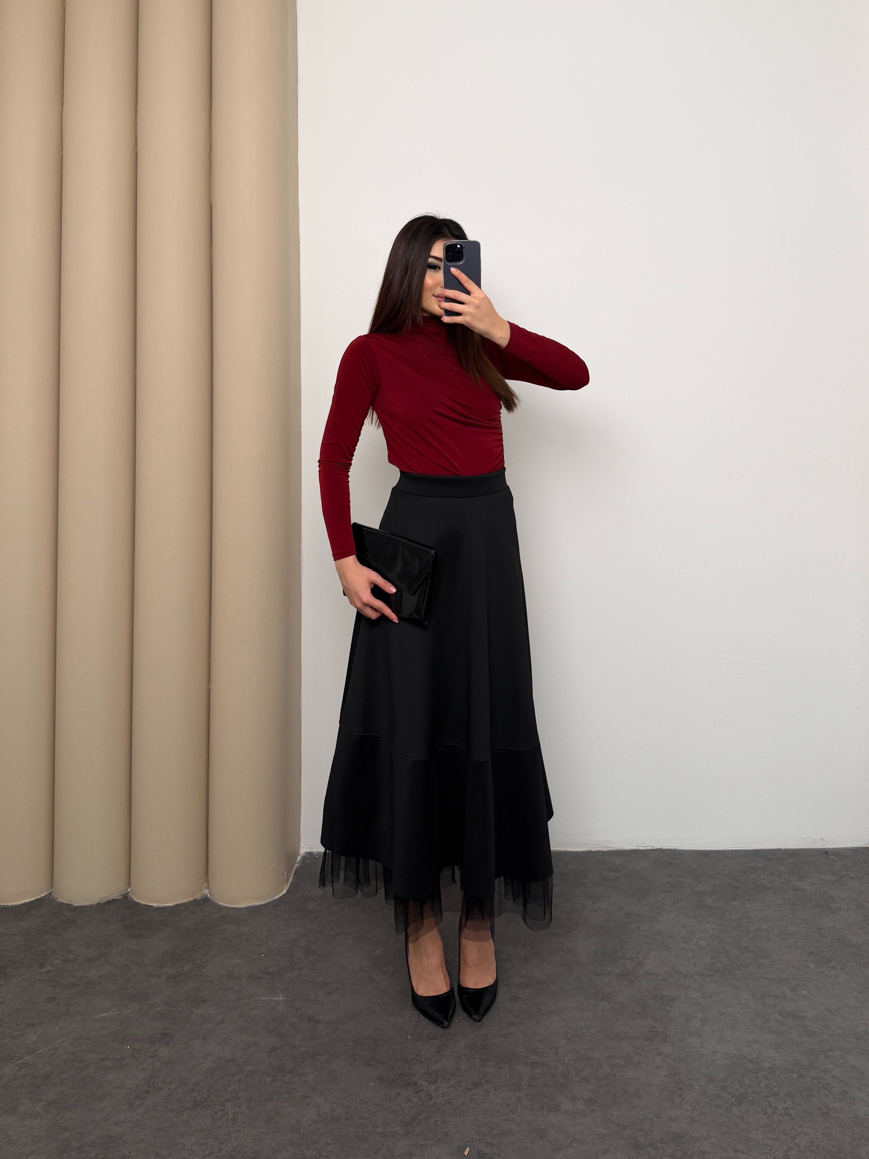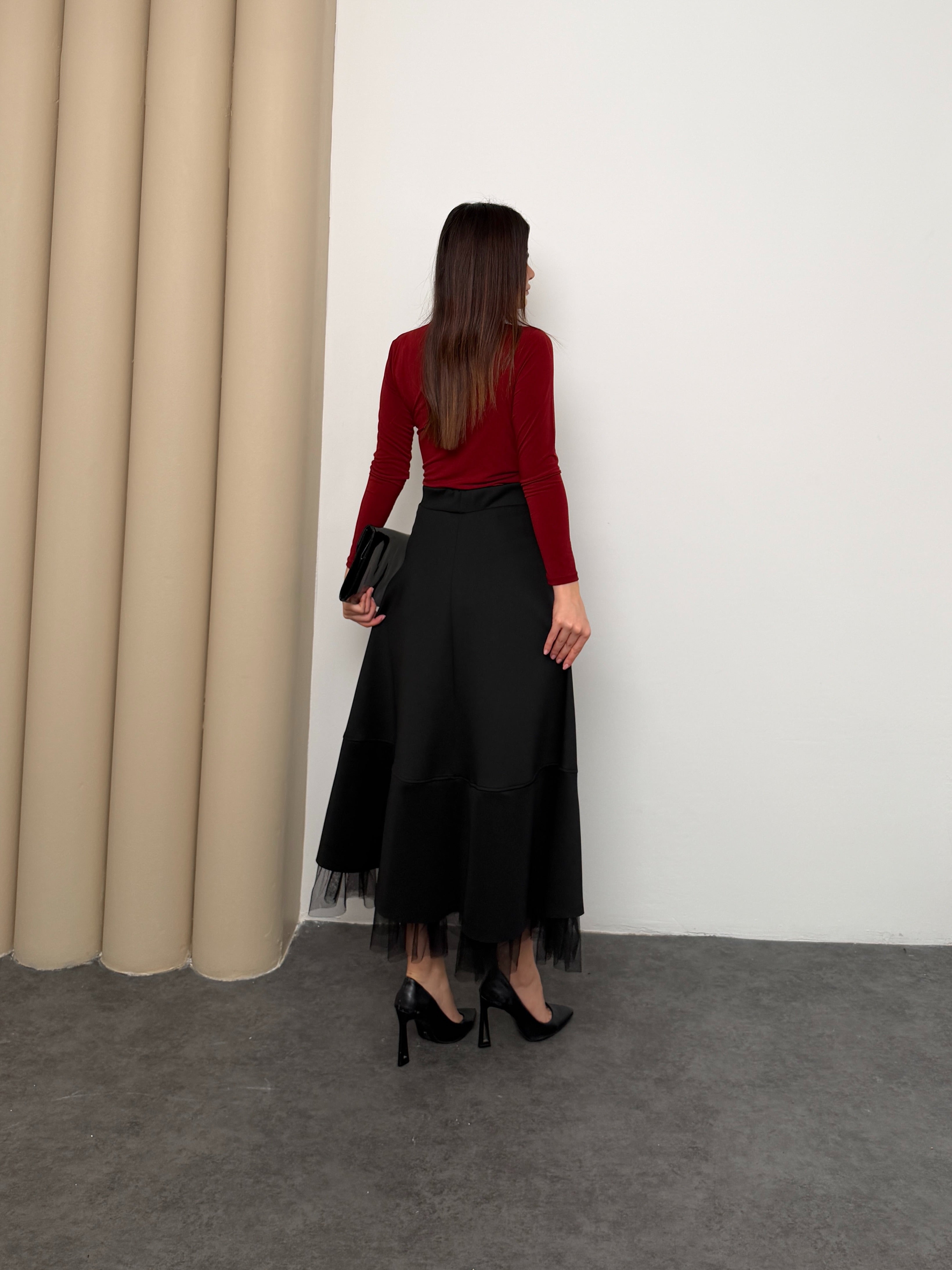 Zarafeti ve modern tasarımı bir arada sunan bu siyah etek, gardırobunuzun en asil parçalarından biri olacak. ✨ Yüksek bel kesimi ve aşağıya doğru genişleyen kloş formuyla her adımda şıklık sunarken, alt kısmındaki tül detayıyla stilinize sofistike bir dokunuş katar. Ofis kombinlerinden özel davetlere kadar geniş bir kullanım alanına sahiptir. 🤍