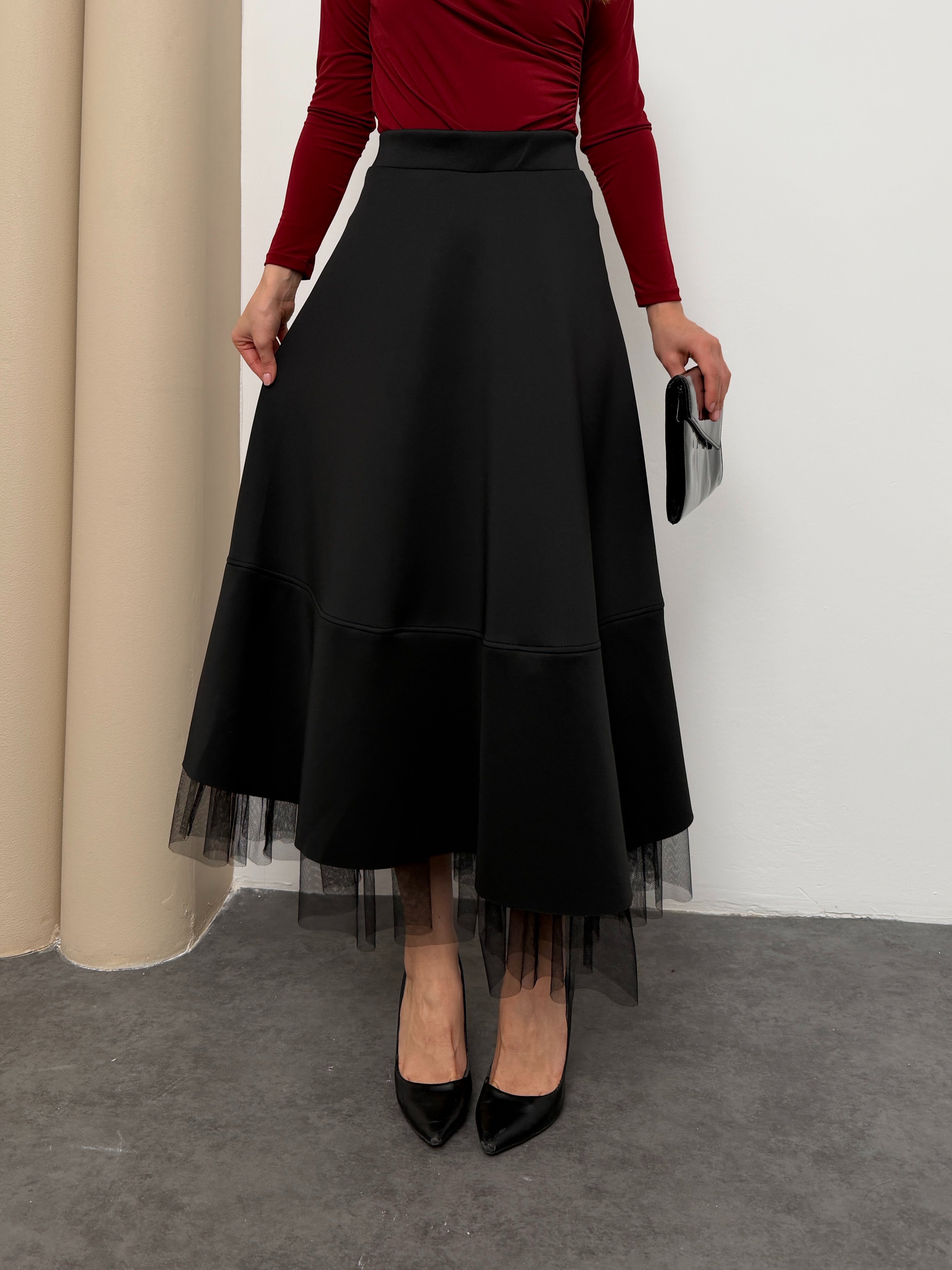 Kadın Tül Detaylı Beli Lastikli Kloş Uzun Etek 5281 - Siyah