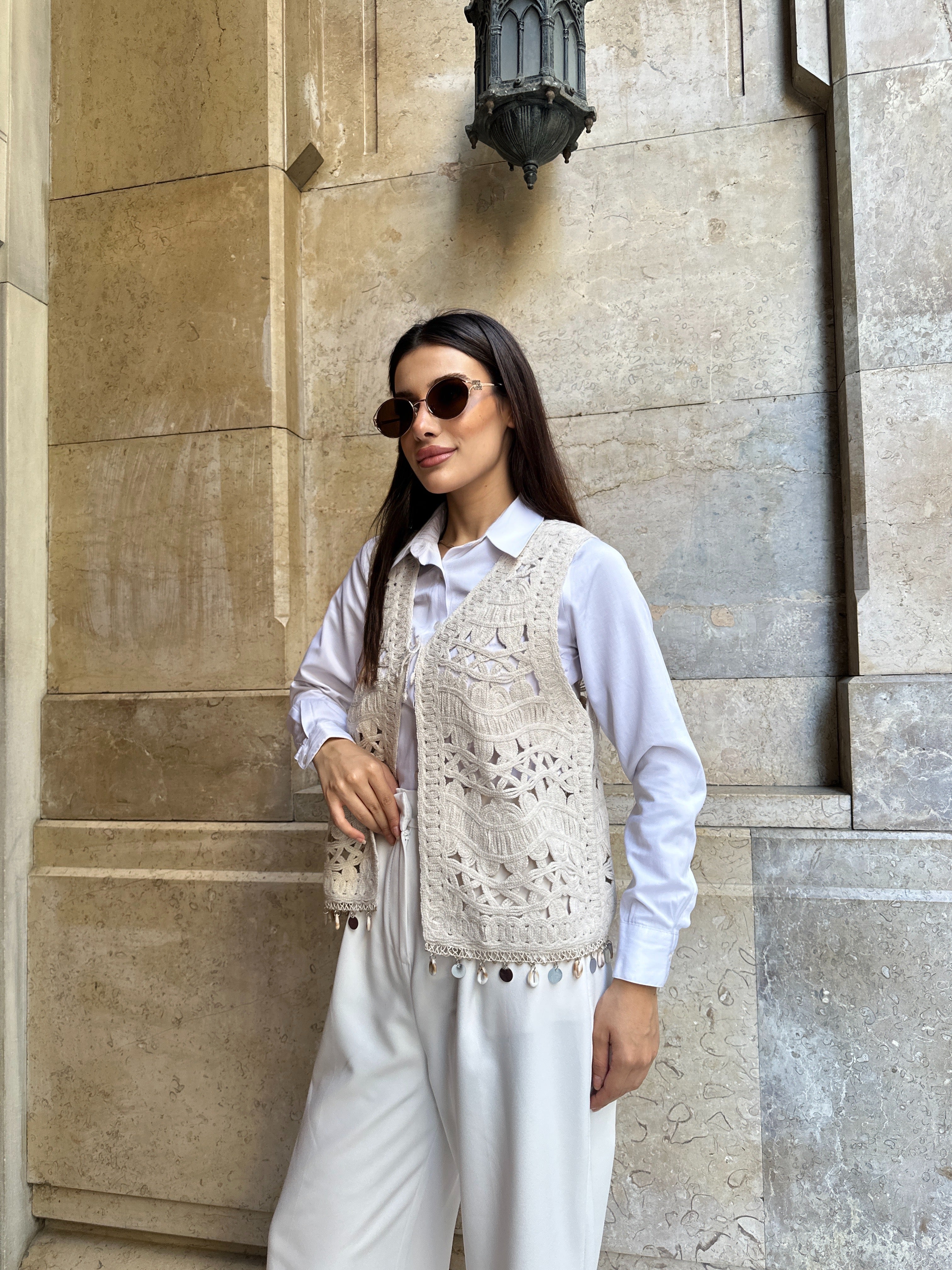 Önü açık olan bu yelek, tek bir büyük düğme veya toka detayıyla kapanır. Yeleğin alt kısmındaki yer alan küçük deniz kabukları ve püsküller, her hareketinizde ritmik bir şıklık sunarak tasarıma otantik bir hava katar.