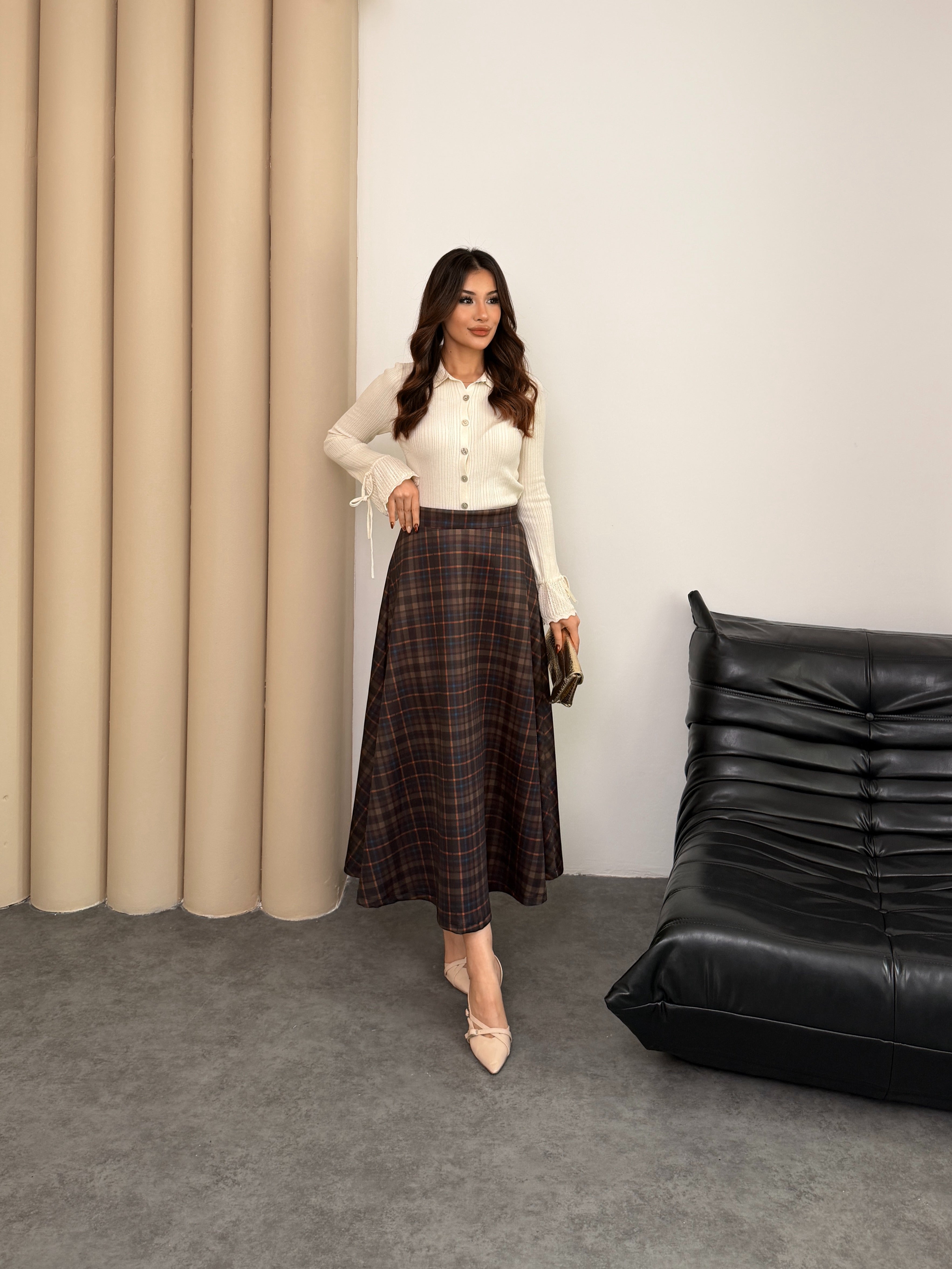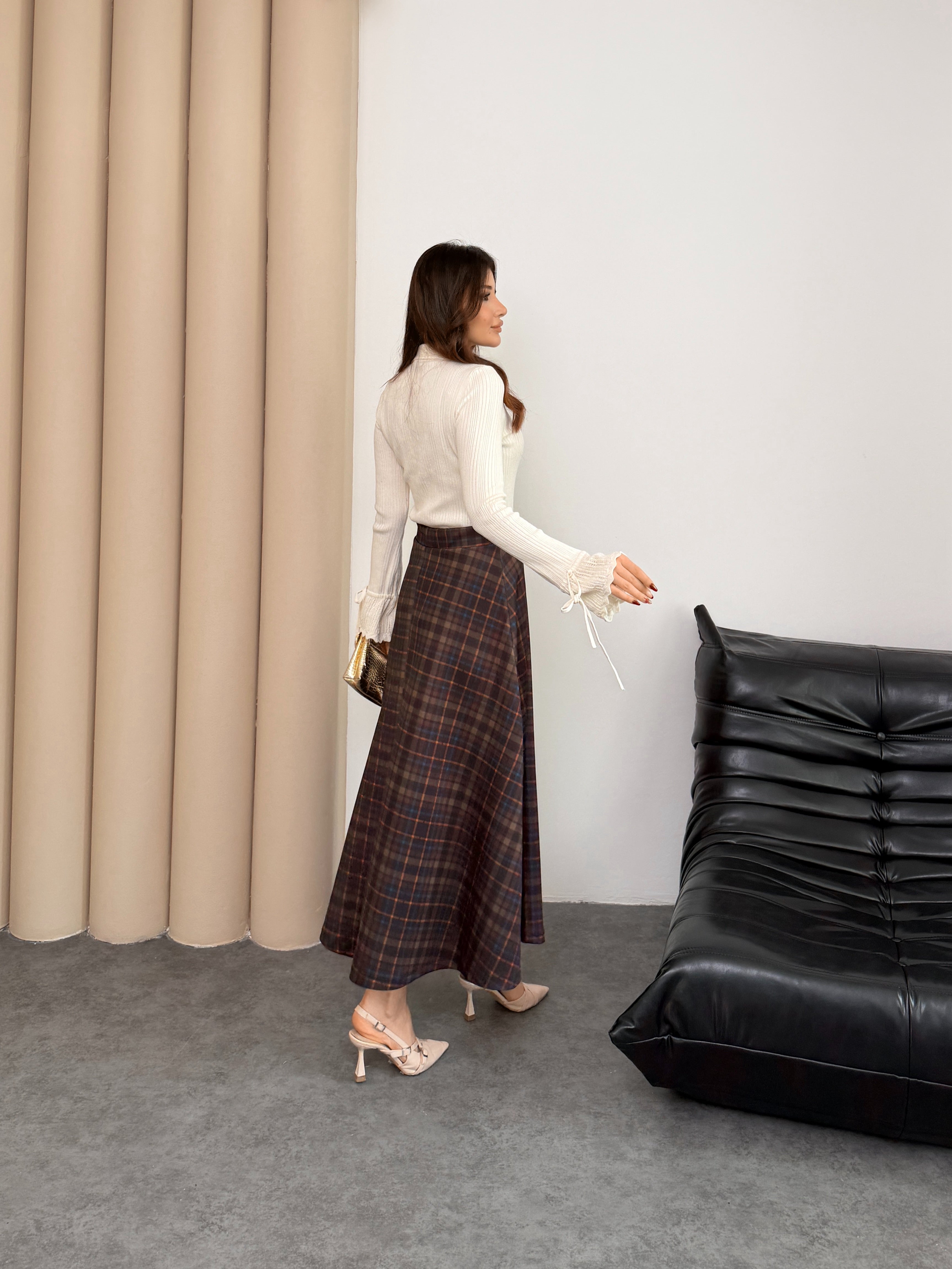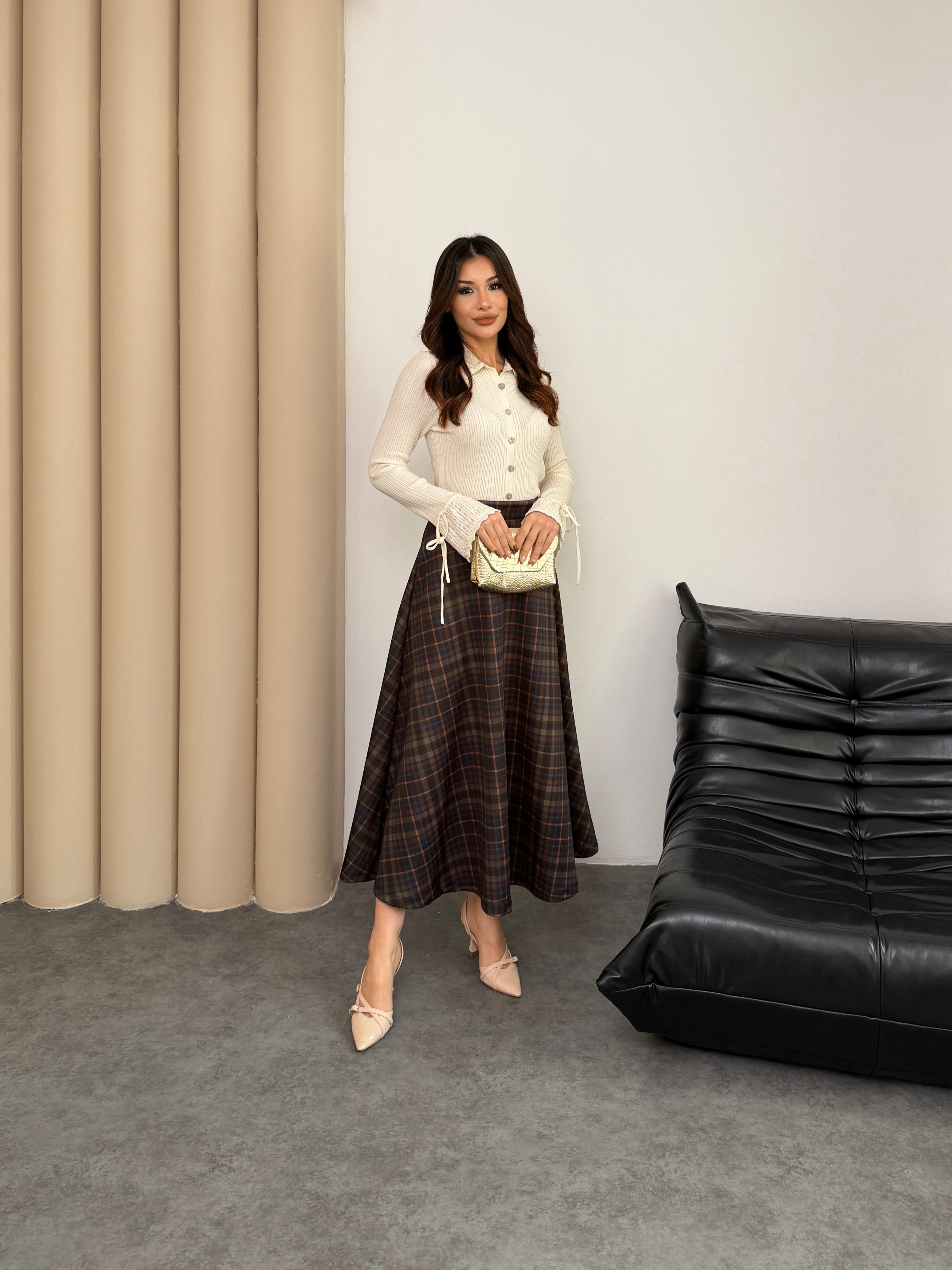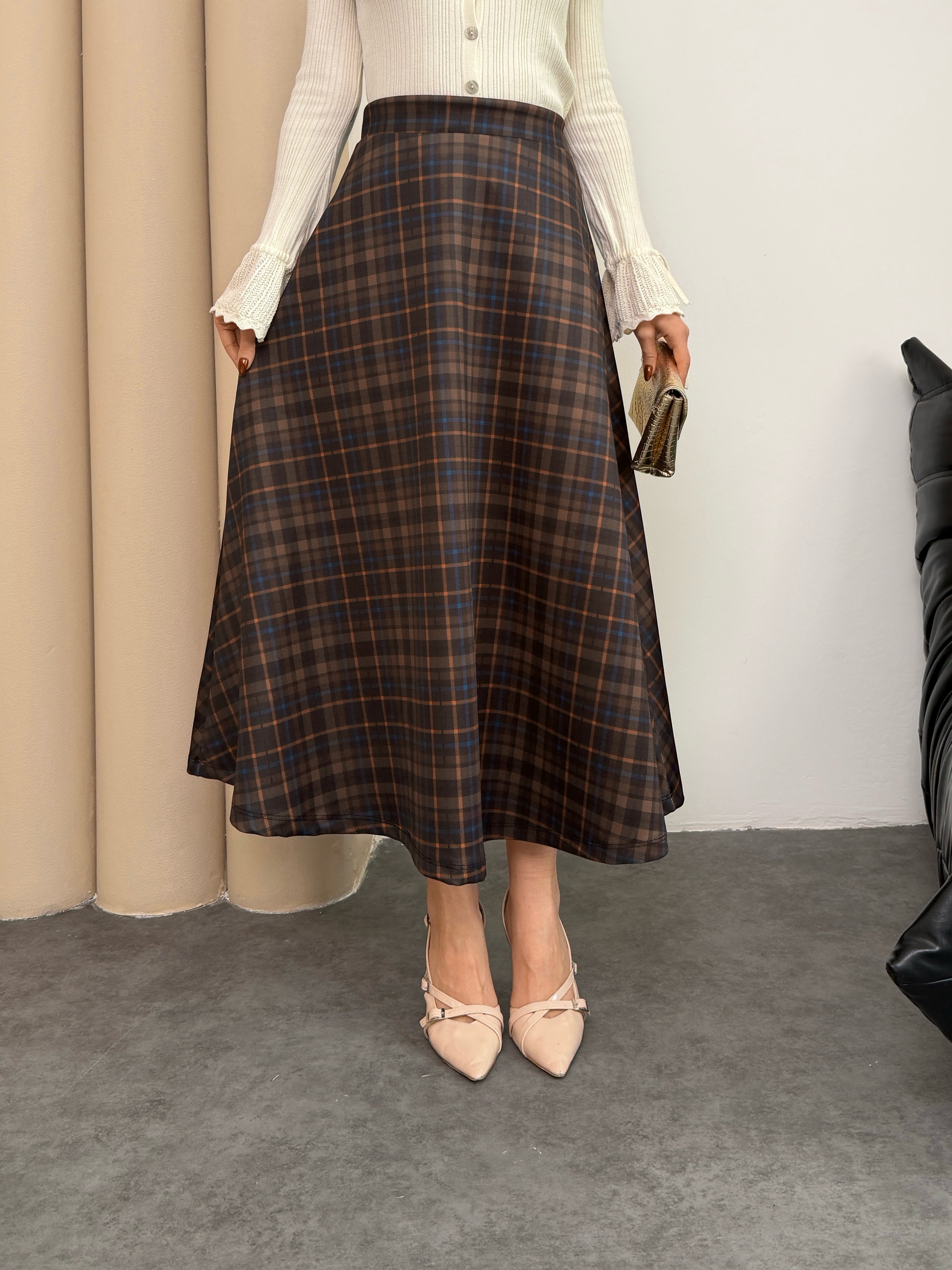 Scuba Kumaş Ekose Desen Etek 8961 - Kahve-Mavi