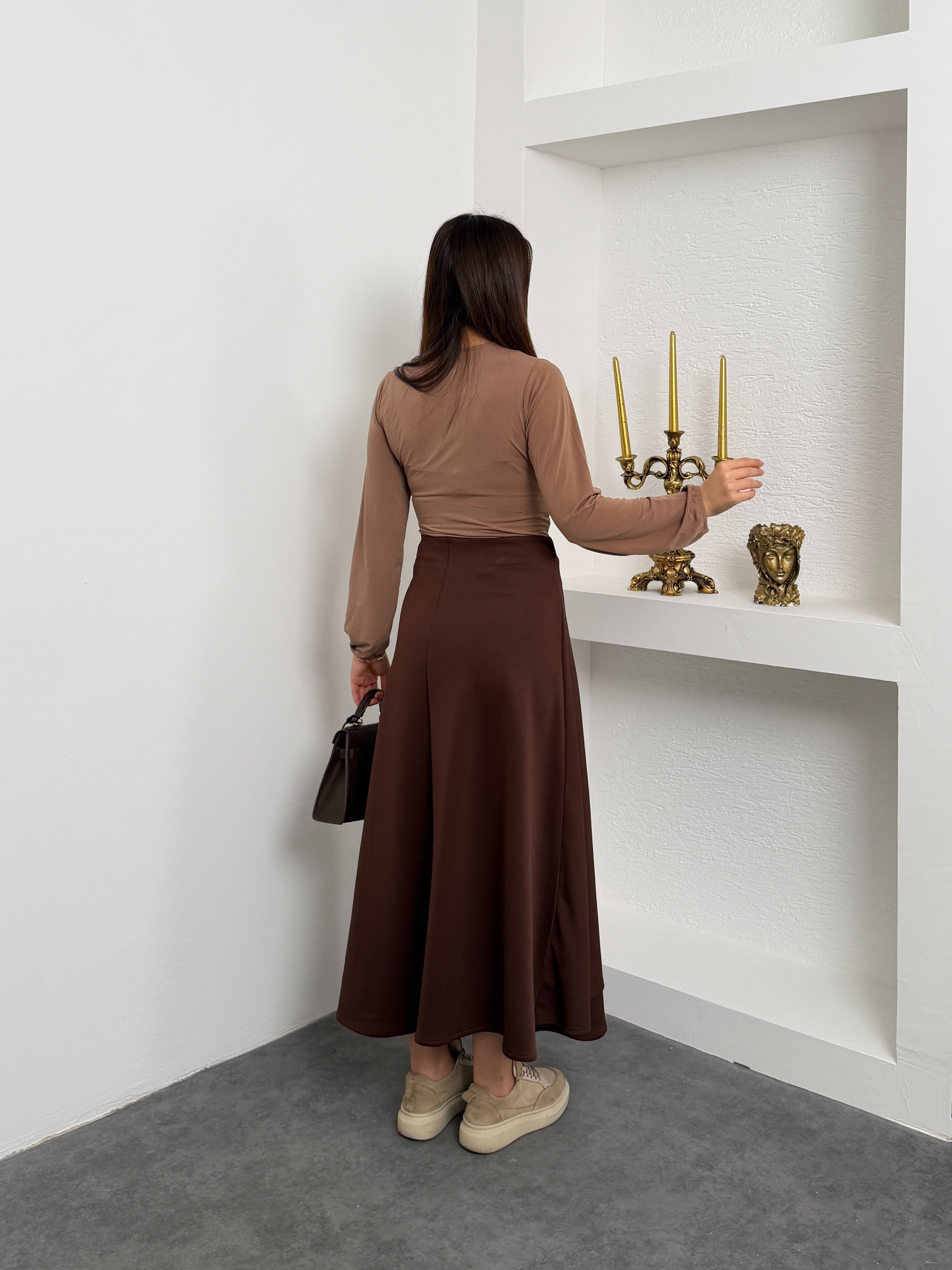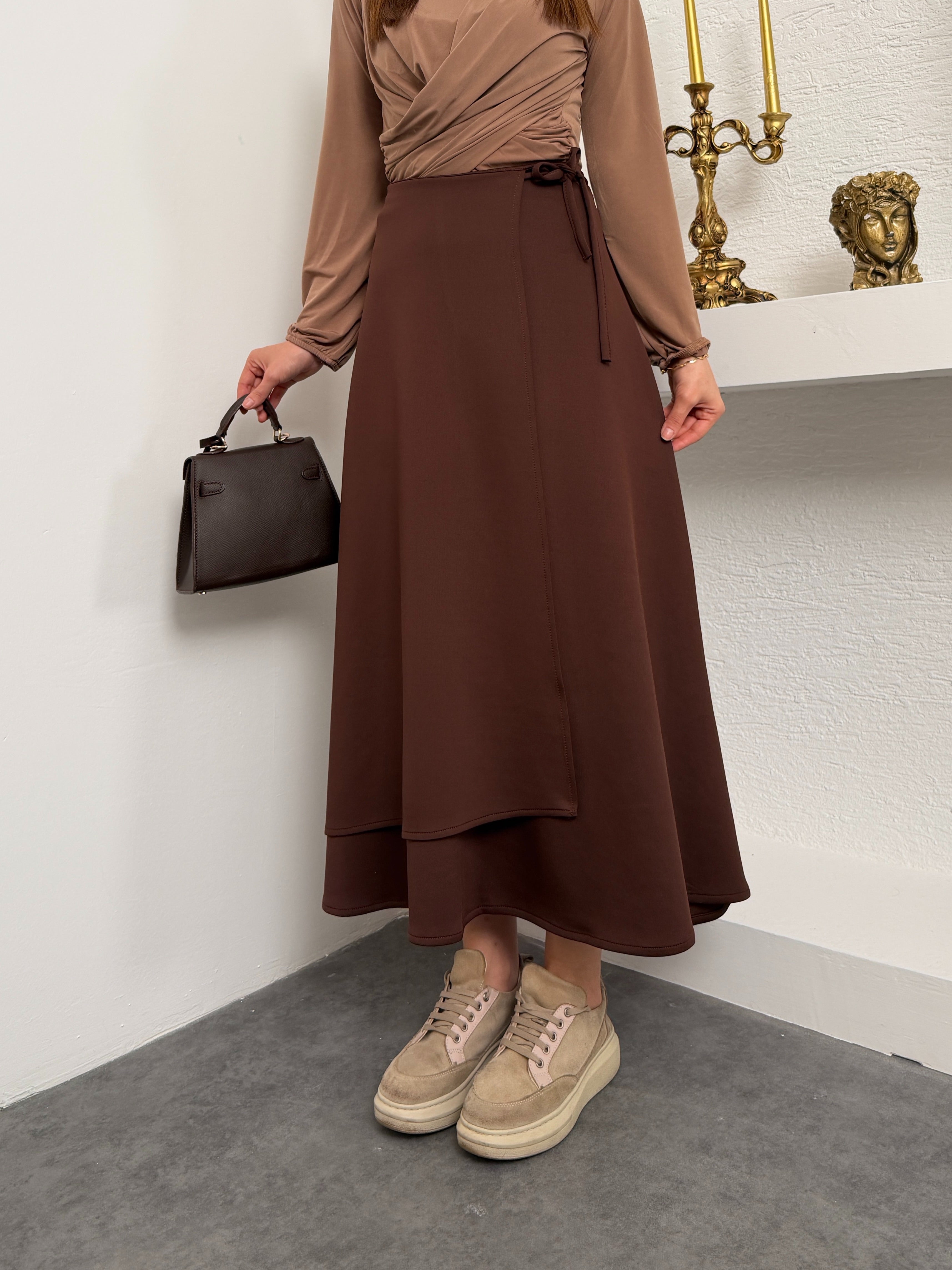 Yandan Bağlamalı Katlı Scuba Etek 8958 - Kahverengi