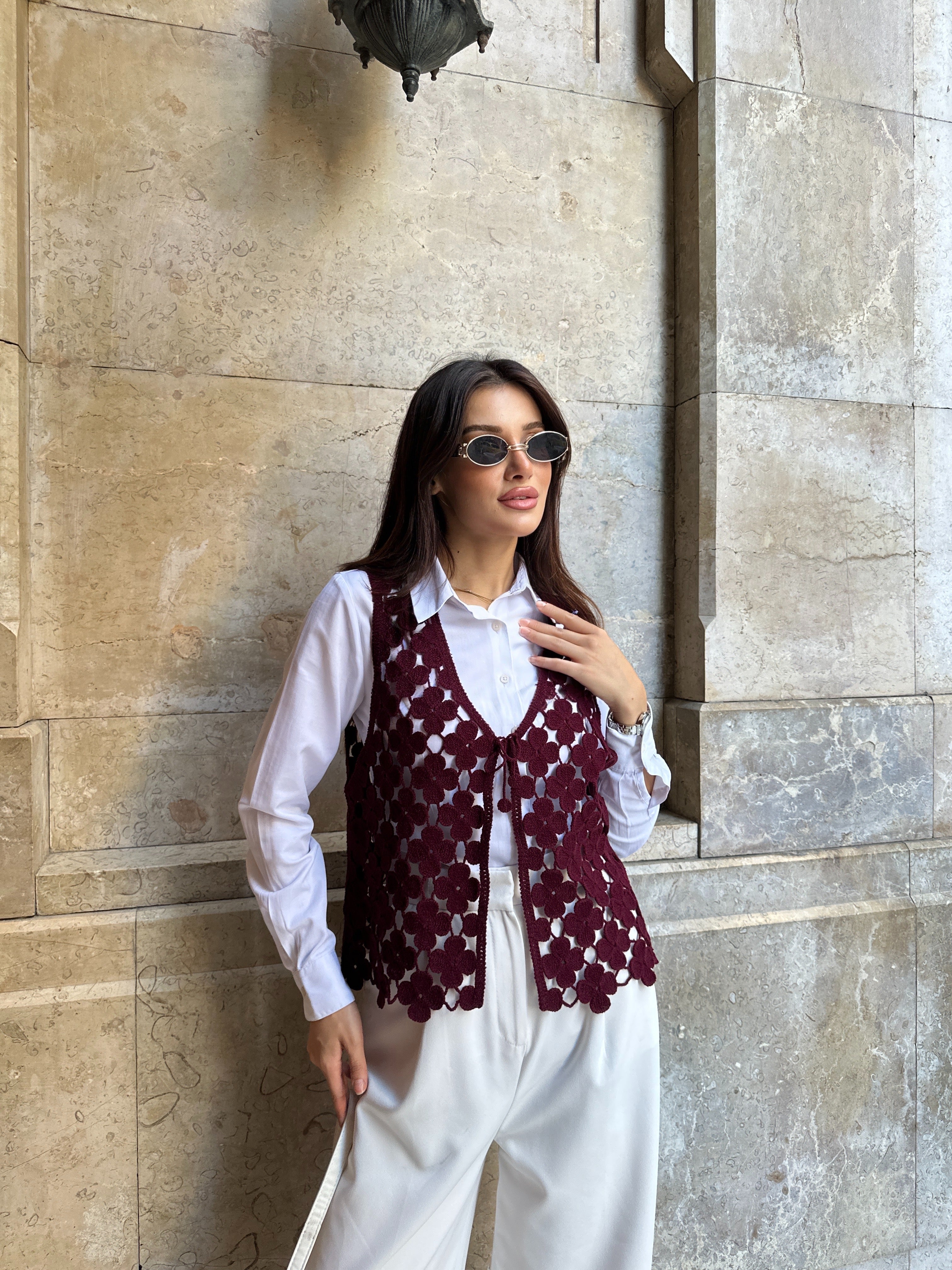 HatunAtila Çiçek Desenli Akrilik Süzene Yelek 5196 - Bordo