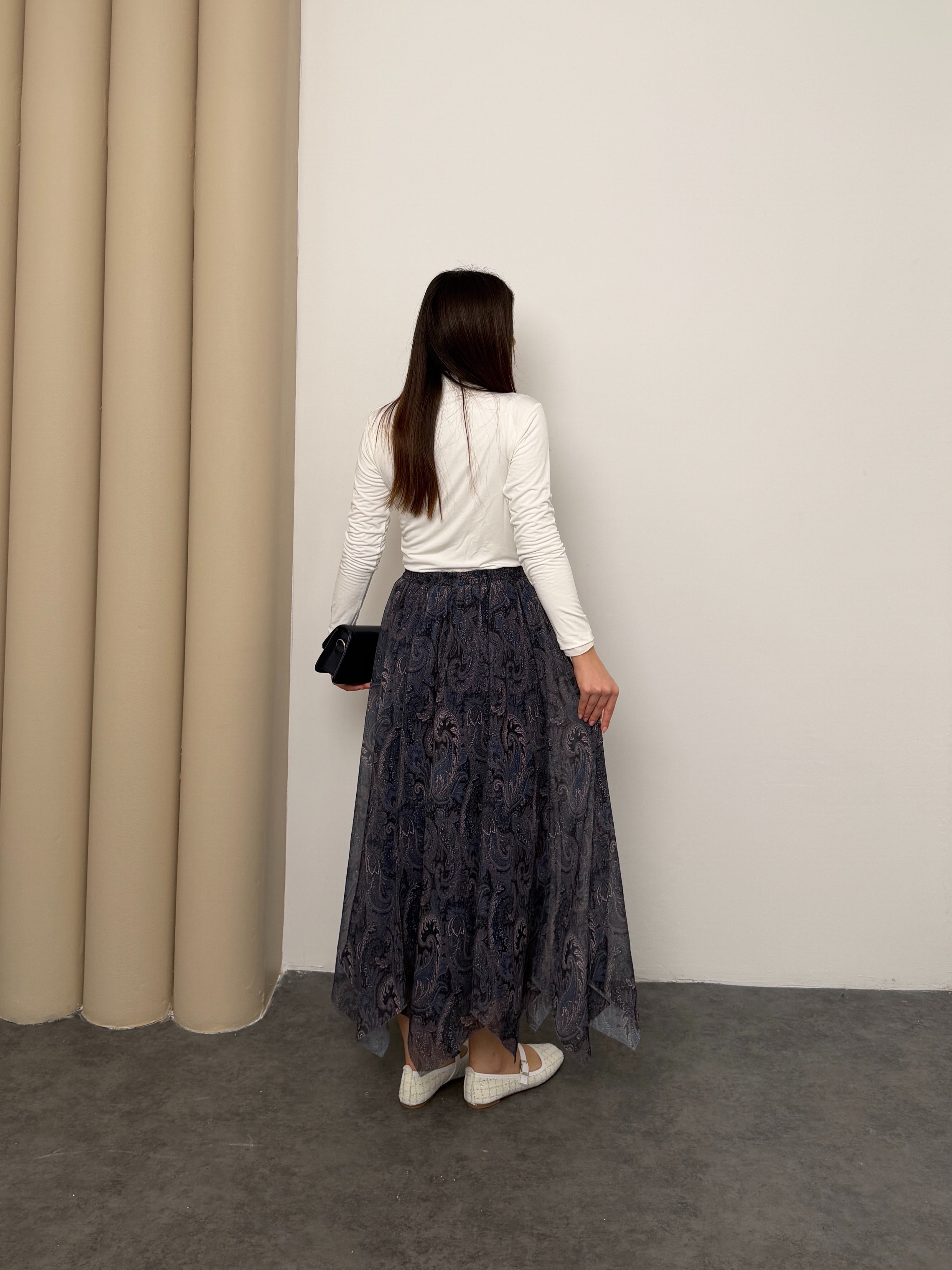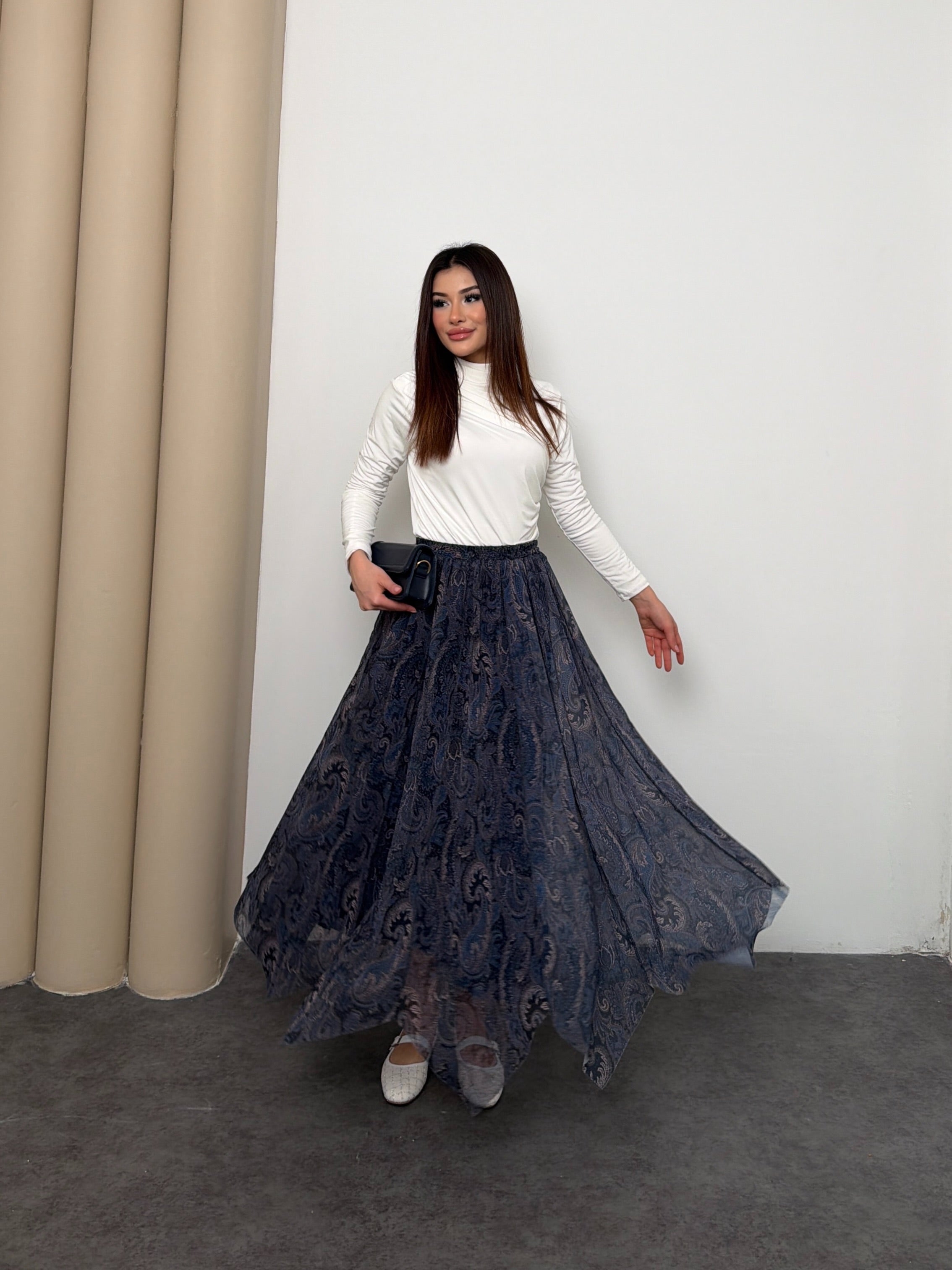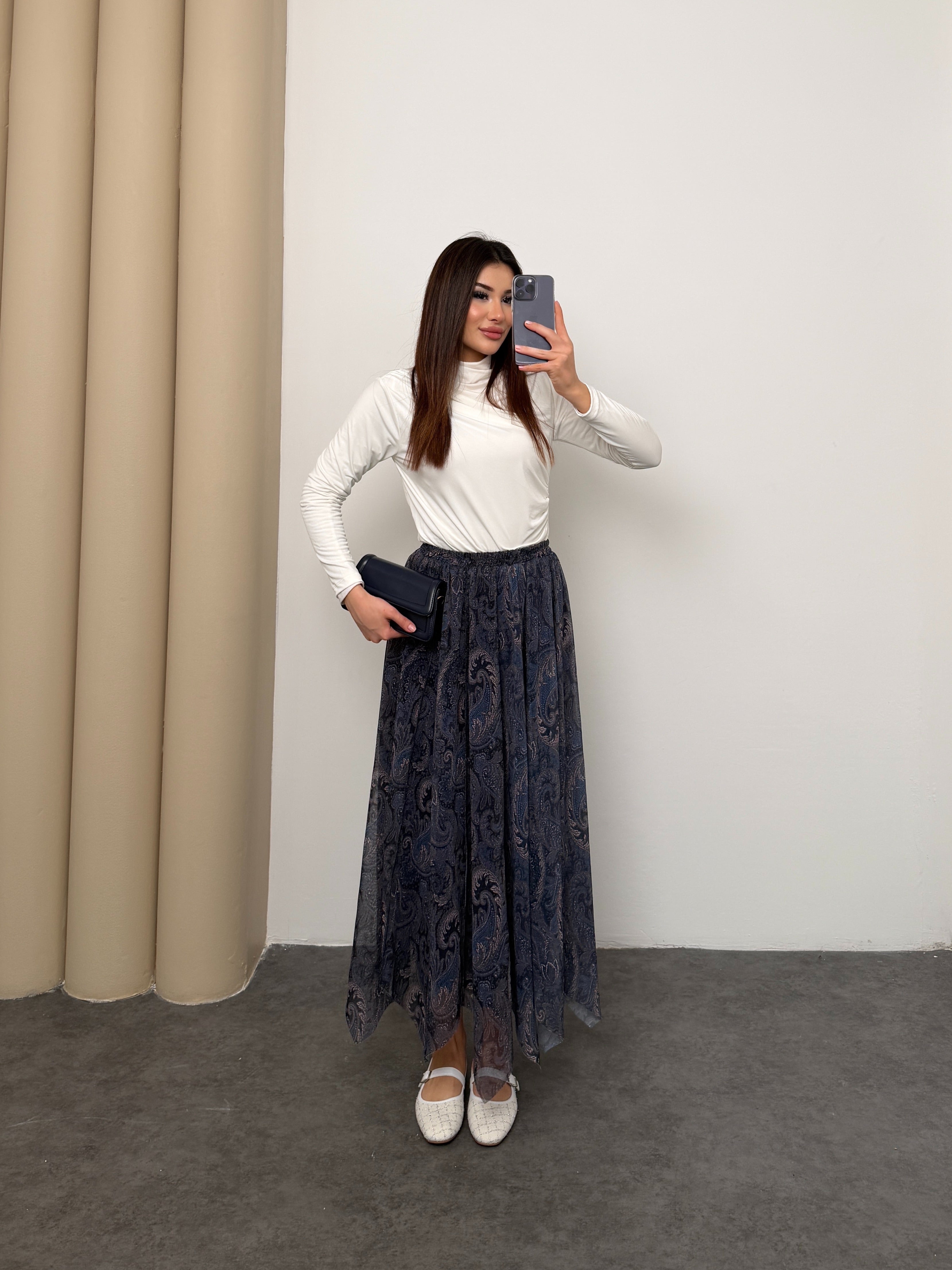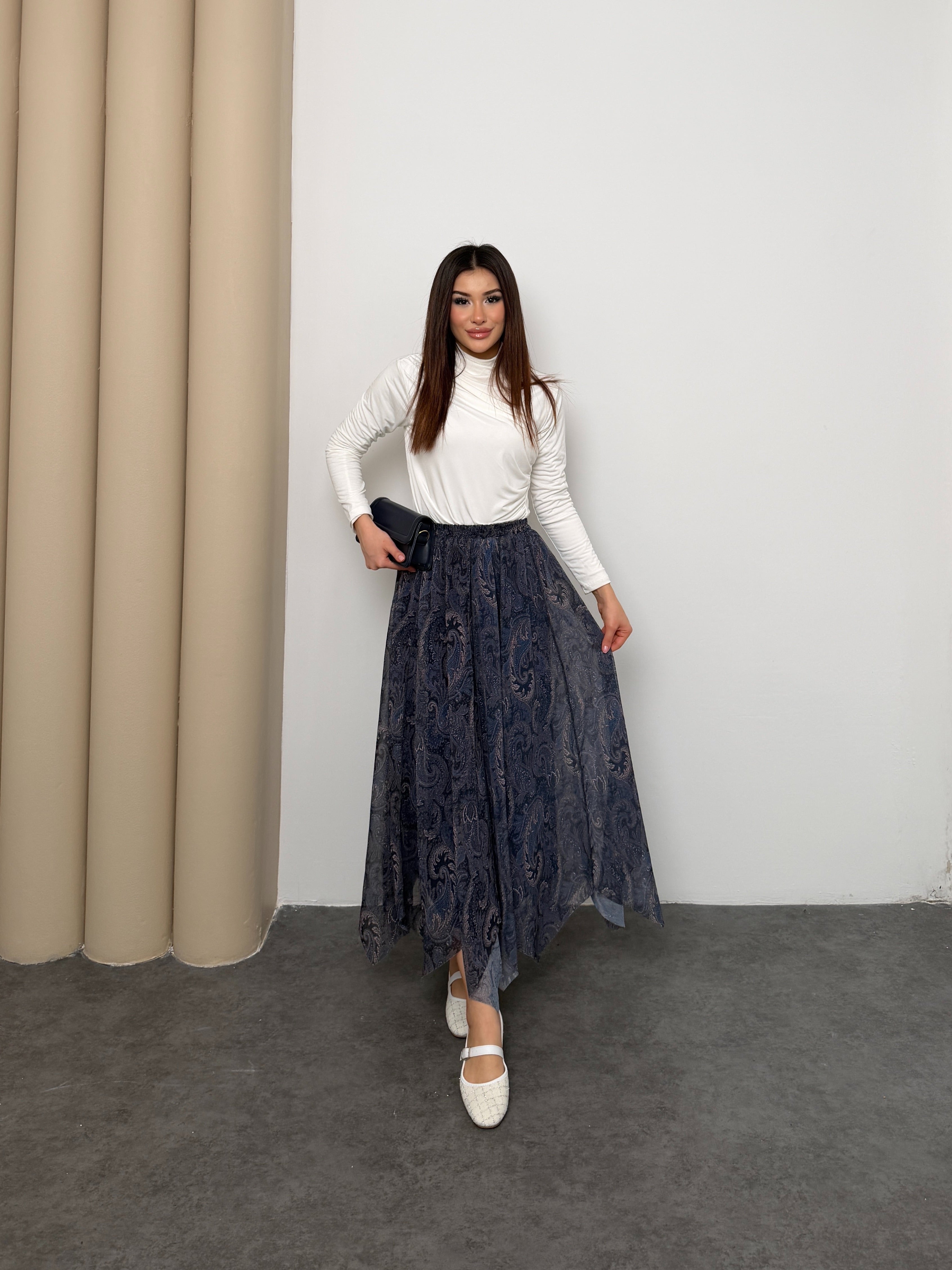 Kadın Şal Desenli Yüksek Bel Lastikli Şifon Maxi Boy Uzun Etek 5286 - Mavi