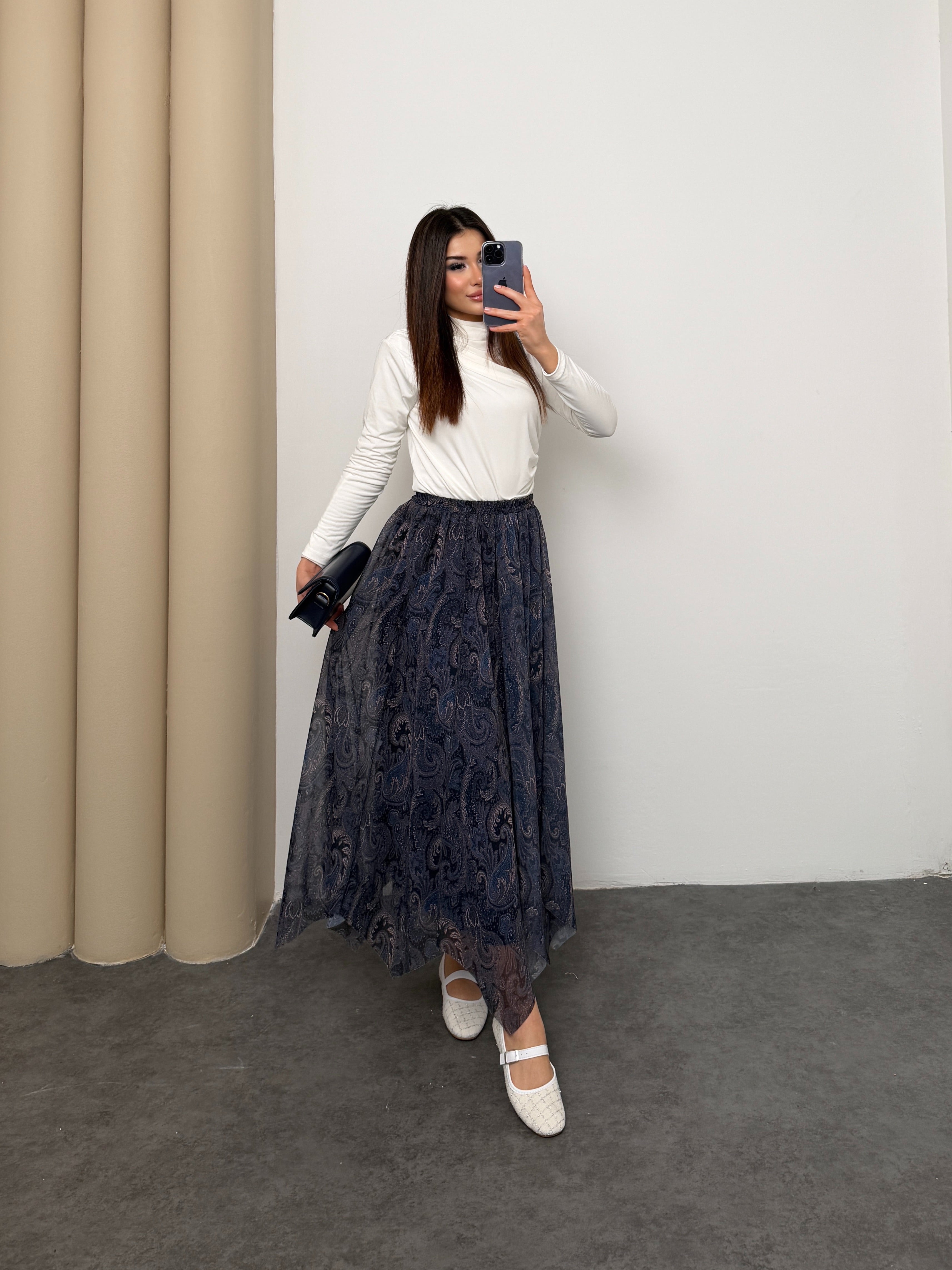 Gardırobunuza asil bir dokunuş katın! ✨ Zarif şal desenleri ve akışkan şifon dokusuyla öne çıkan bu yeşil etek, her mevsim stilinizin anahtar parçası olacak. Yüksek bel kesimi ve konforlu yapısıyla hem ofis şıklığında hem de özel davetlerde zahmetsiz bir zarafet sunar. 💫