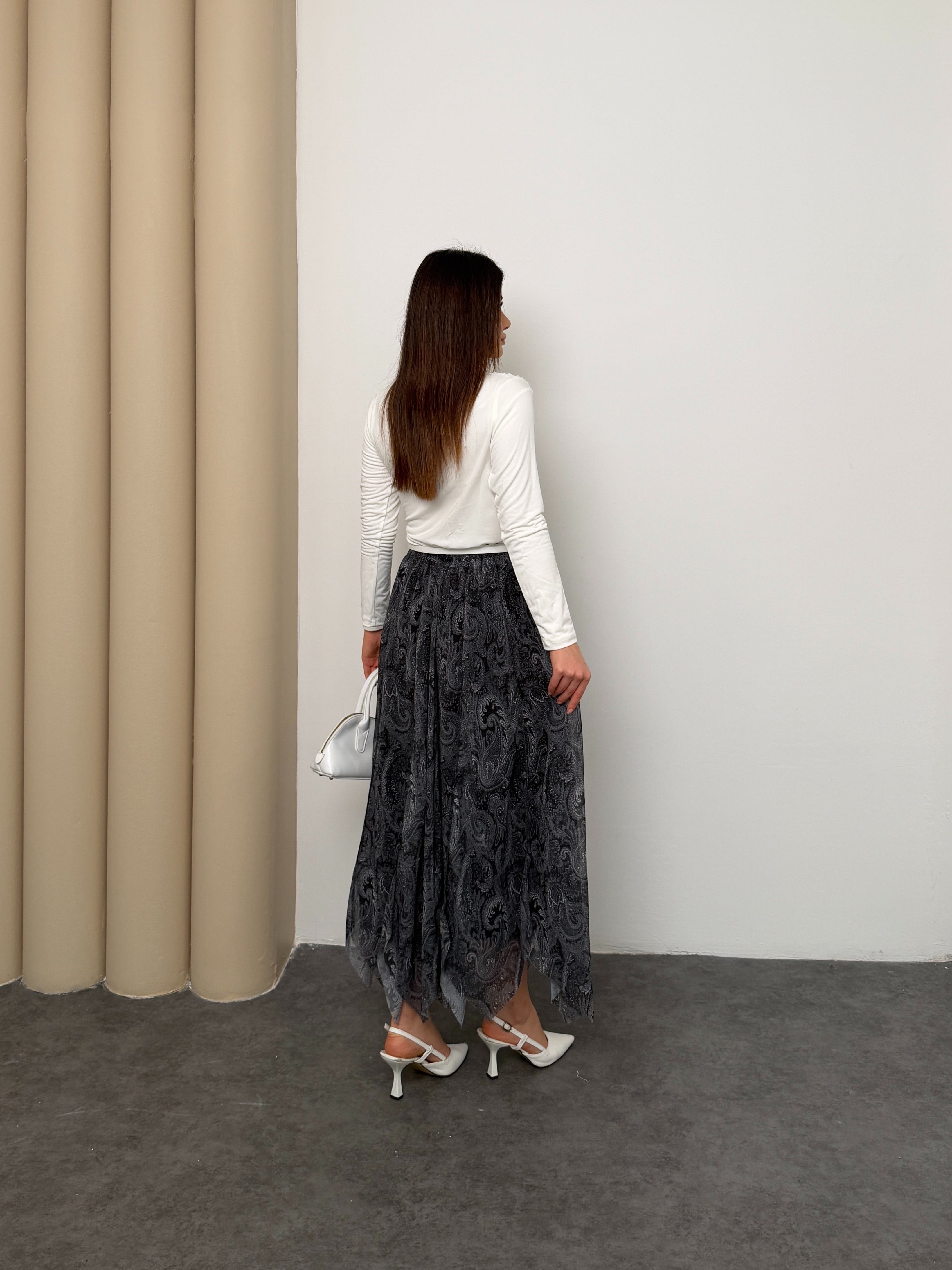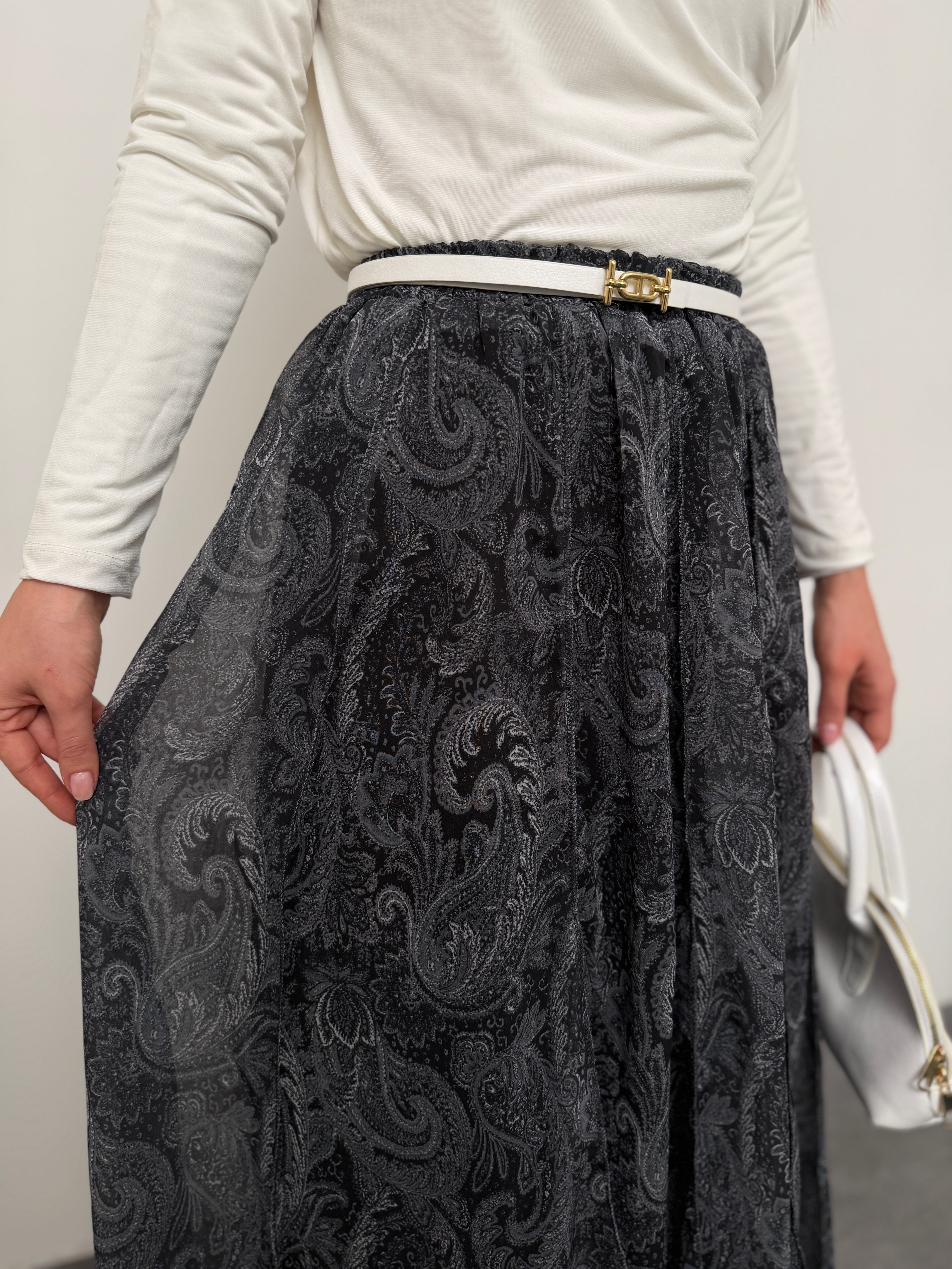 Kadın Şal Desenli Yüksek Bel Lastikli Şifon Maxi Boy Uzun Etek 5286 - Siyah