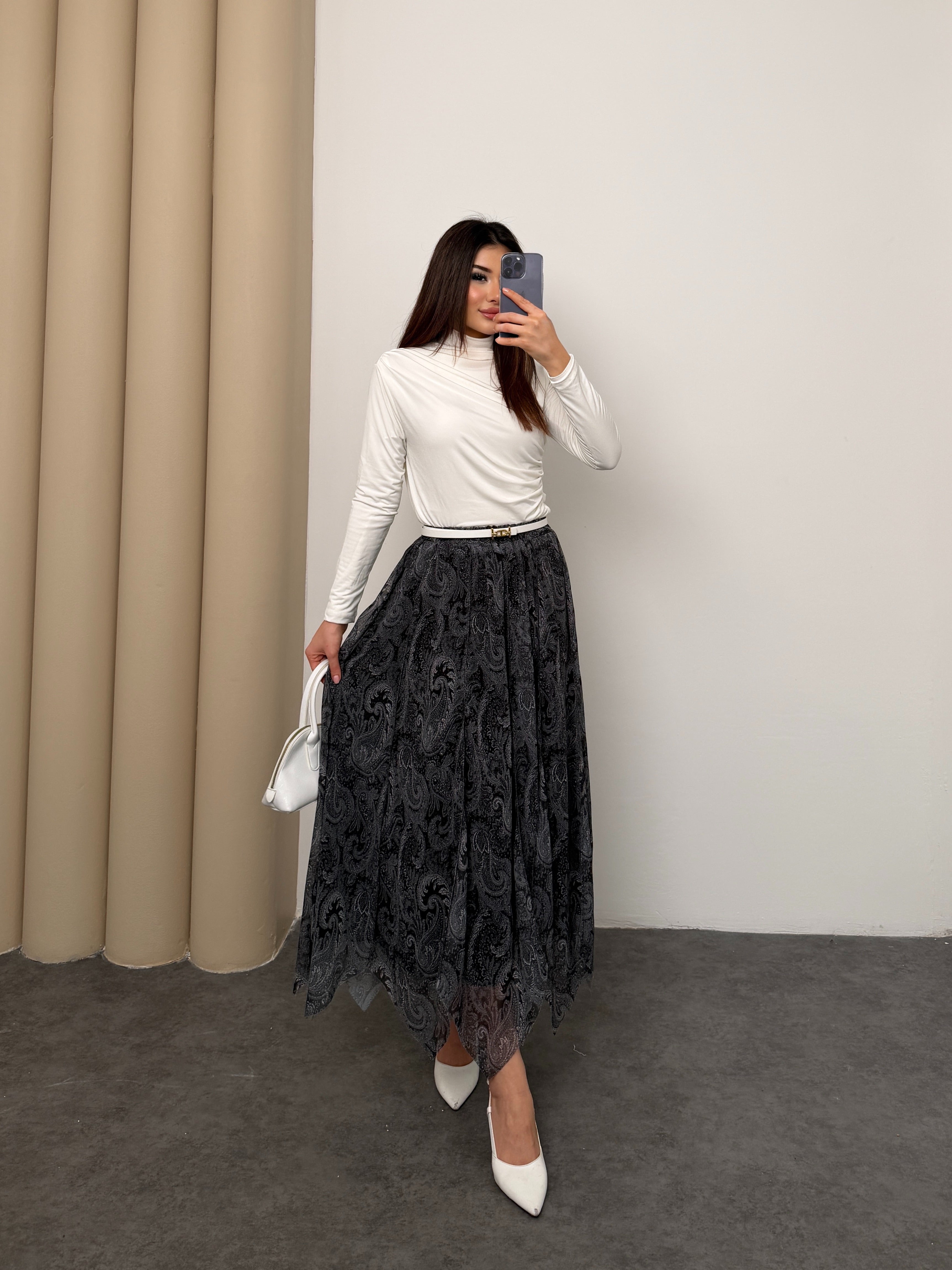 Gardırobunuza asil bir dokunuş katın! ✨ Zarif şal desenleri ve akışkan şifon dokusuyla öne çıkan bu yeşil etek, her mevsim stilinizin anahtar parçası olacak. Yüksek bel kesimi ve konforlu yapısıyla hem ofis şıklığında hem de özel davetlerde zahmetsiz bir zarafet sunar. 💫