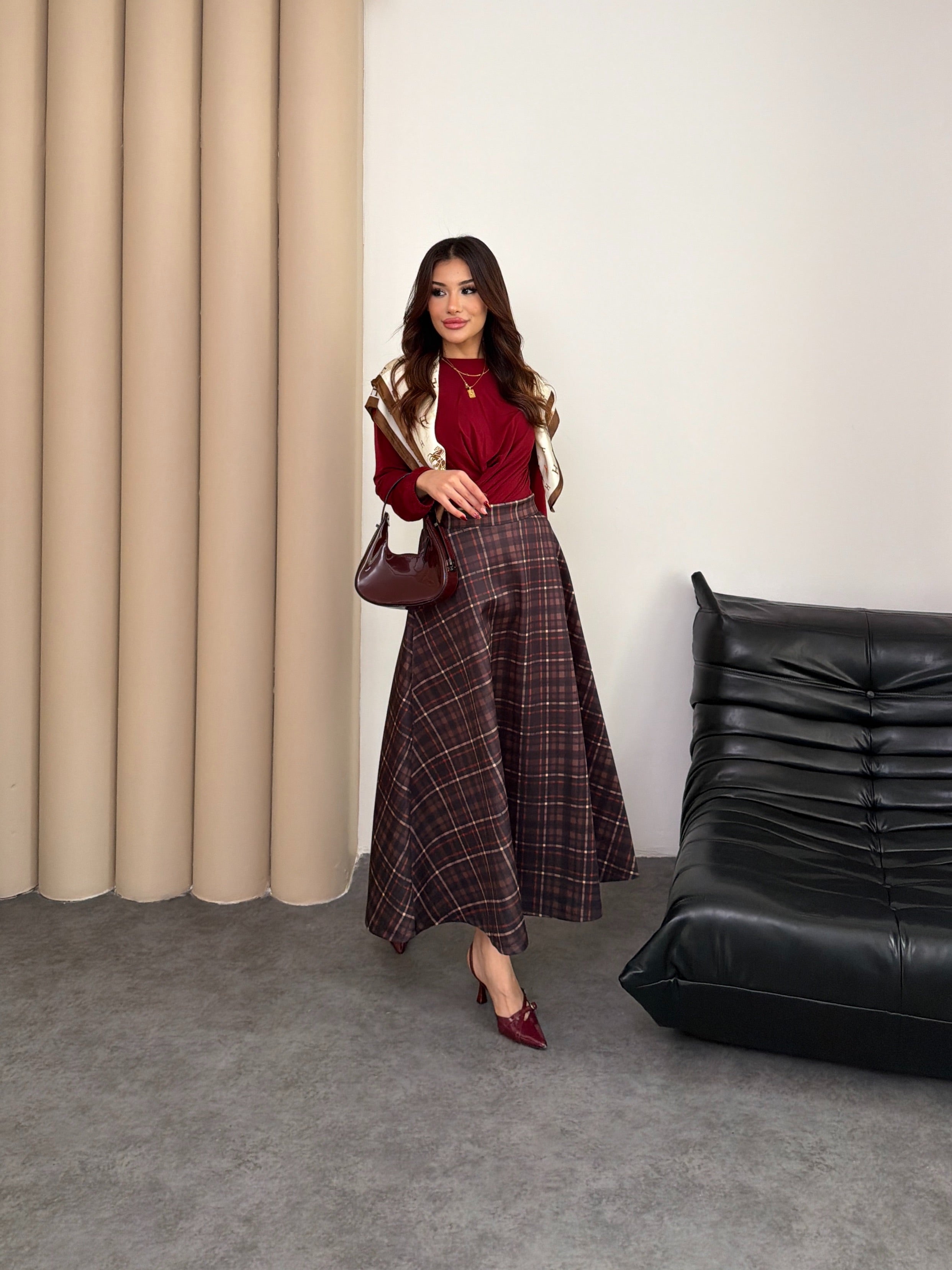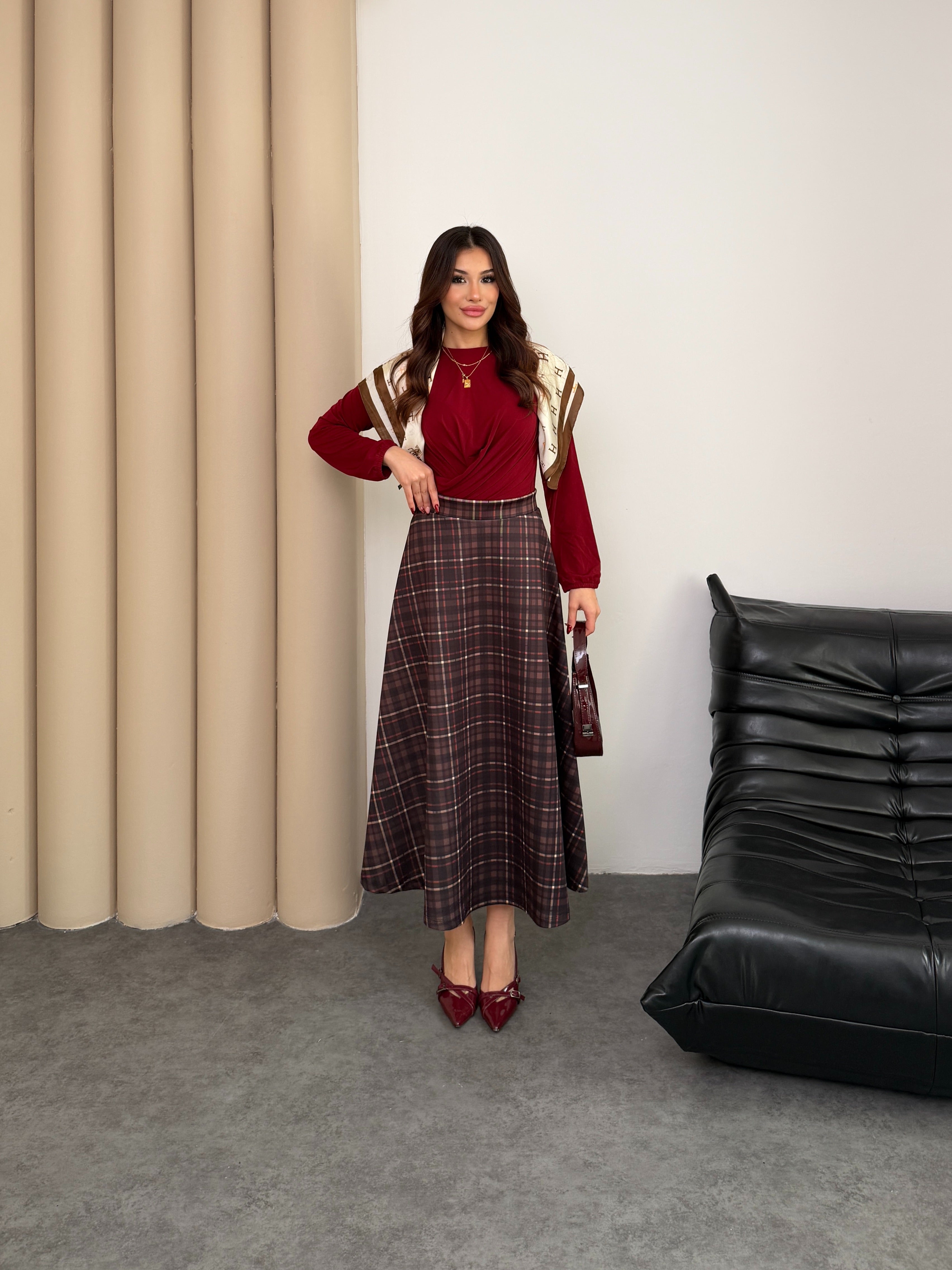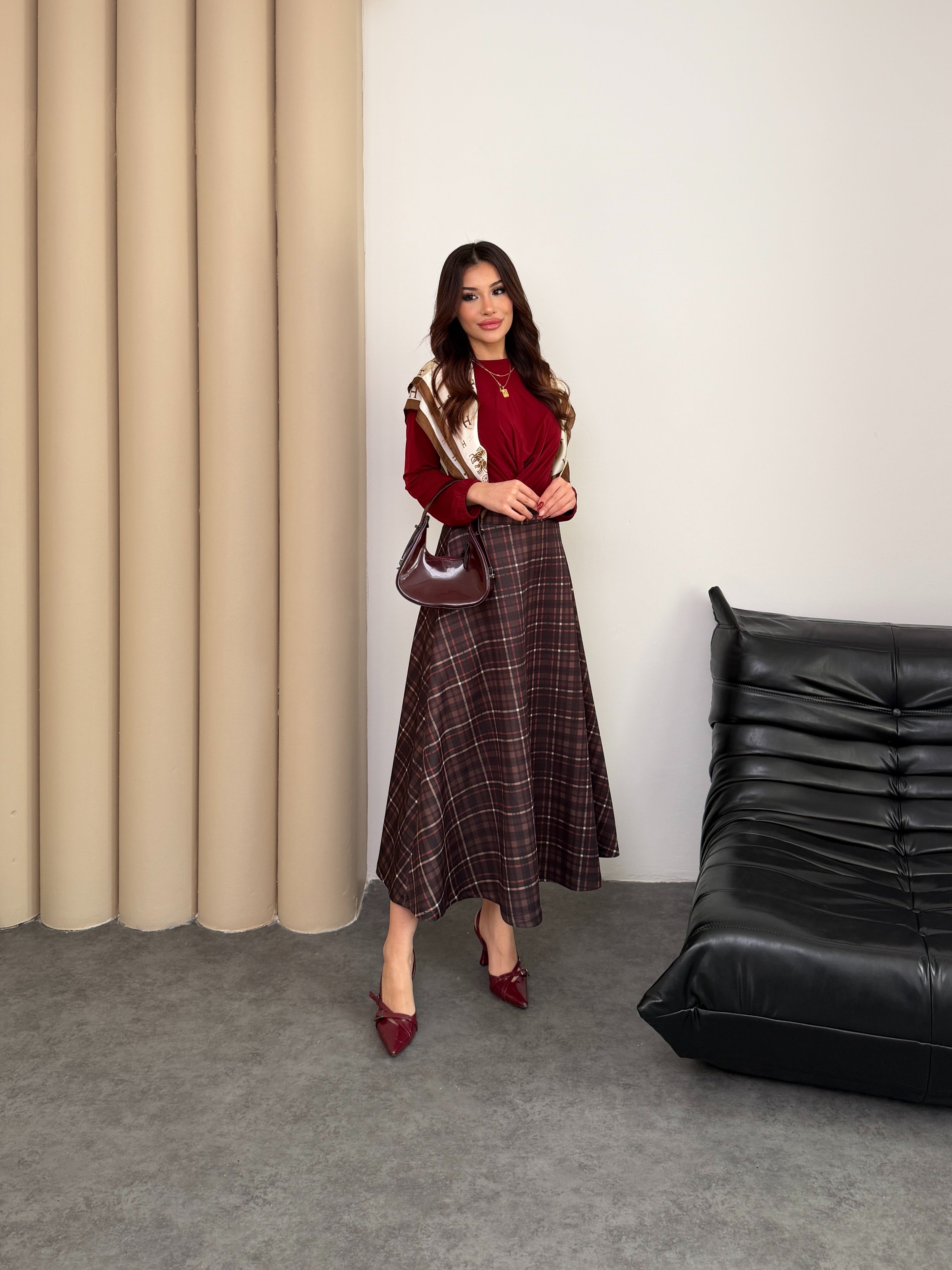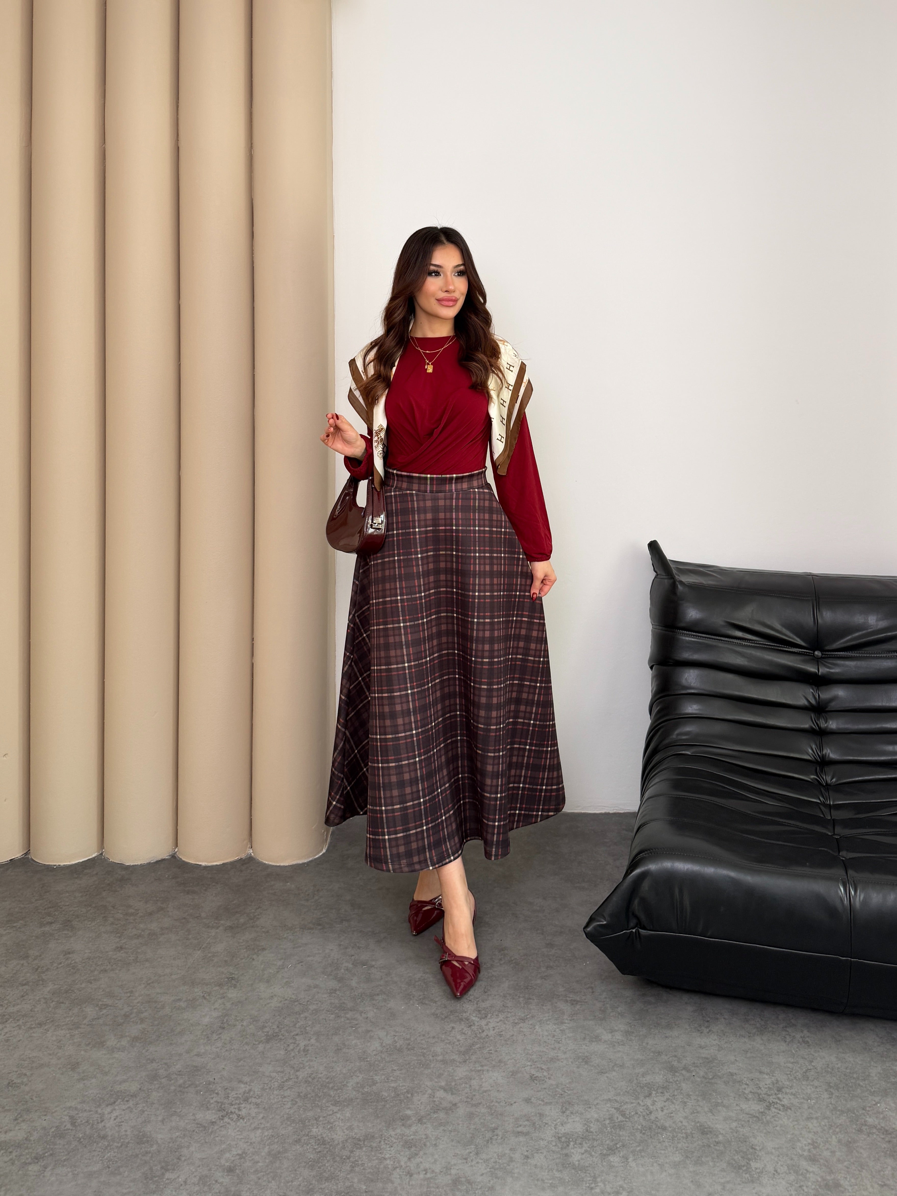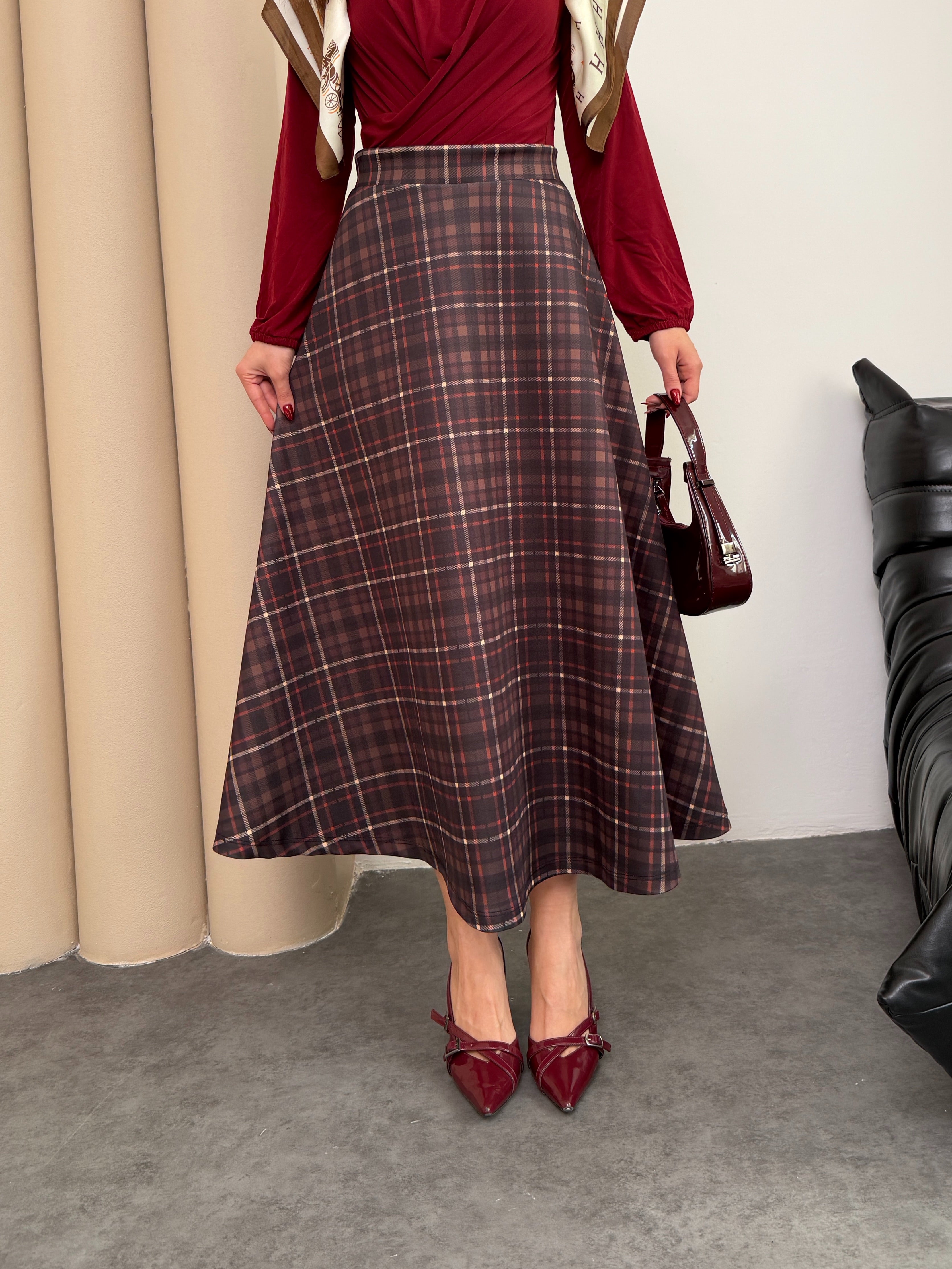 Scuba Kumaş Ekose Desen Etek 8961 - Kahve-Kiremit