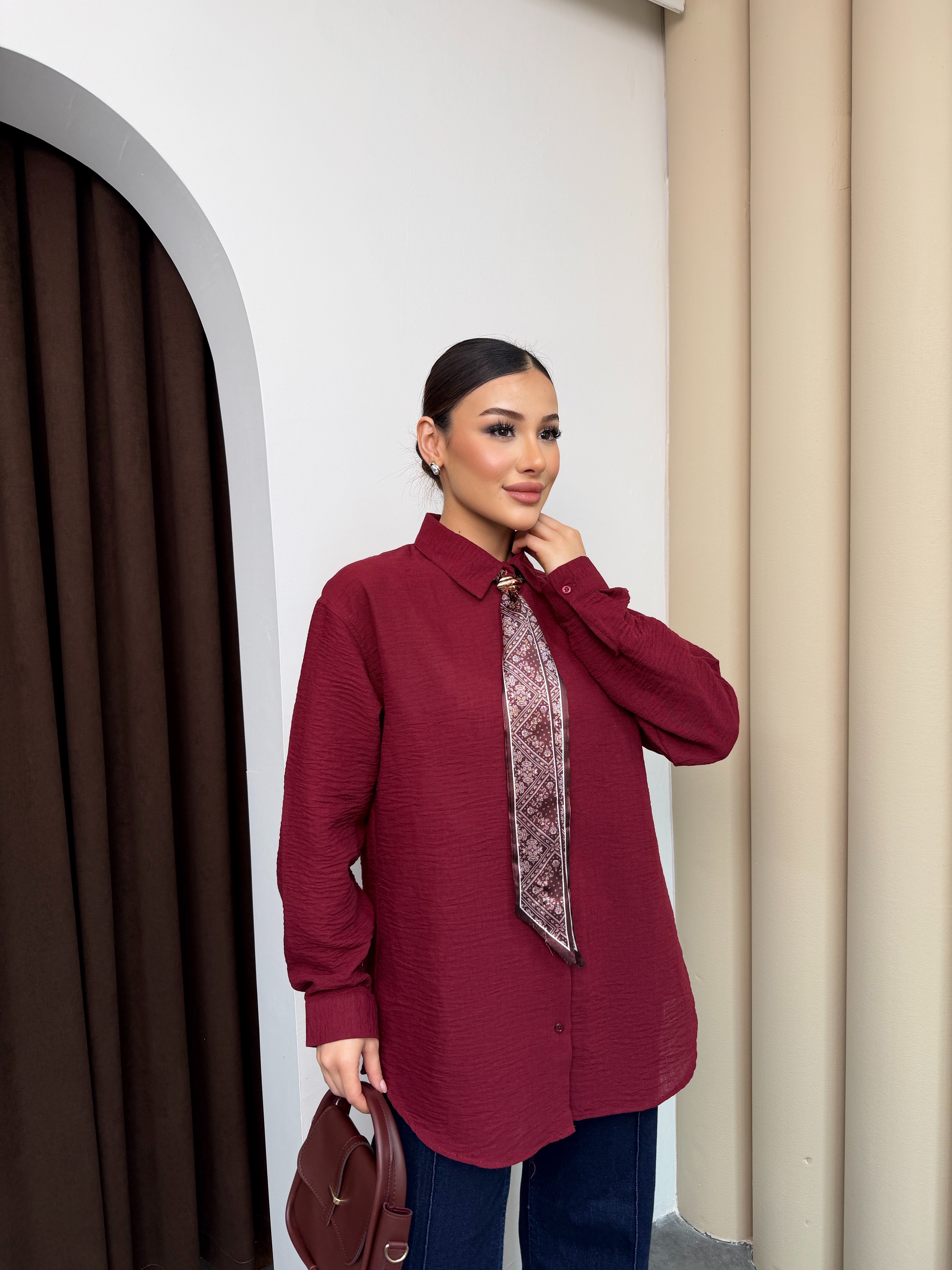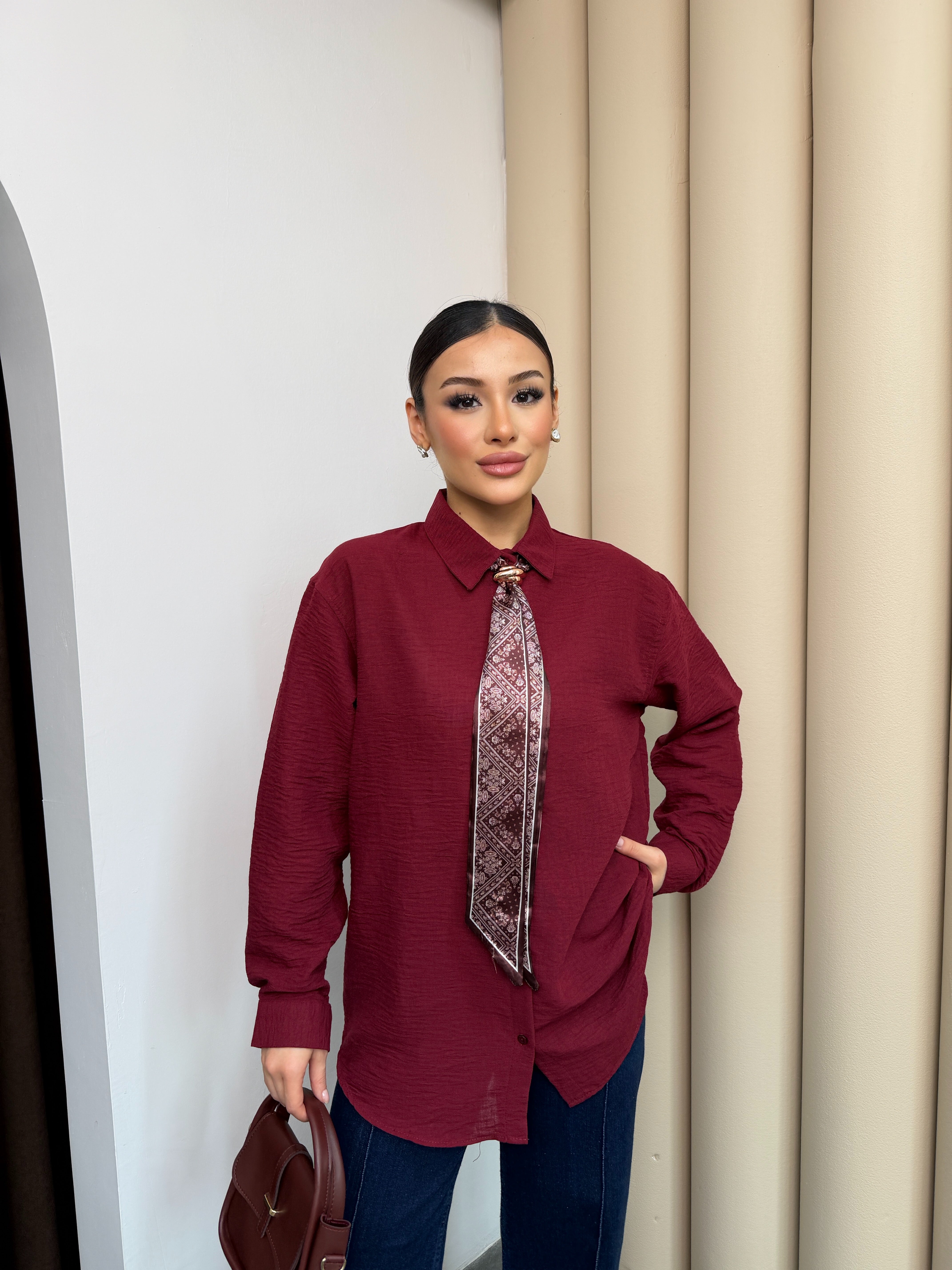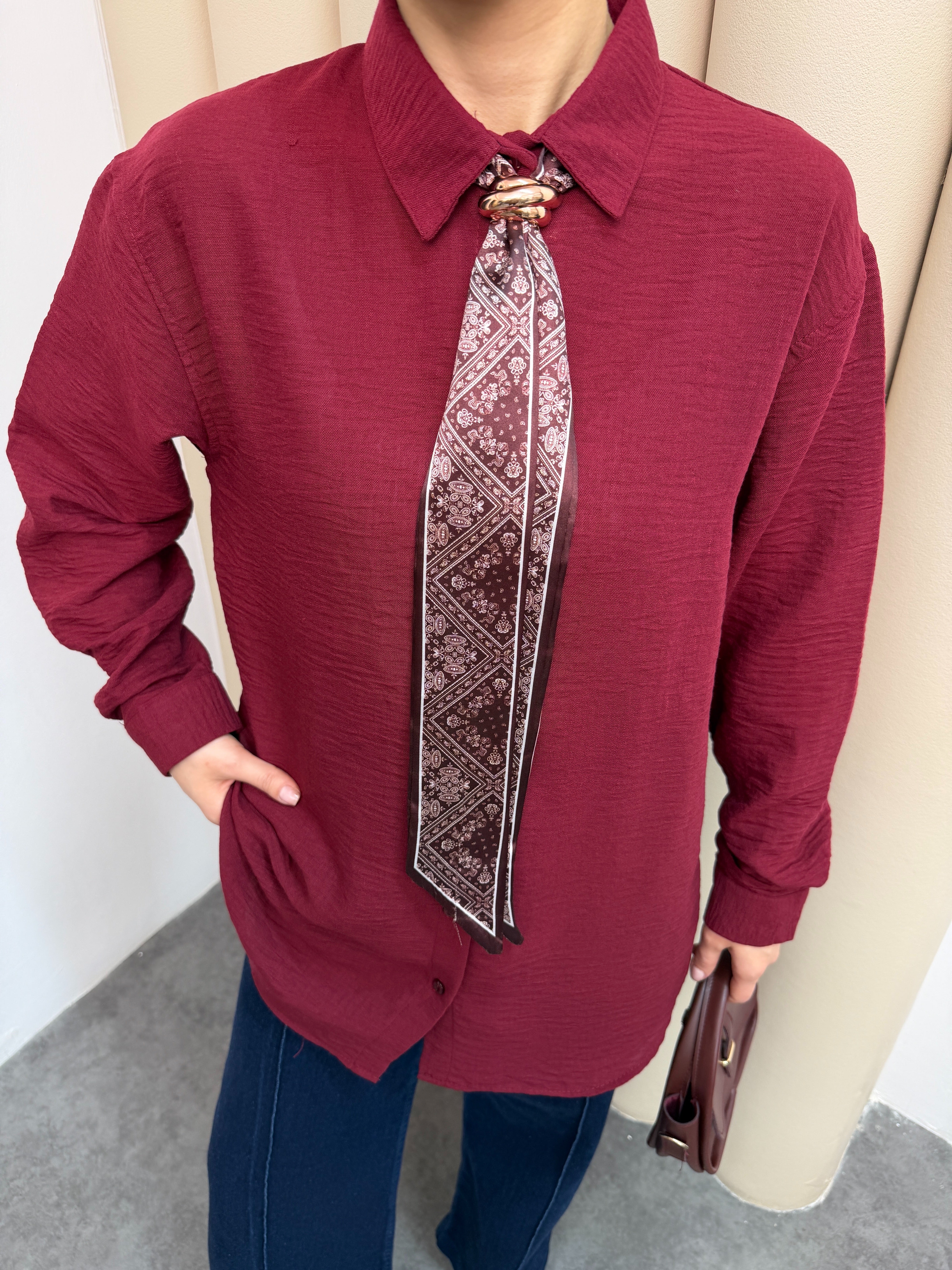 Yaka Aksesuarlı ve Fular Detaylı Dokulu Gömlek 9003 - Bordo