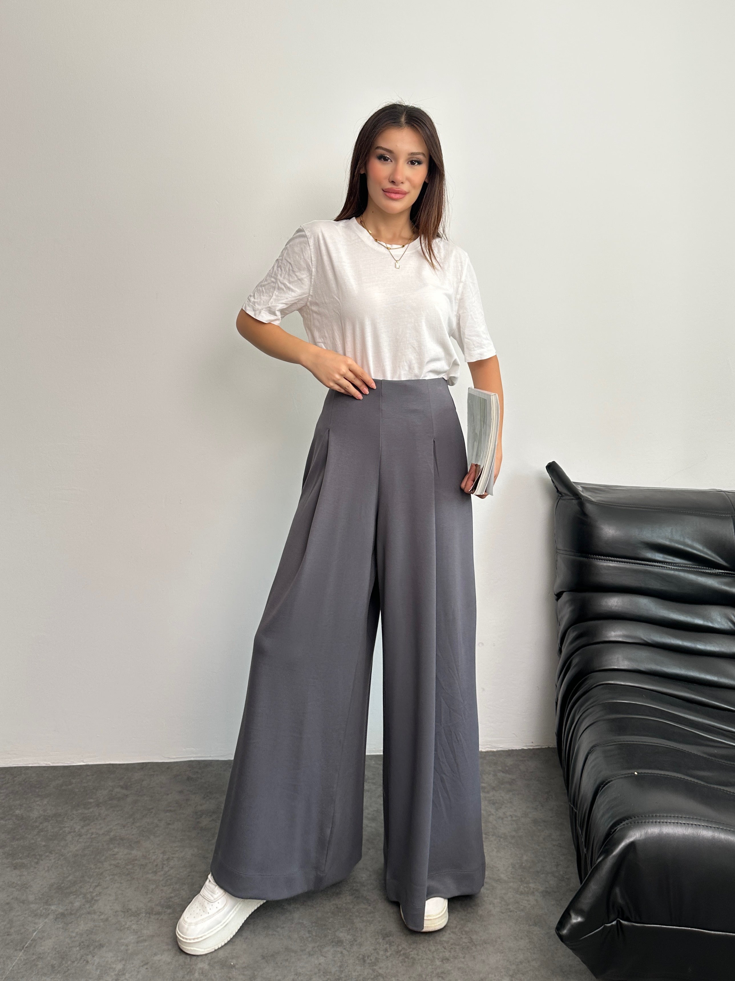 Hem şık hem de konforlu bir seçenek arayanlar için Yüksek Bel Pile Detaylı Geniş Paça Pantolon ideal bir seçim. Kaliteli kumaşı sayesinde dökümlü ve zarif bir duruş sergilerken, gün boyu rahat bir kullanım sunar.