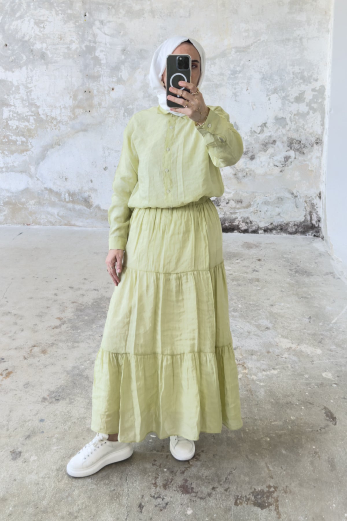 Şıklığı ve konforu bir arada sunan Kat Kat Uzun Etek, gardırobunuzun en zarif parçalarından biri olmaya aday. Pastel açık mavi rengi ferah ve narin bir görünüm sunarken, eteğin kat kat volanlı tasarımı her adımda hareket ve feminen bir hava katıyor.
