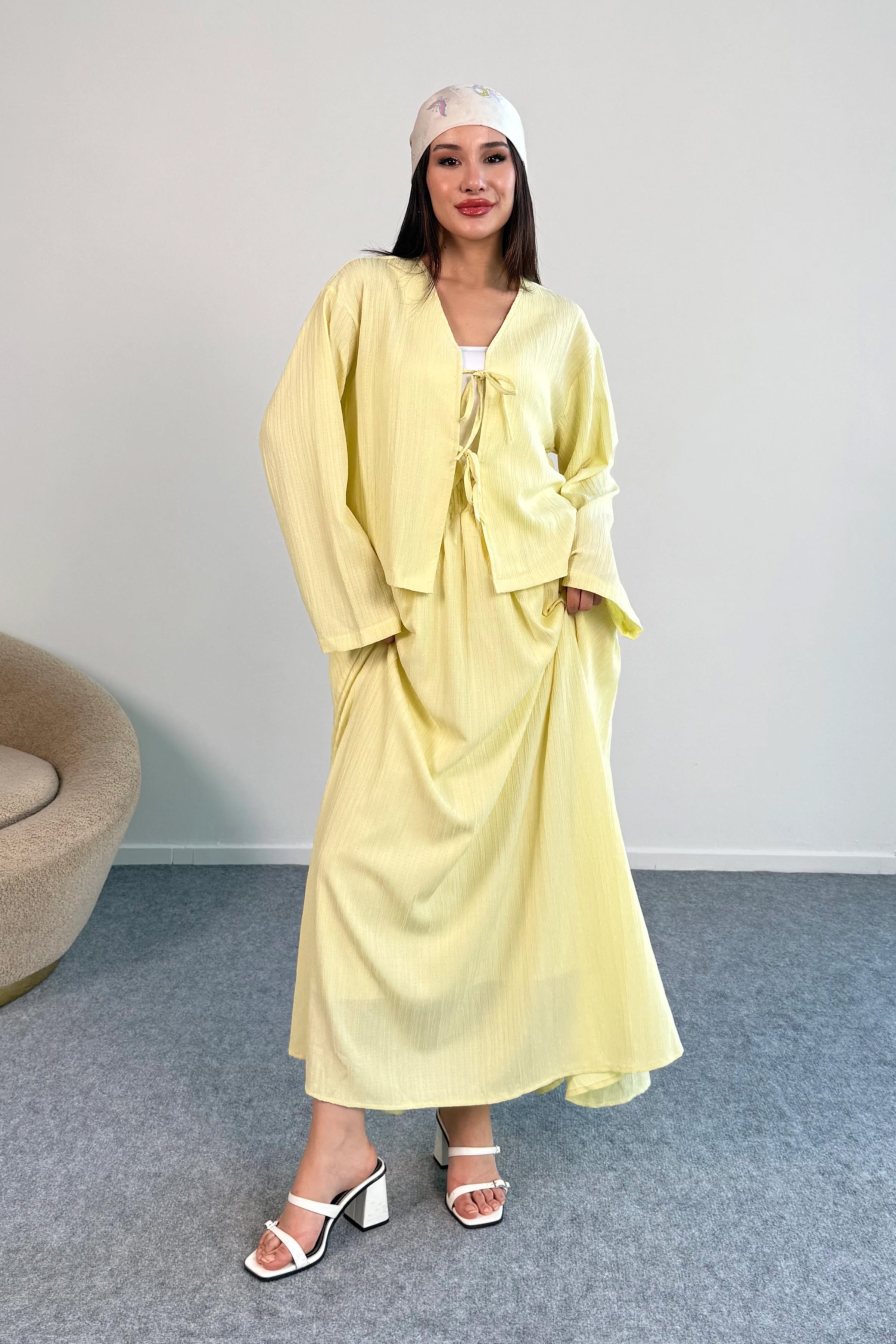 Ferah ve zarif bir stil sunan bağlama detaylı kısa ceket ve uzun etek ikili takım, gardırobunuzun en şık ve rahat parçalarından biri olmaya aday. Yumuşak ve dökümlü kumaşı sayesinde gün boyu konfor sağlarken, taze sarı rengi sakin ve modern bir hava katıyor.
