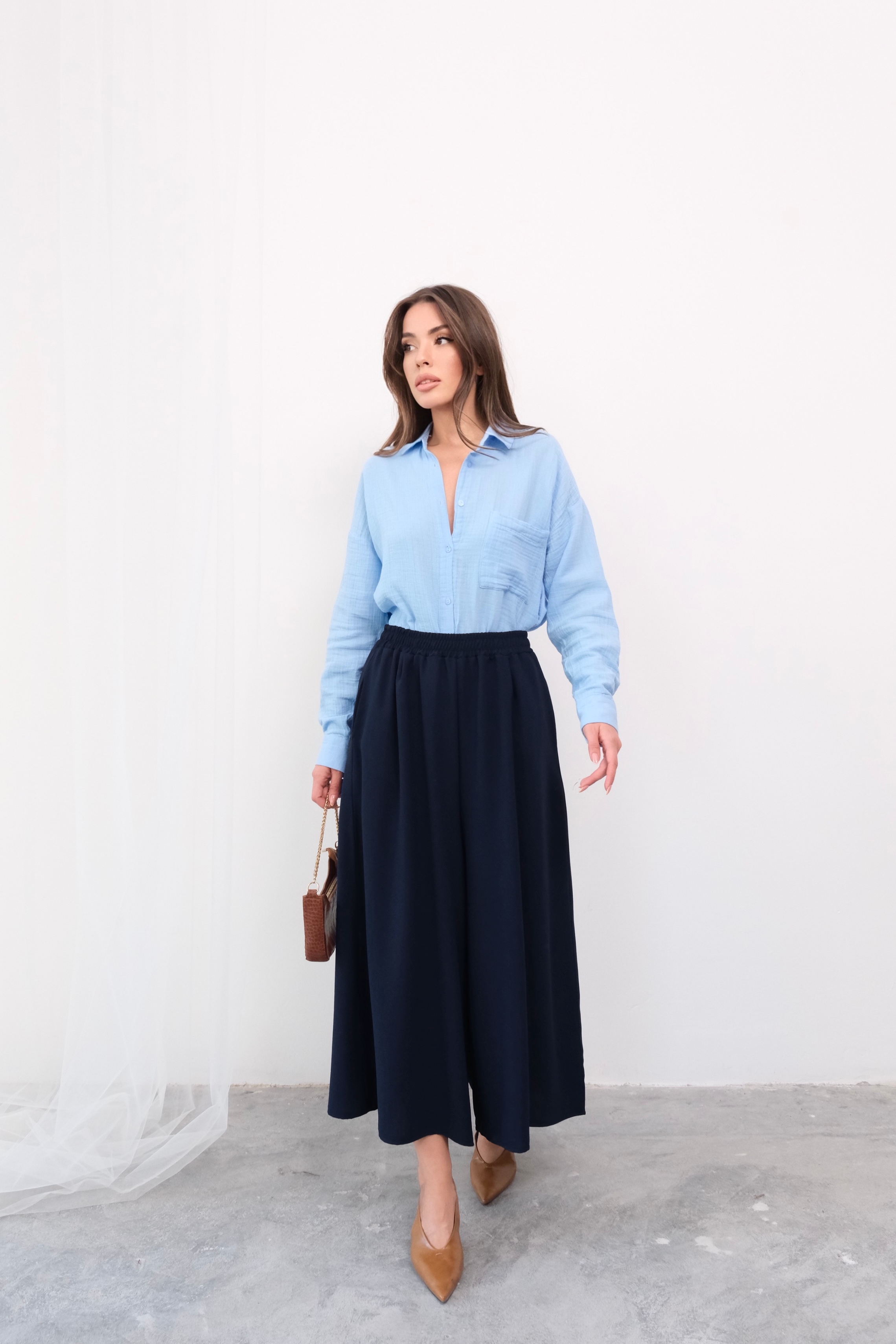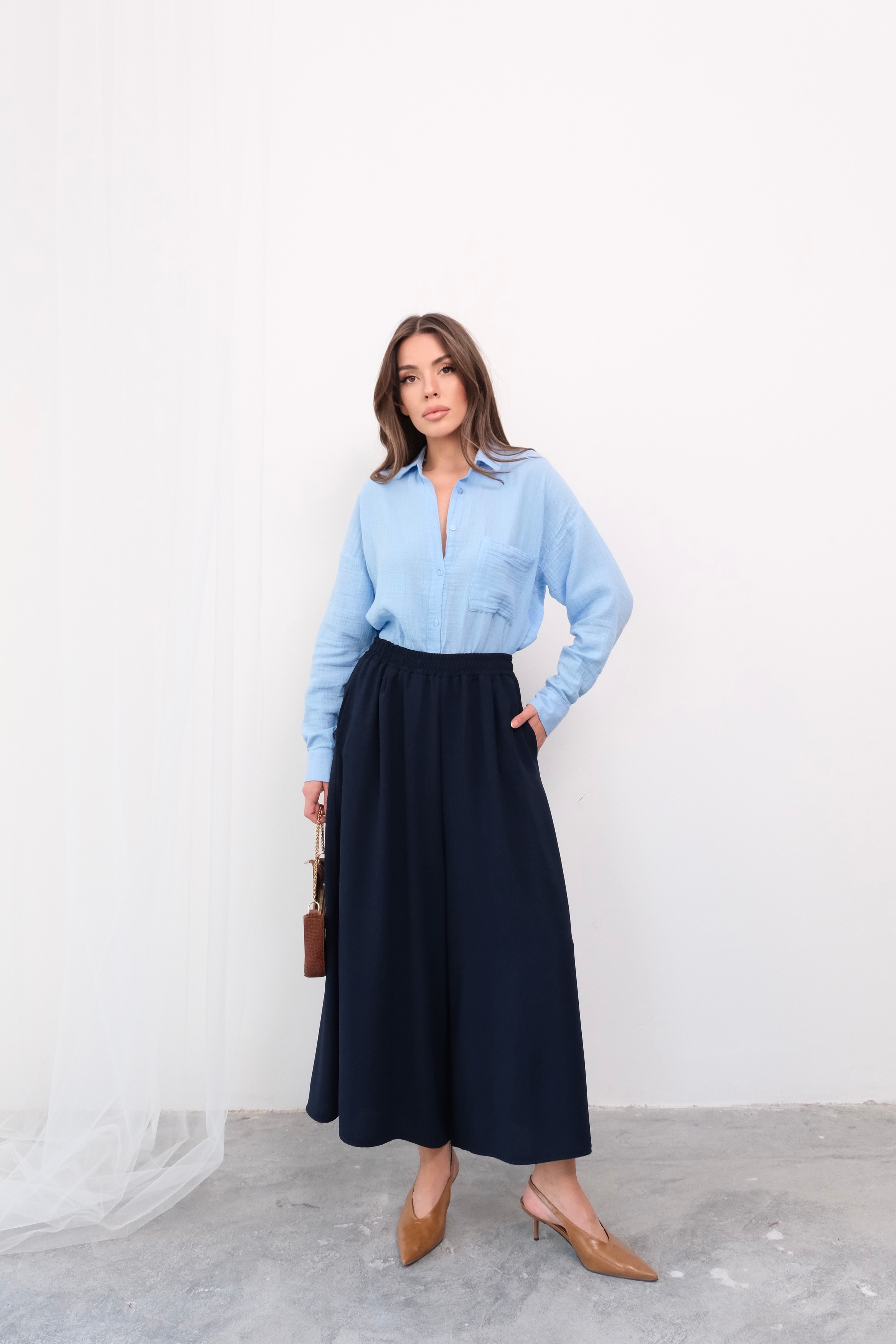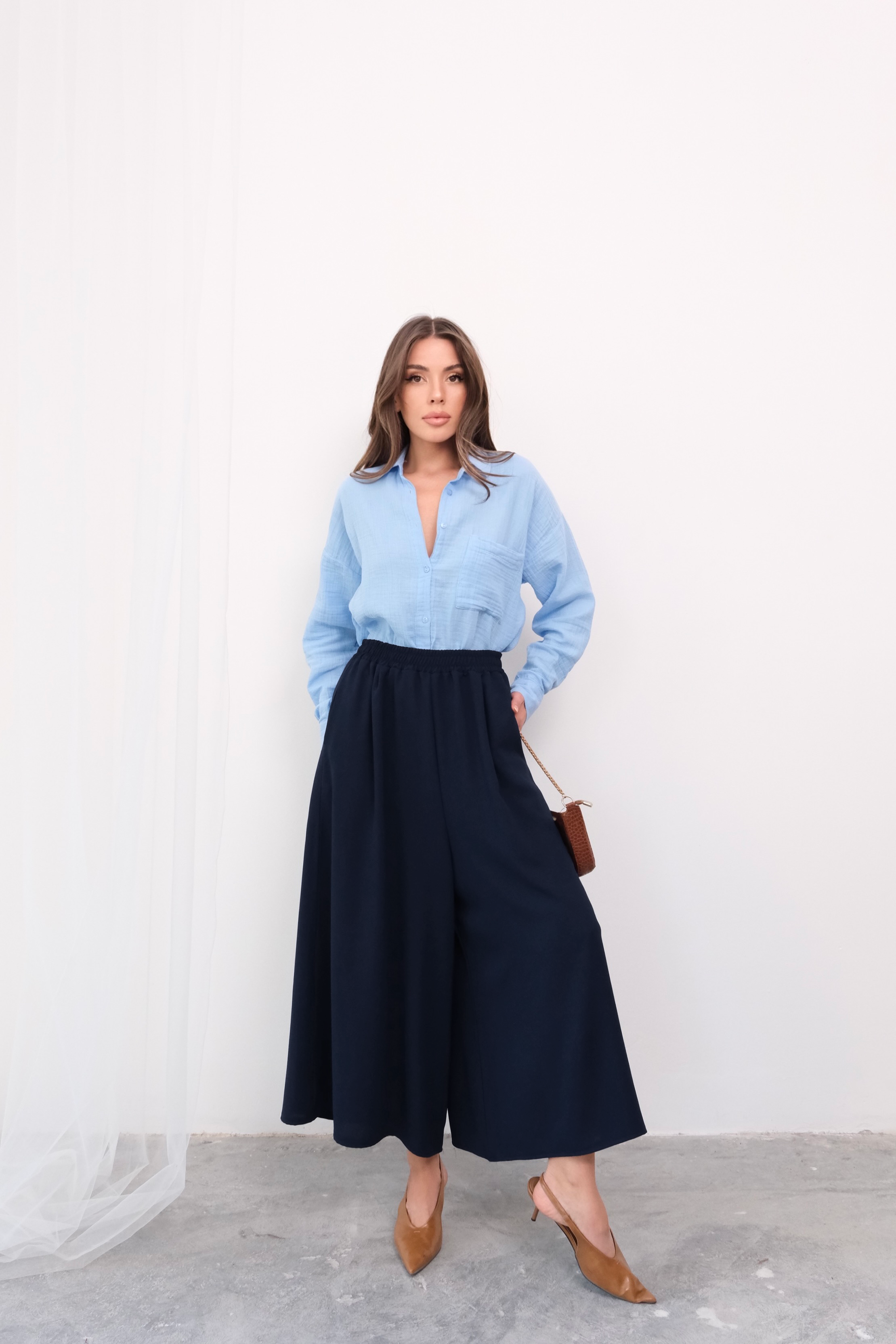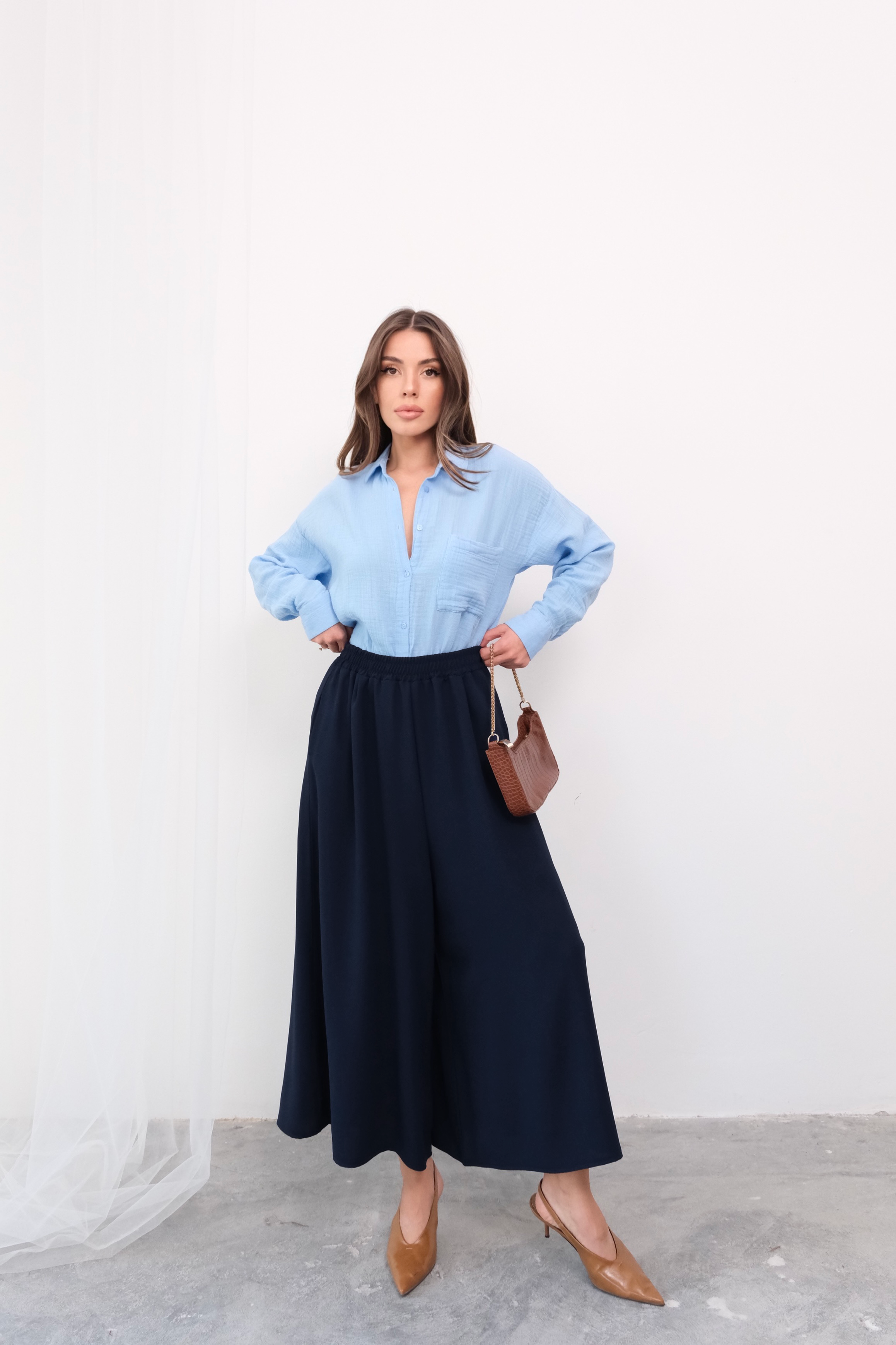 Hem etek şıklığını hem de pantolon rahatlığını bir arada sunan beli lastikli geniş kesim pantolon etek, gardırobunuzun çok yönlü parçalarından biri olmaya aday. Derin bej rengi sofistike bir görünüm yaratırken, beli lastikli yapısı gün boyu konforlu bir kullanım sunar. Geniş kesimi sayesinde hareket özgürlüğünüz kısıtlanmaz ve dökümlü kumaşı zarif bir siluet oluşturur. Midi boy tasarımı ise hem günlük kullanım hem de özel günler için idealdir.