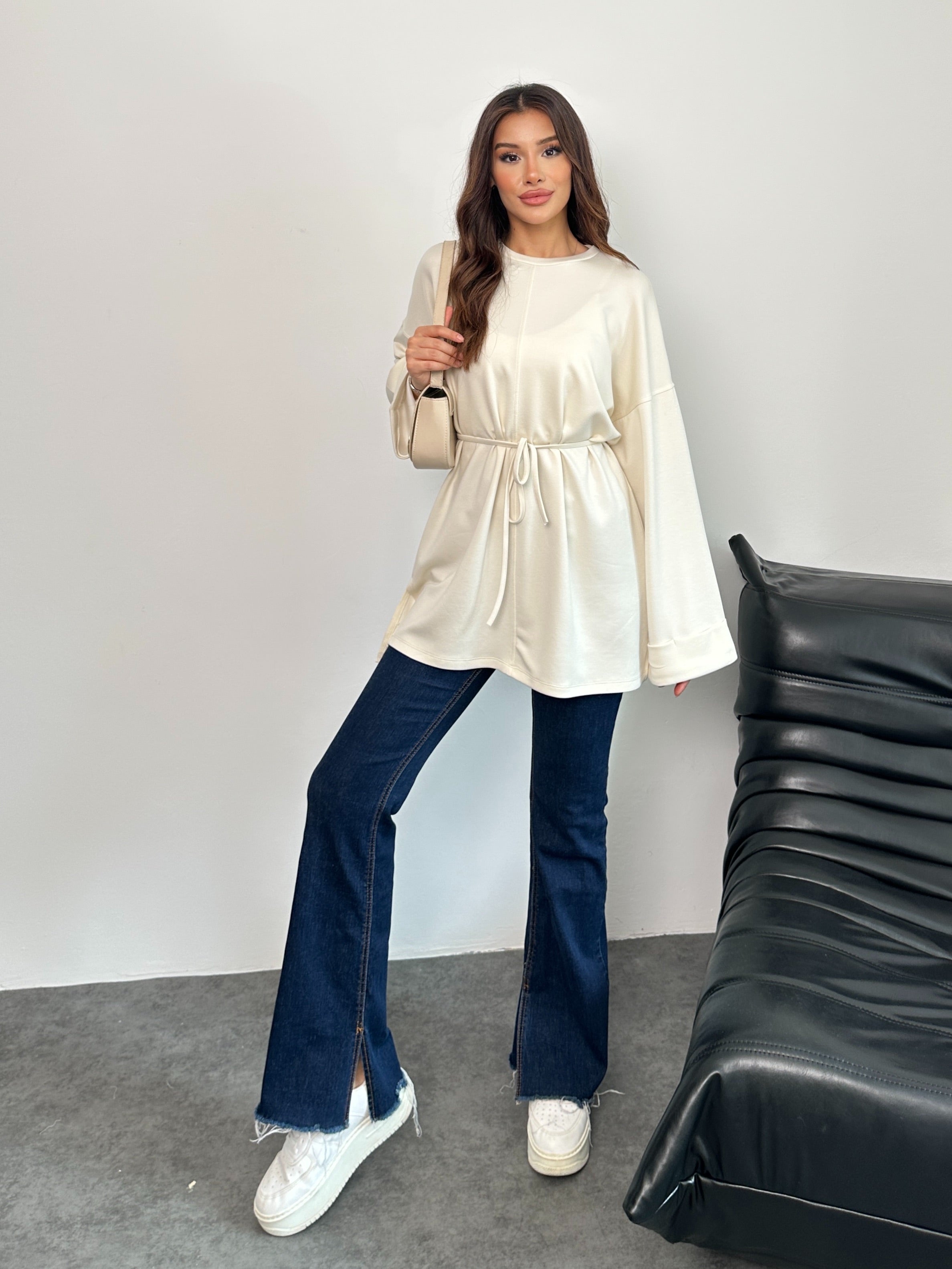 Şıklığı ve konforu bir arada sunan bu modelimizle tarzınızı yansıtın. Yumuşak ve ferahlatıcı ekru rengi ve rahat kesimiyle bu tunik, günlük kullanımda ve özel anlarınızda vazgeçilmeziniz olacak.