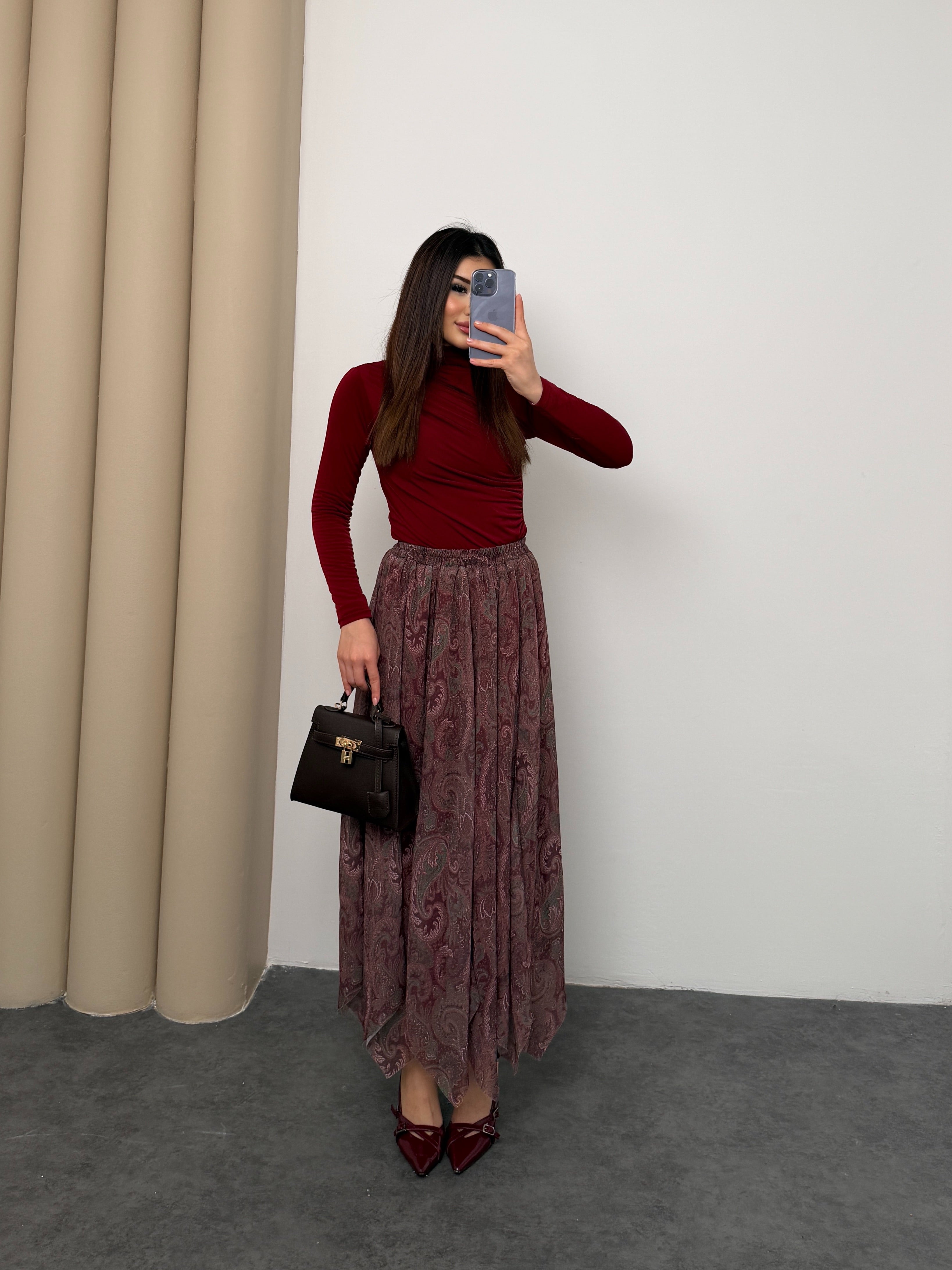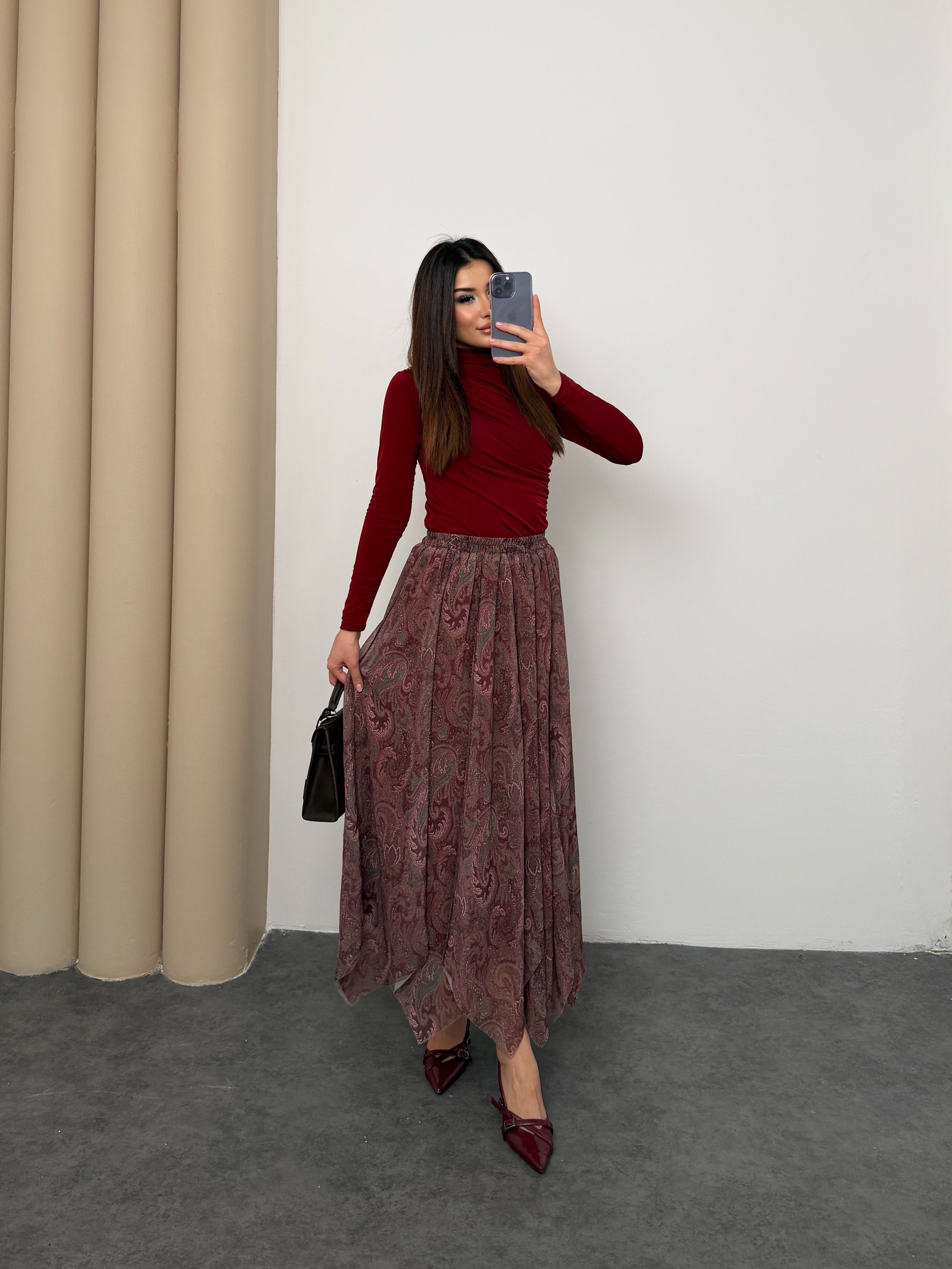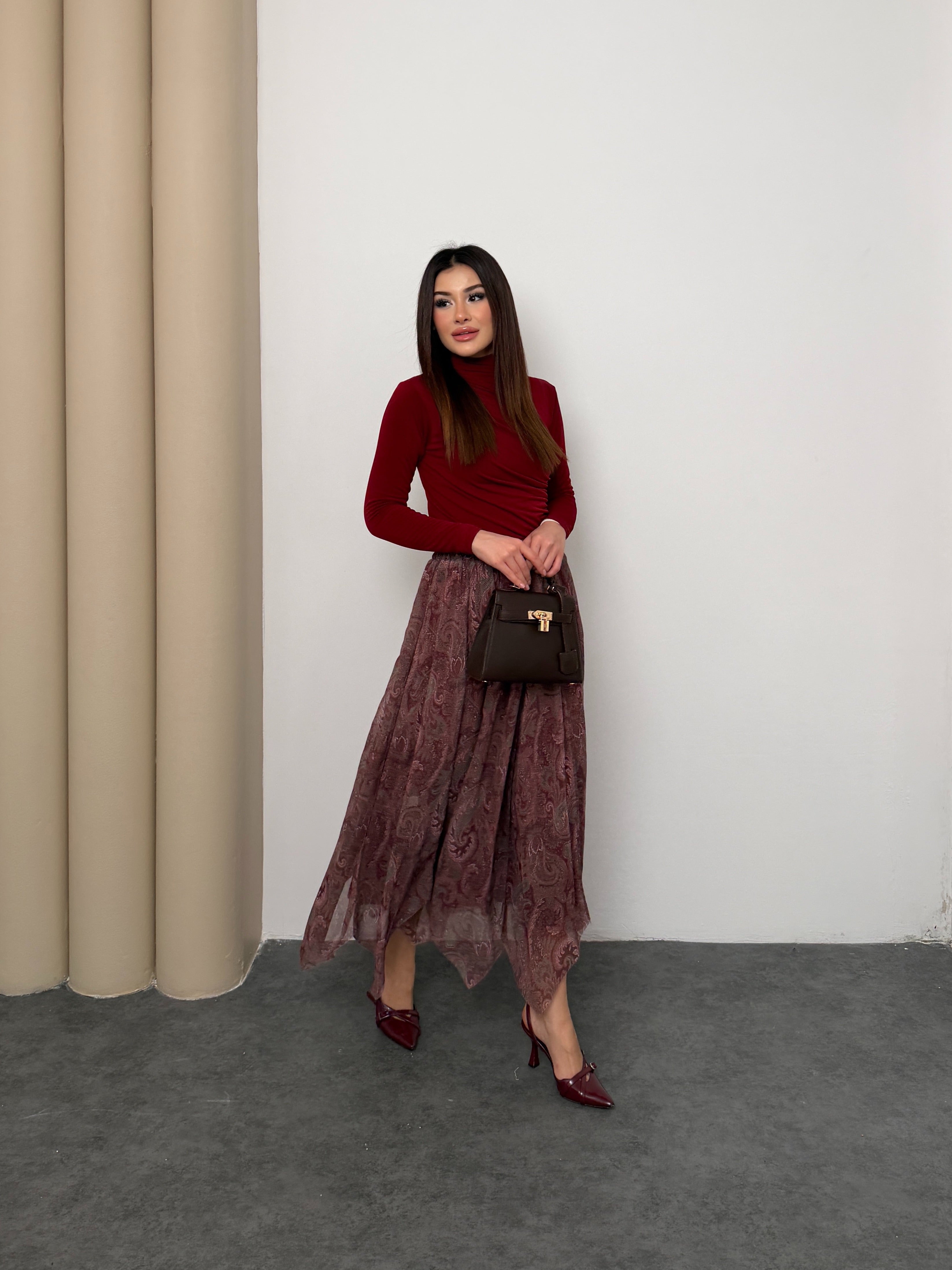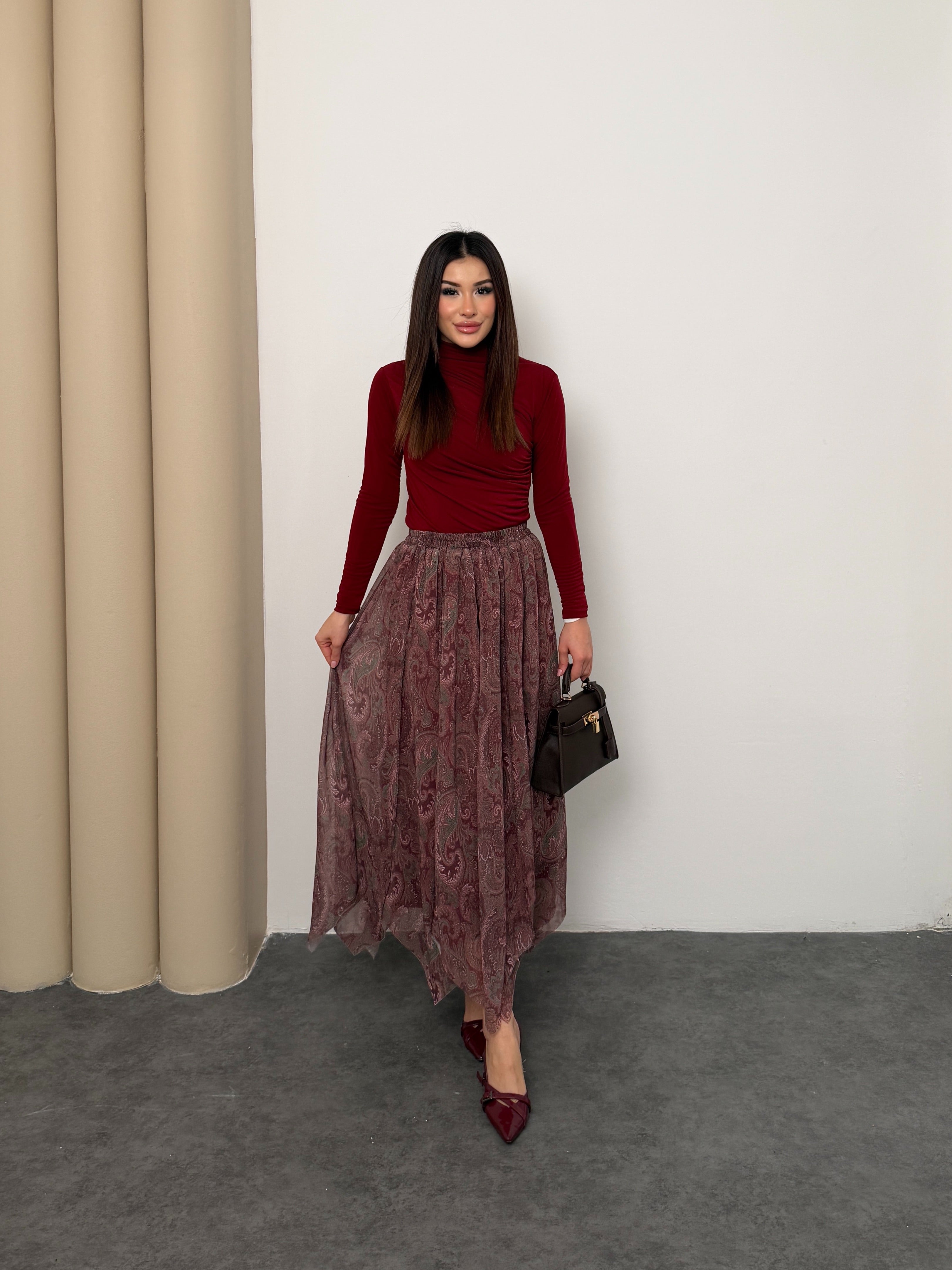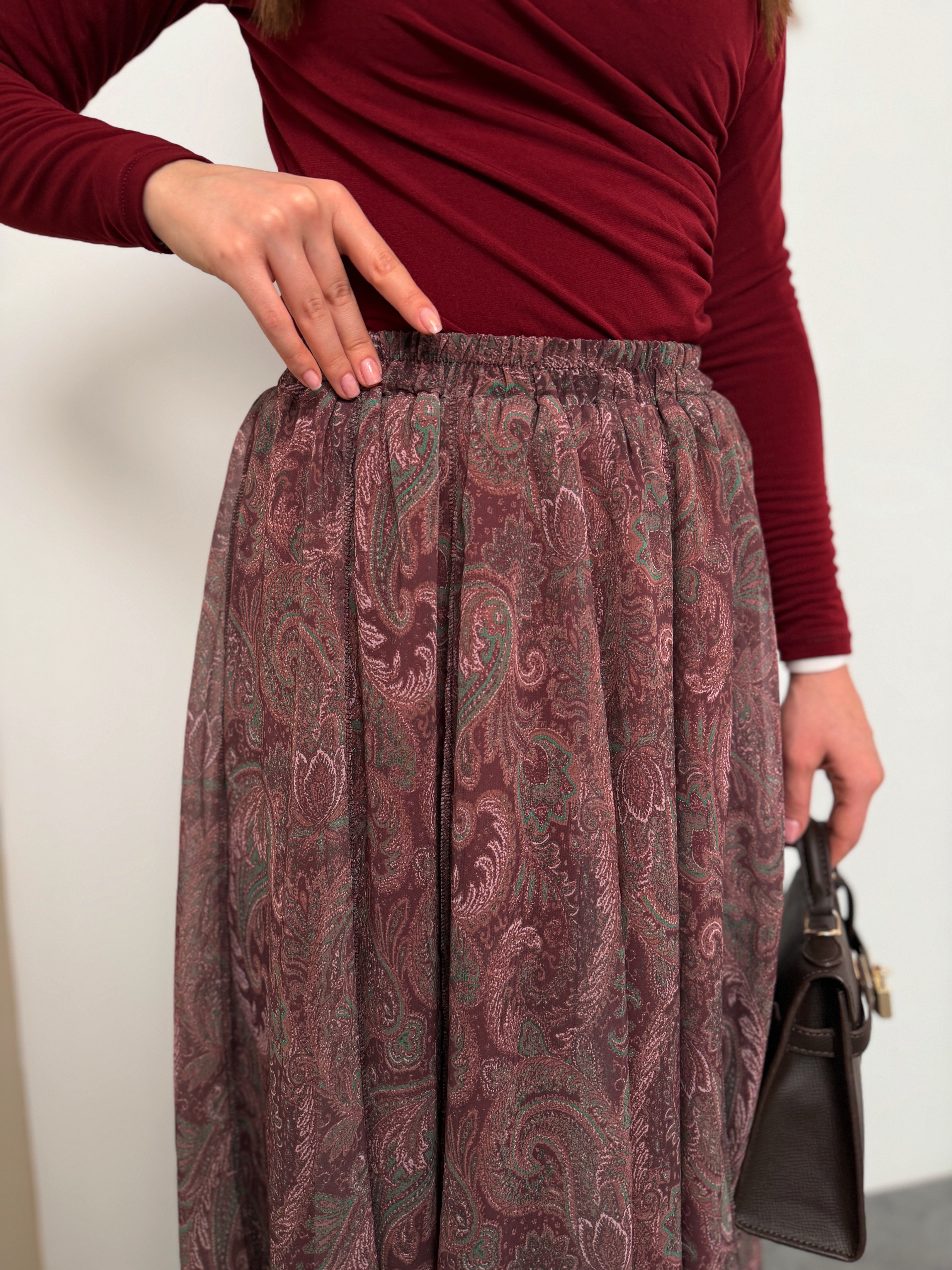 Gardırobunuza asil bir dokunuş katın! ✨ Zarif şal desenleri ve akışkan şifon dokusuyla öne çıkan bu yeşil etek, her mevsim stilinizin anahtar parçası olacak. Yüksek bel kesimi ve konforlu yapısıyla hem ofis şıklığında hem de özel davetlerde zahmetsiz bir zarafet sunar. 💫