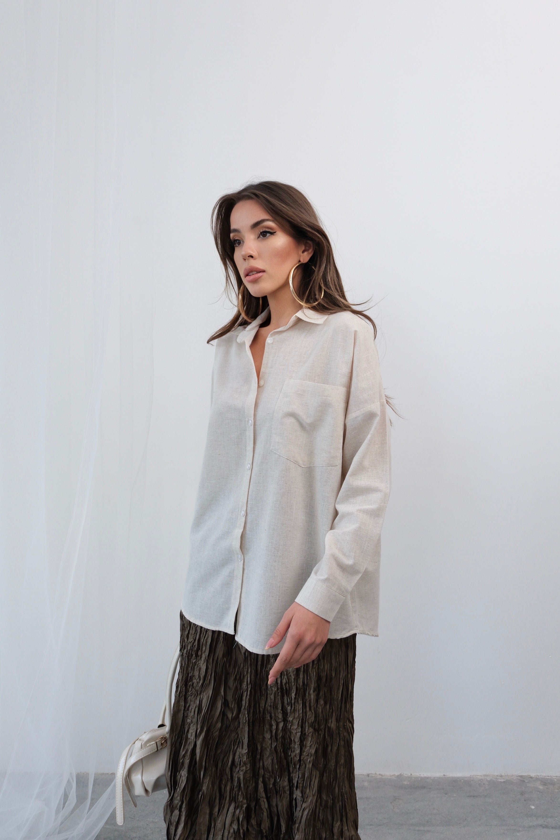 Hafif ve ferah bir görünüm sunan düz renk uzun kollu oversize gömlek, gardırobunuzun rahat ve şık parçalarından biri olmaya aday. Yumuşak dokulu kumaşı sayesinde gün boyu konfor sağlarken, bej rengi huzurlu ve taze bir hava yaratır. Oversize kesimi salaş ve modern bir stil sunarken, uzun kollu tasarımı farklı mevsimlerde kullanım kolaylığı sağlar. Göğüs kısmındaki tek cep detayı ise gömleğe minimal ve şık bir dokunuş katar.