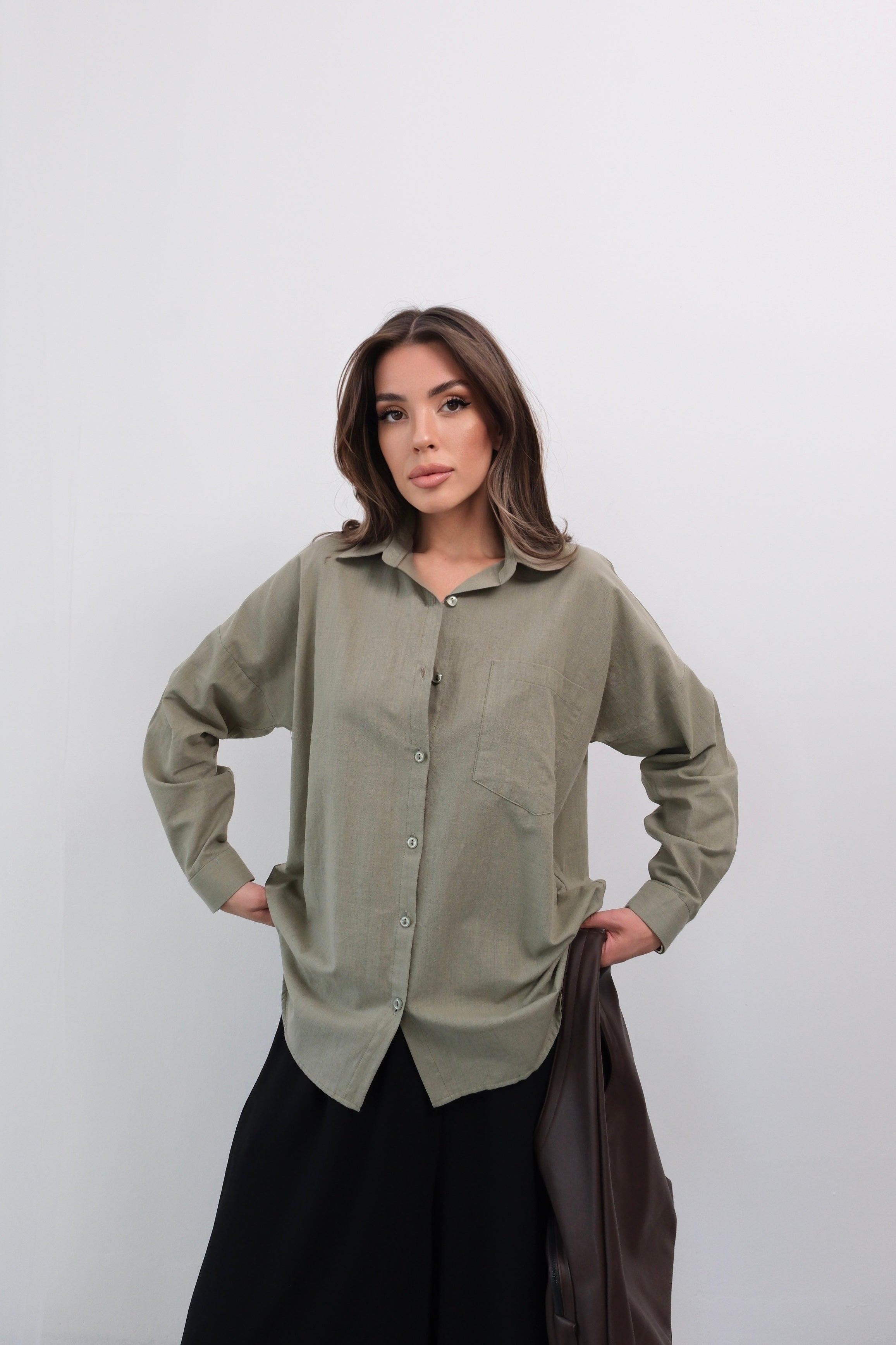 Hafif ve ferah bir görünüm sunan düz renk uzun kollu oversize gömlek, gardırobunuzun rahat ve şık parçalarından biri olmaya aday. Yumuşak dokulu kumaşı sayesinde gün boyu konfor sağlarken, haki rengi huzurlu ve taze bir hava yaratır. Oversize kesimi salaş ve modern bir stil sunarken, uzun kollu tasarımı farklı mevsimlerde kullanım kolaylığı sağlar. Göğüs kısmındaki tek cep detayı ise gömleğe minimal ve şık bir dokunuş katar.