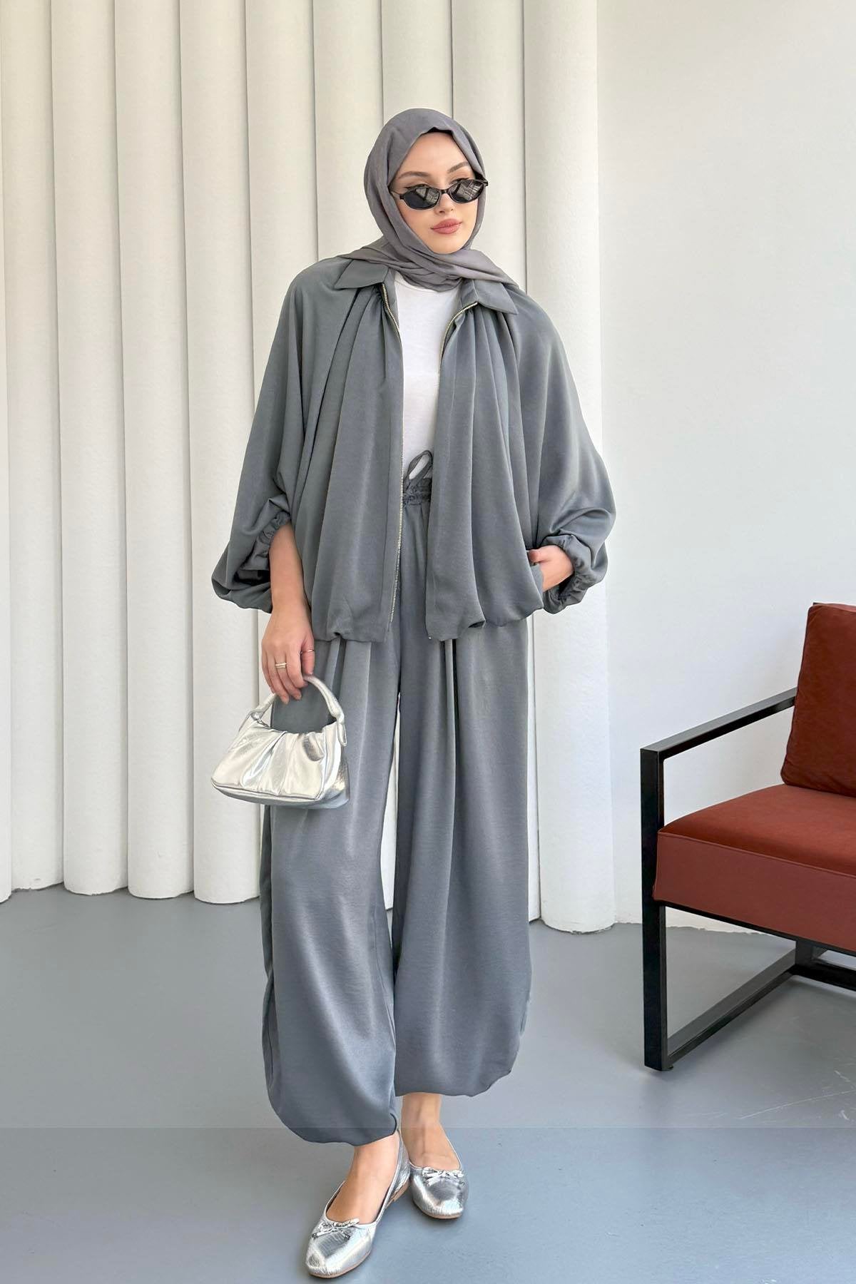 Saten Büzgülü Pileli Bumber Ceket Pantolon Takım 3015 - Gri