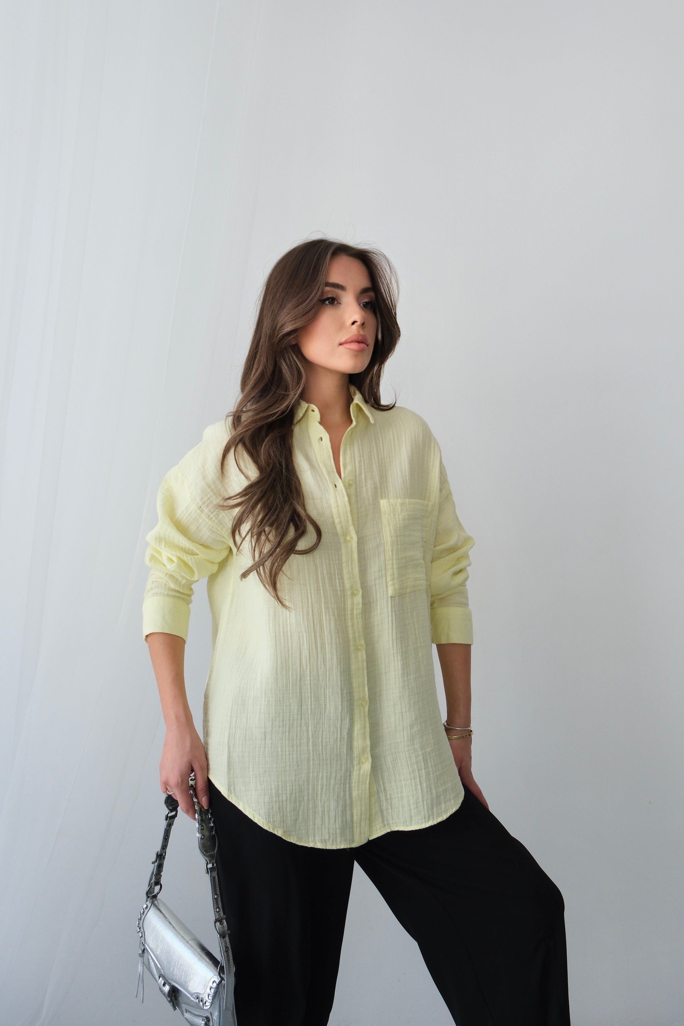 Yazlık Rahat Kesim Müslin Kumaş Uzun Kollu Gömlek - Sarı