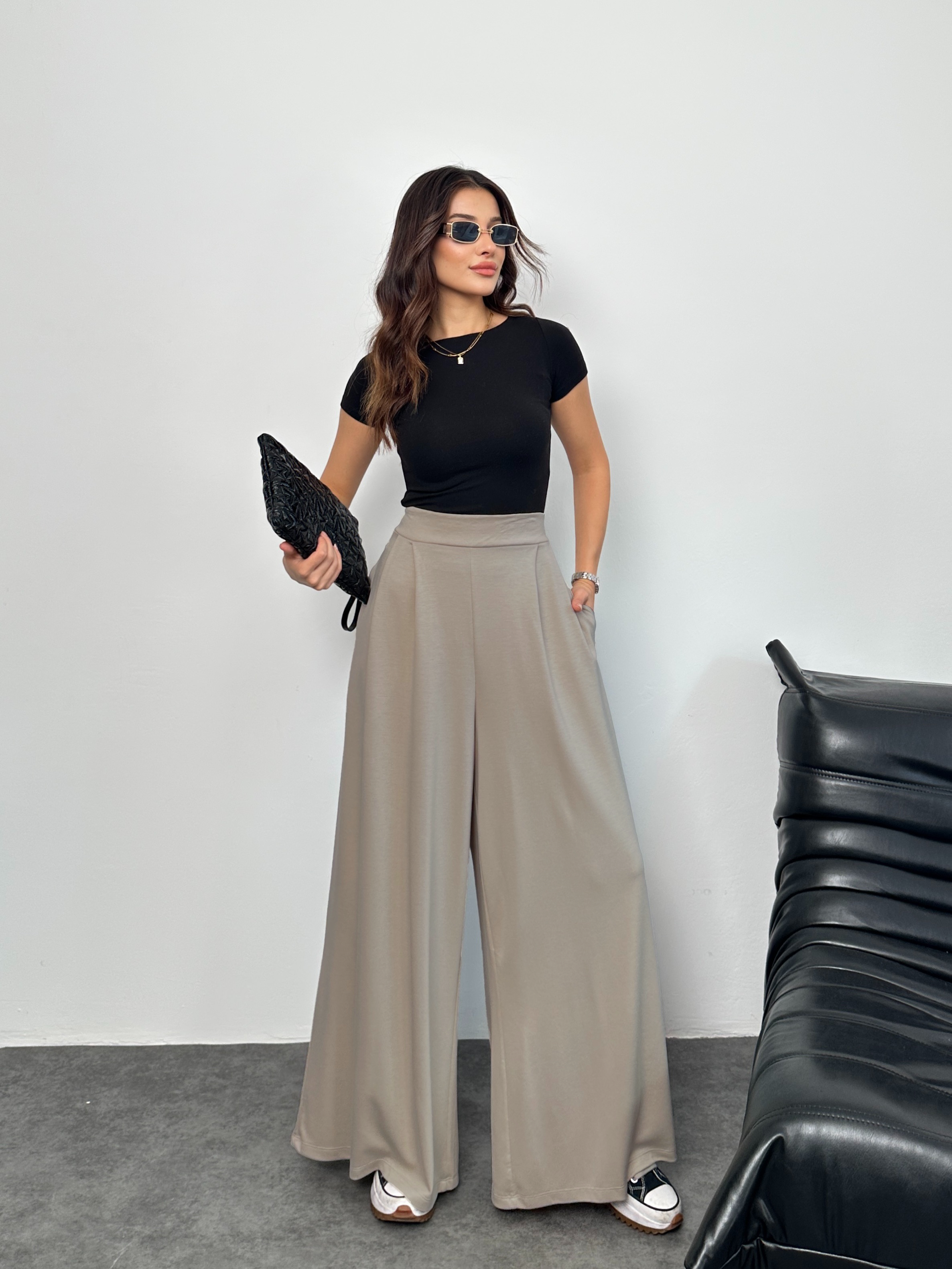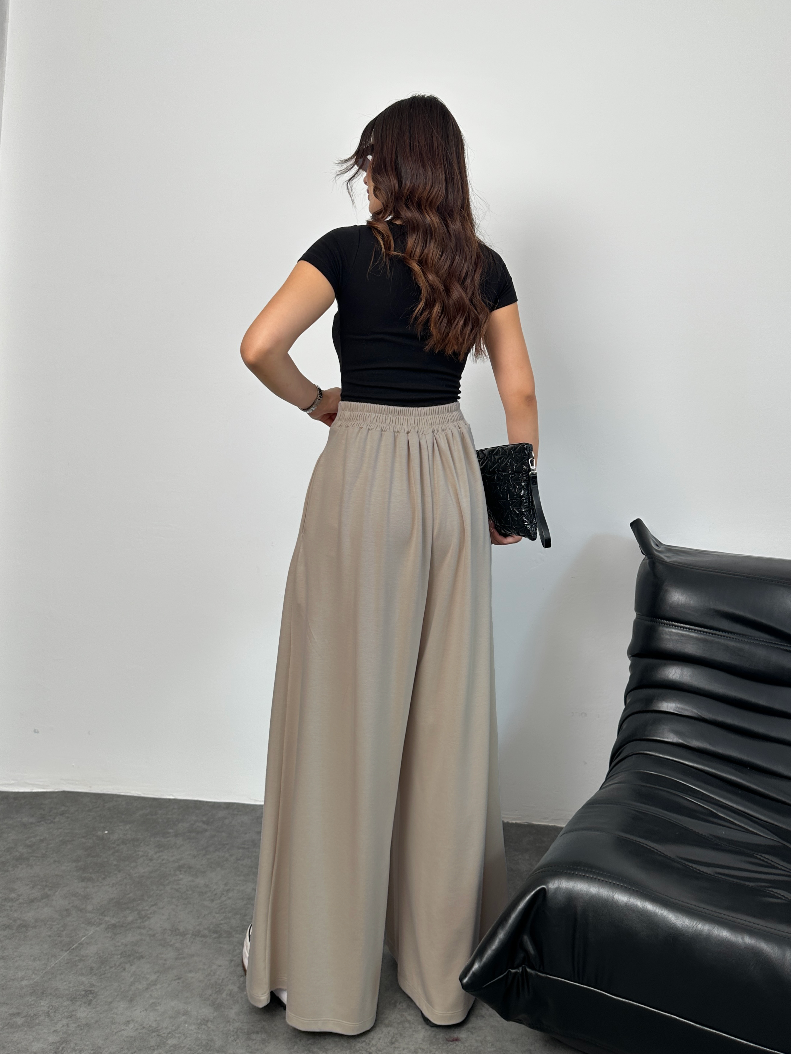 Bu pantolonun en önemli özelliklerinden biri, ön kısımdaki zarif pili (pile) detayları ve geniş paça kesimidir. Bu tasarım, pantolona hem dökümlü hem de zarif bir siluet kazandırır. En çok aranan özelliklerden biri olan arka belin lastikli olması, pantolonun bedene mükemmel uyum sağlamasına yardımcı olur ve belde sıkma yapmadan konforlu bir giyim deneyimi sunar.