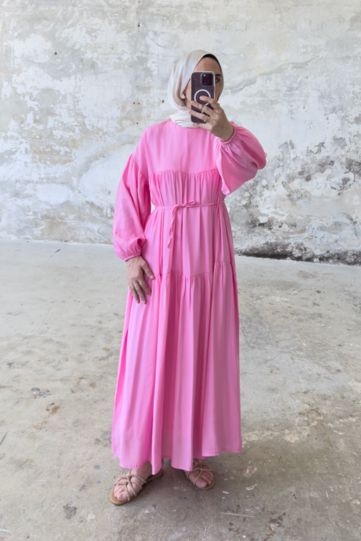 Uzun ve bol kesimli kolları, hareket özgürlüğü sunarken, etek kısmındaki kat kat fırfır detayları elbiseye hareket ve romantik bir hava katıyor. Tesettür giyim için ideal olan bu elbise, yuvarlak yaka tasarımı ve dökümlü kumaşıyla gün boyu maksimum konfor sağlar. Hafif ve nefes alan yapısıyla özellikle bahar ve yaz aylarında serin ve rahat kalmanızı garantiler.