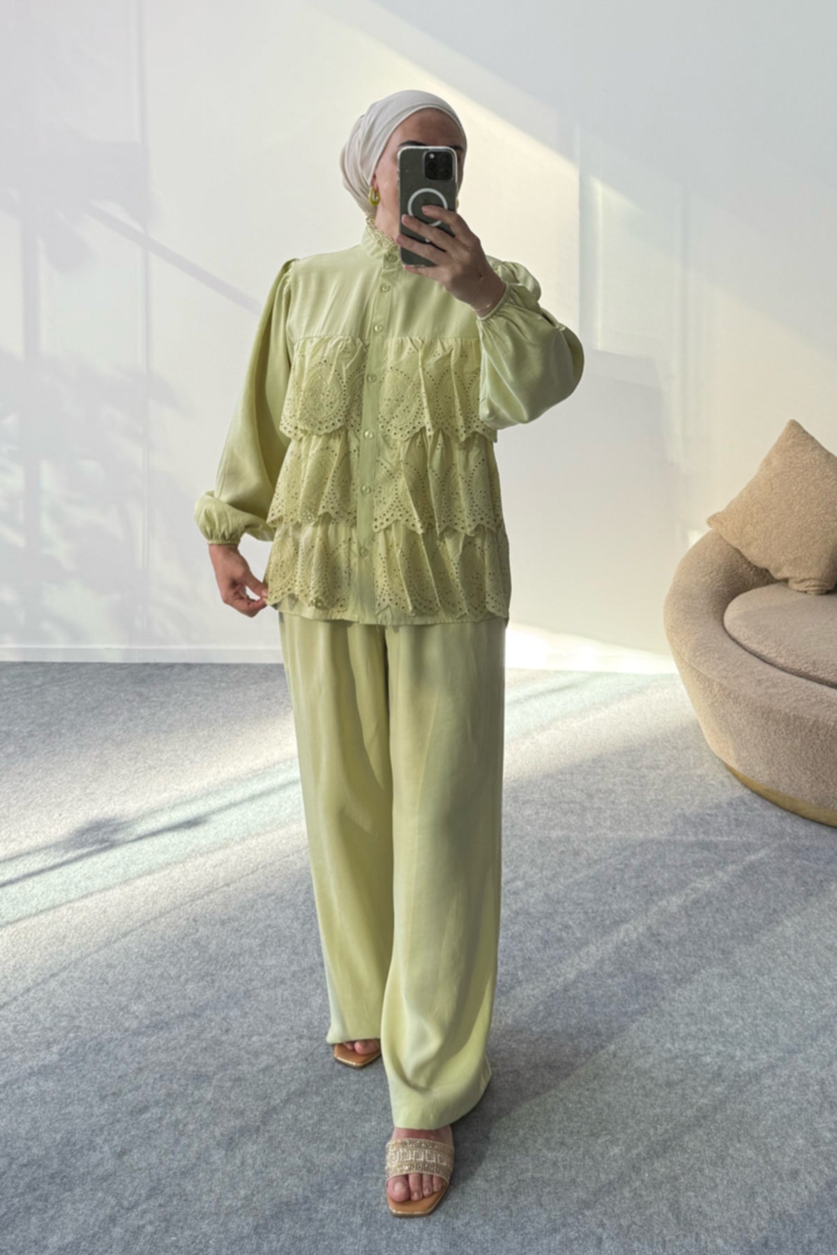 Hatunatila'nın özel tasarım koleksiyonundan olan bu yeşil dantelli pantolonlu ikili takım, kaliteli işçiliği ve modern çizgisiyle gardırobunuzun en gözde parçası olacak. Hemen sepetinize ekleyerek bu zarif takıma sahip olun!