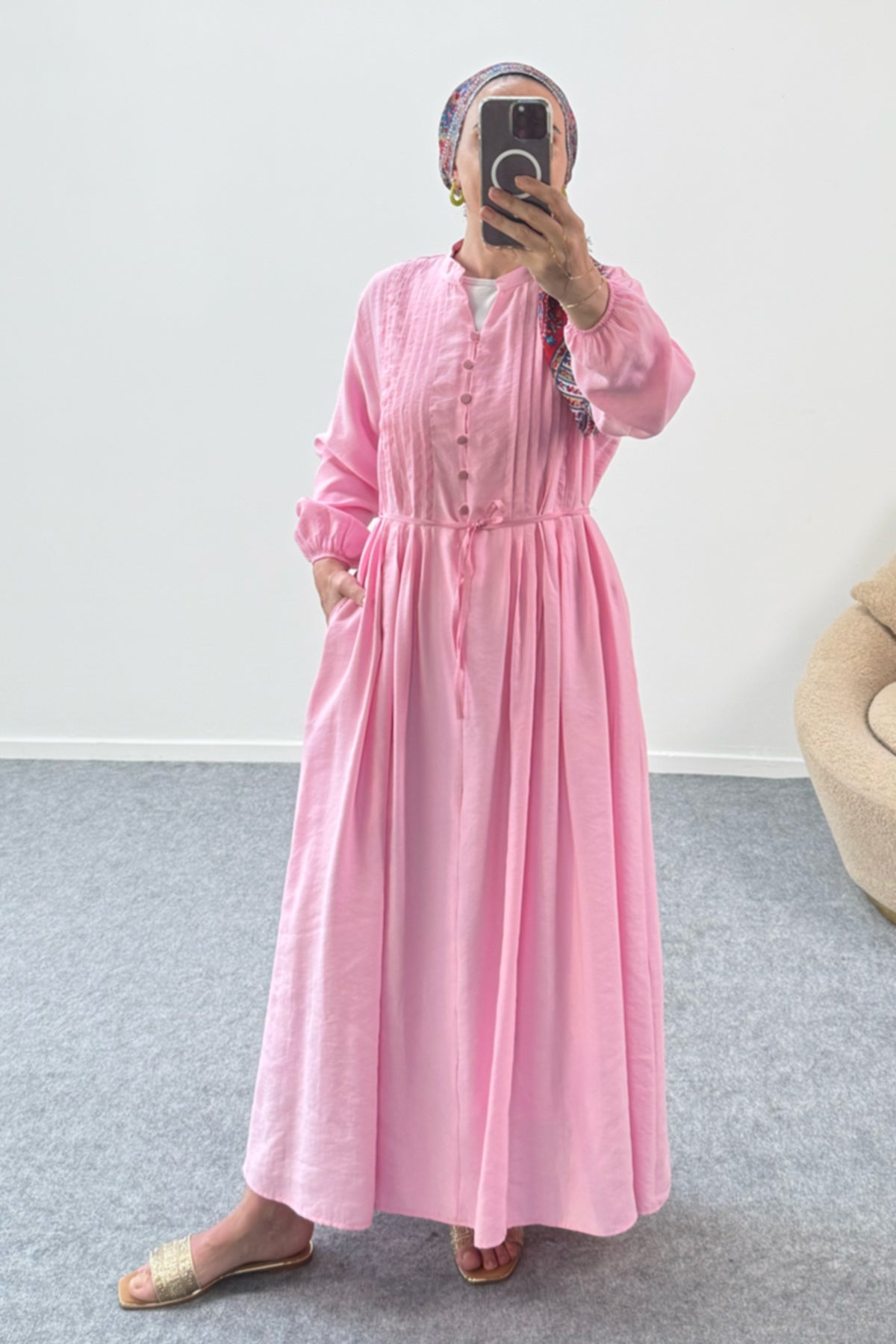 Göğsü Büzgü Detaylı Düğmeli Cepli Uzun Elbise 8032 - Pembe