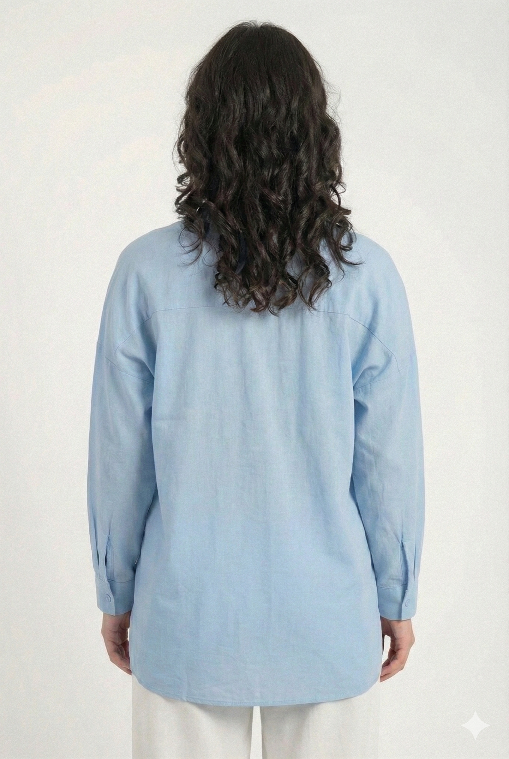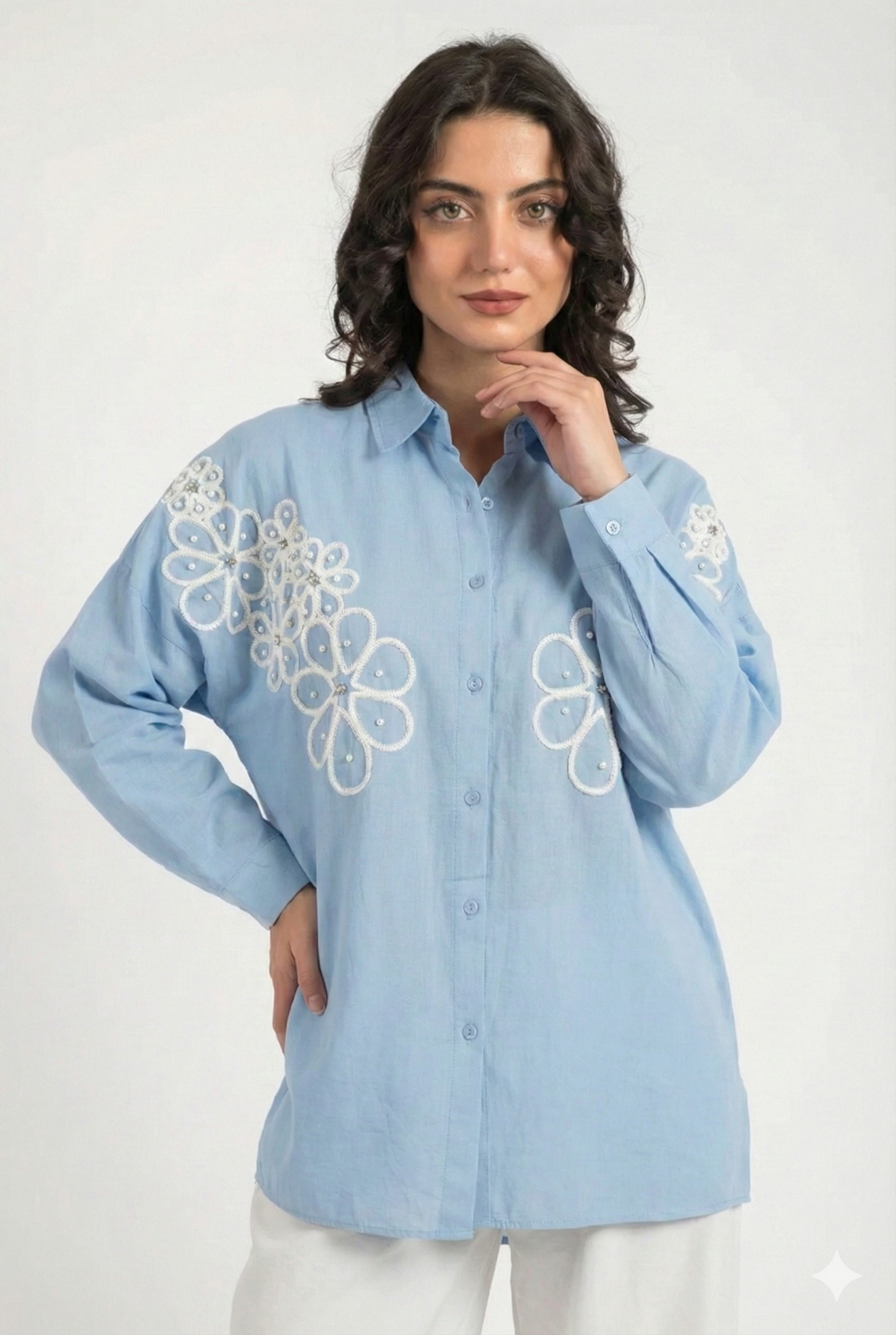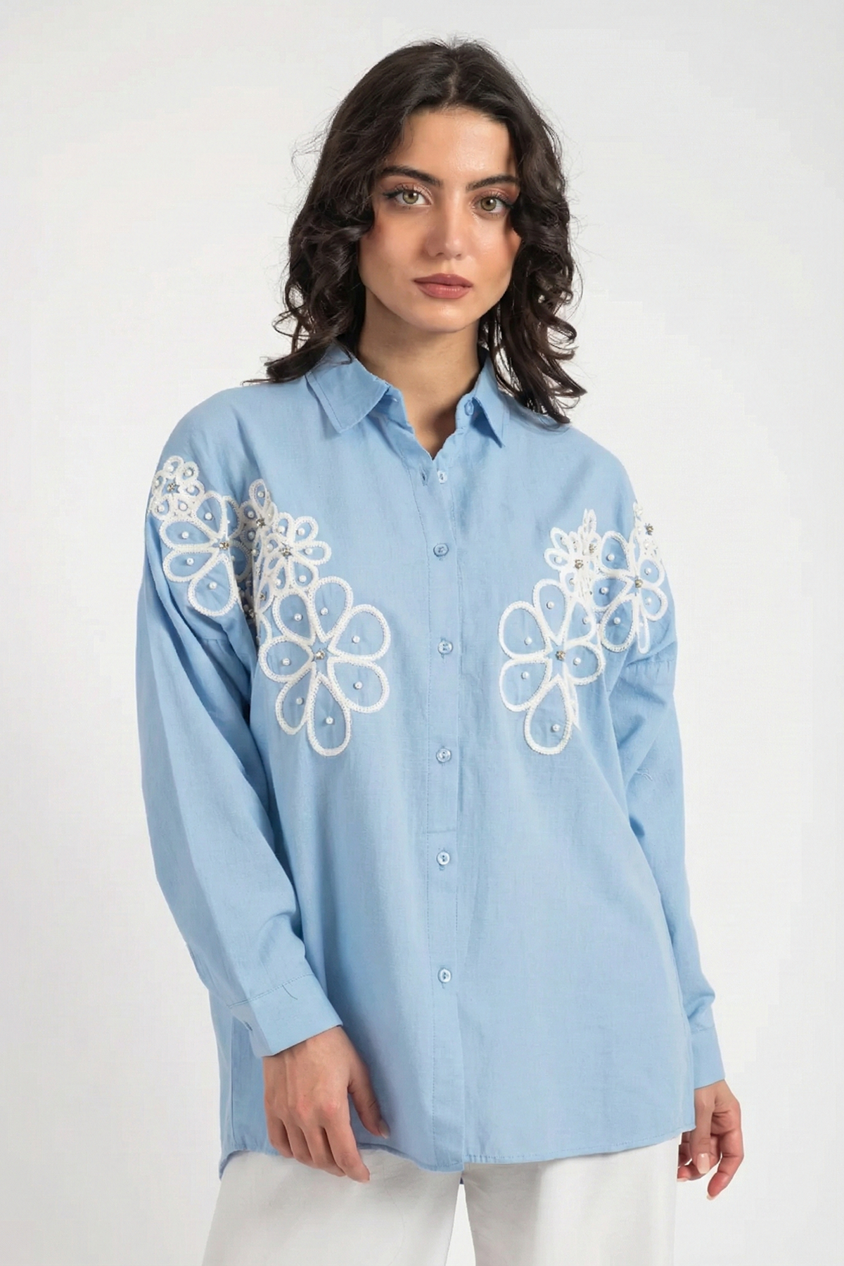 Hatun Atila Kadın Süzene Çiçek İşlemeli Taş Ve İnci Detaylı Gömlek 8728 - Açık Mavi