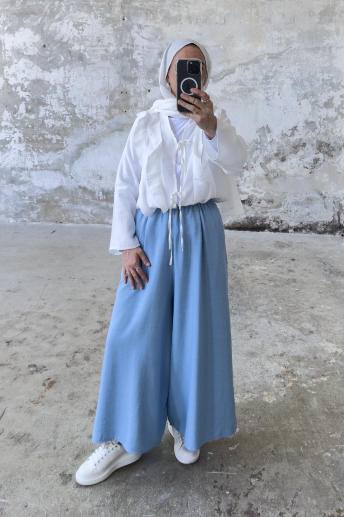 Günlük kullanım için mükemmel bir seçenek olan bu bol paça pantolon, tişörtler, bluzlar ve gömleklerle zahmetsizce kombinlenebilir. İster spor ayakkabılarla rahat bir tarz yaratın, ister şık bir bluz ve topuklu ayakkabılarla daha zarif bir görünüm elde edin. Yüksek bel kesimi de bacak boyunuzu daha uzun göstermeye yardımcı olur.