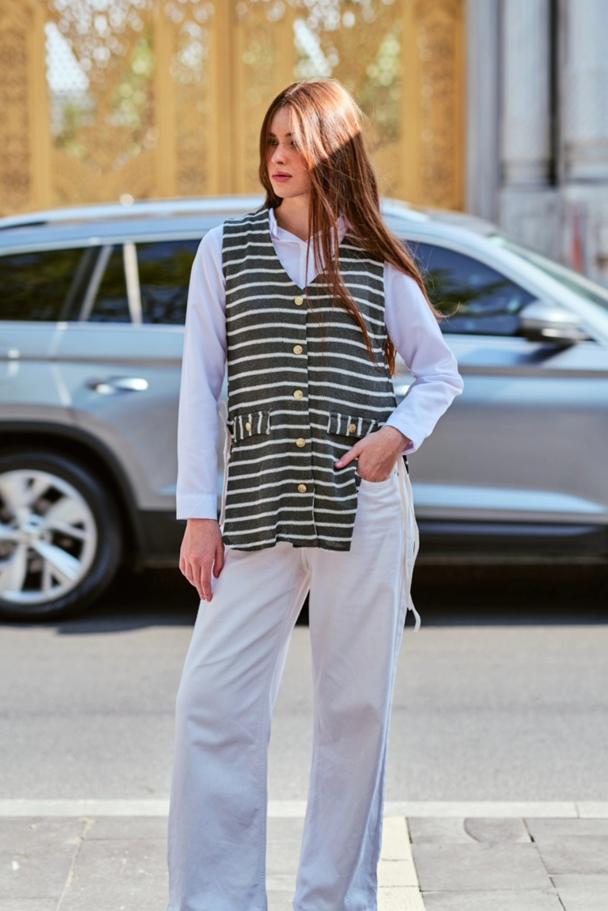HatunAtila Çizgili Triko Yelek 7707 Yeşil