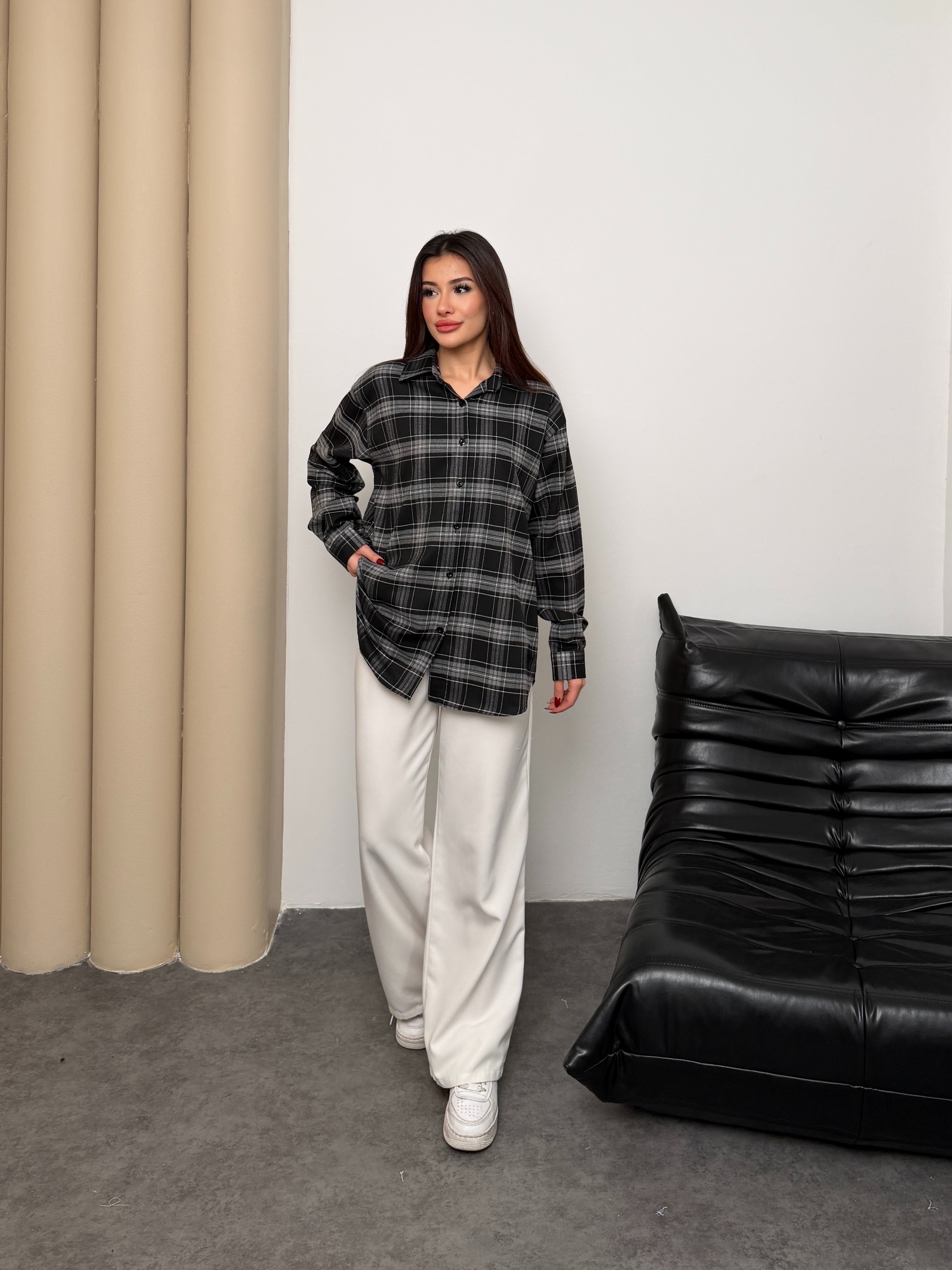 Kadın Ekose Desenli Oversize Gömlek 8968 - Siyah-Gri