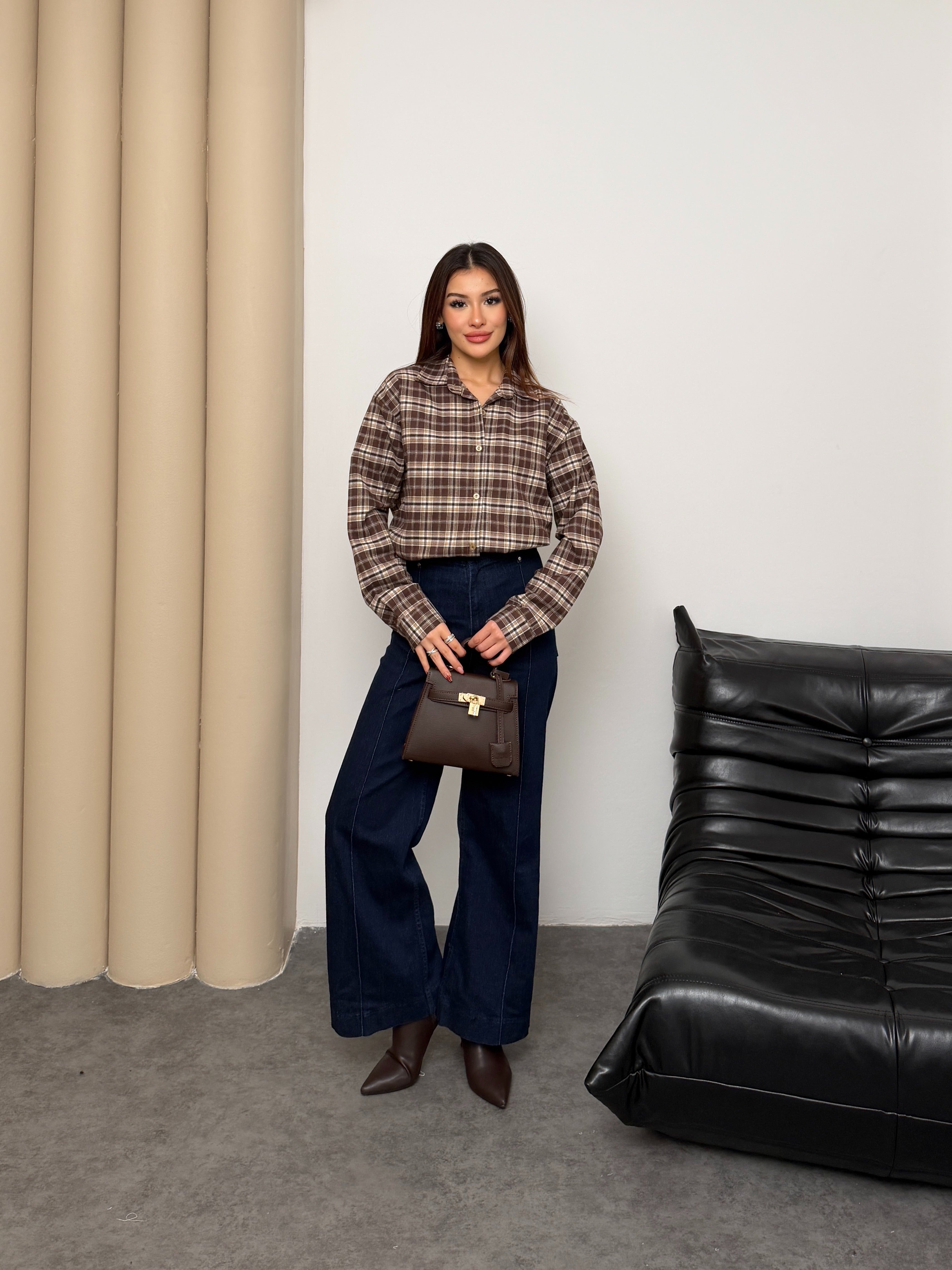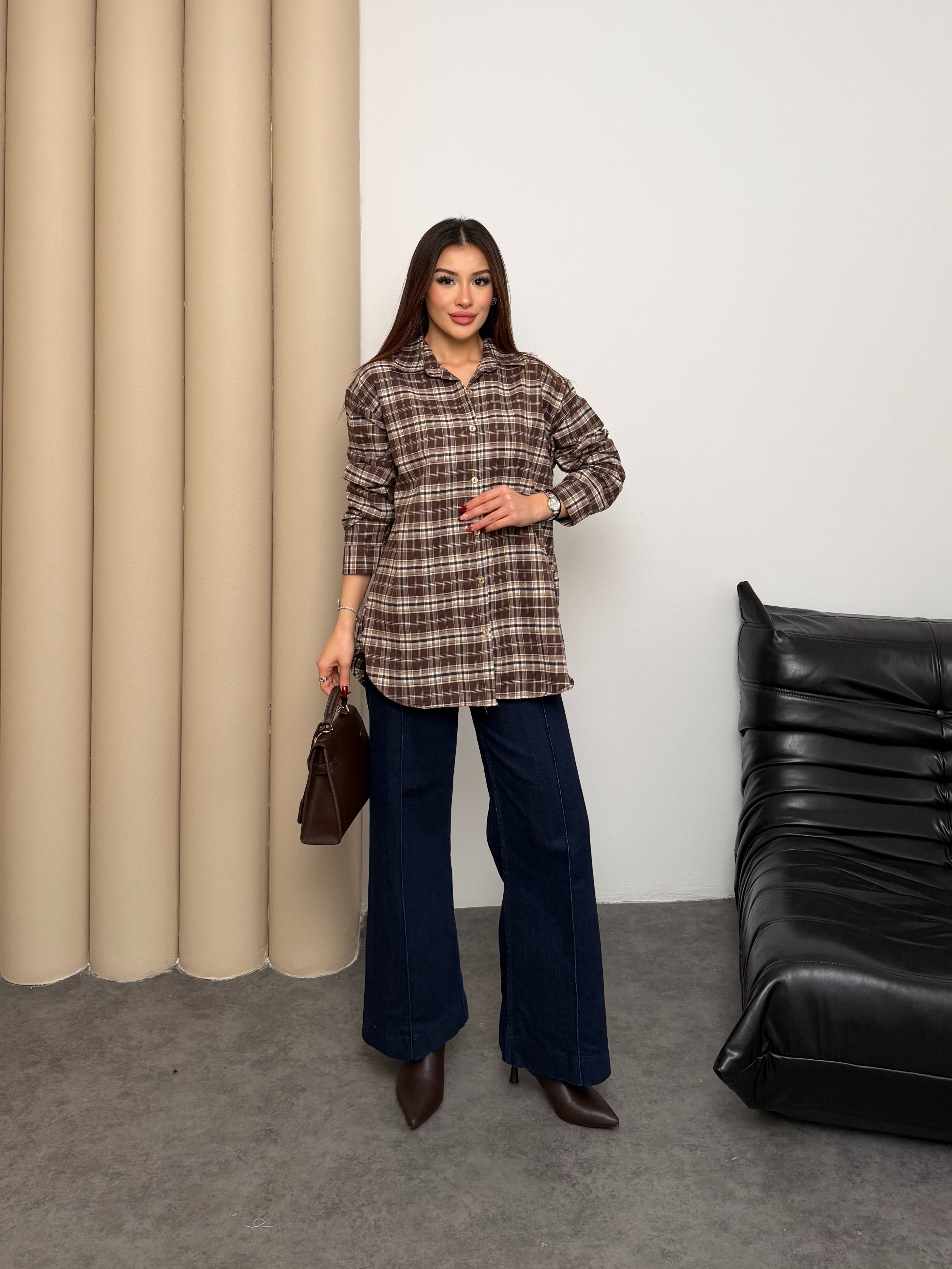 Kadın Ekose Desenli Oversize Gömlek 8968 - Kahve-Ekru