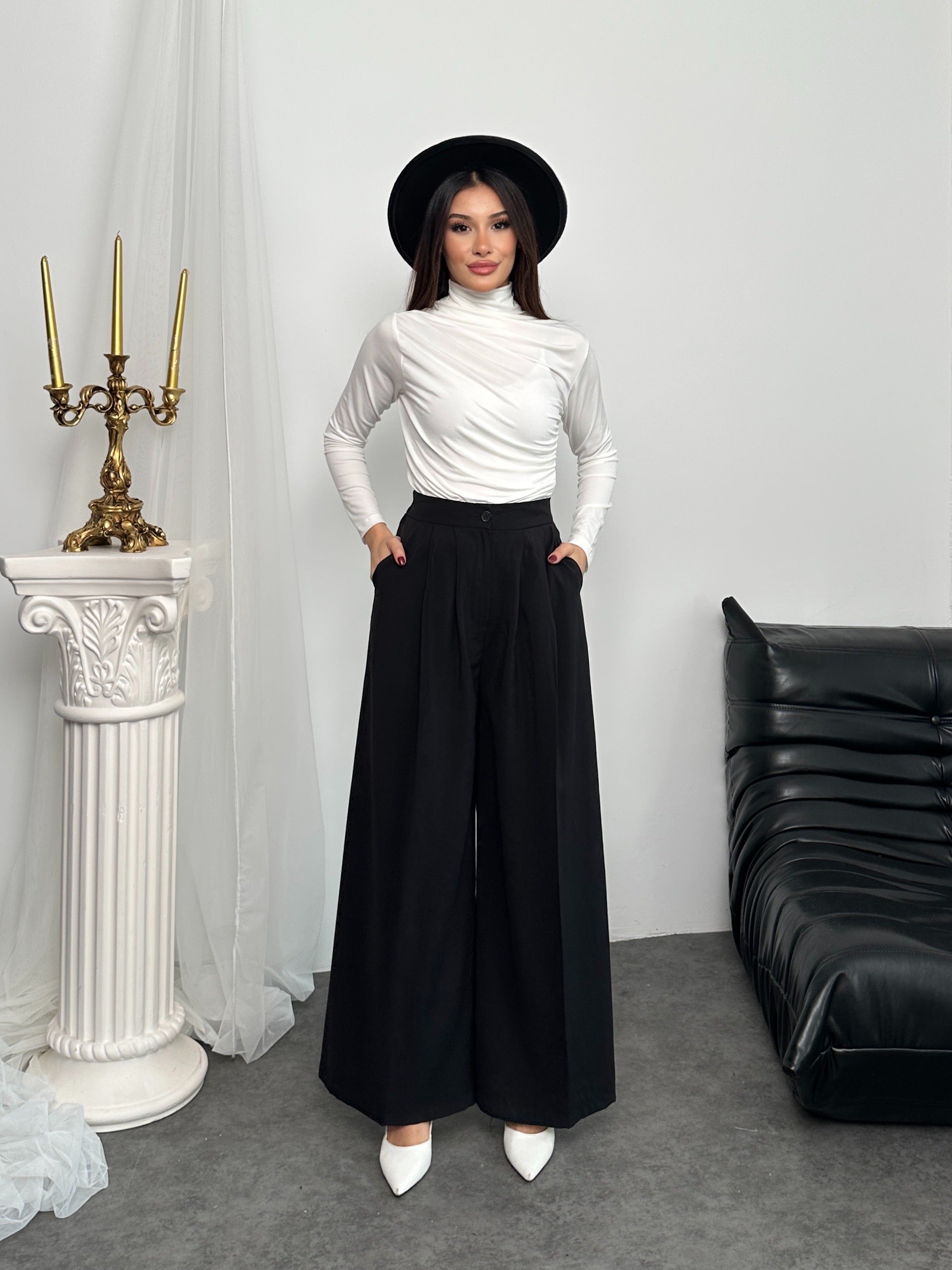 Pileli Yüksek Bel Geniş Paça Modal Kumaş Palazzo Pantolon 8039 - Siyah