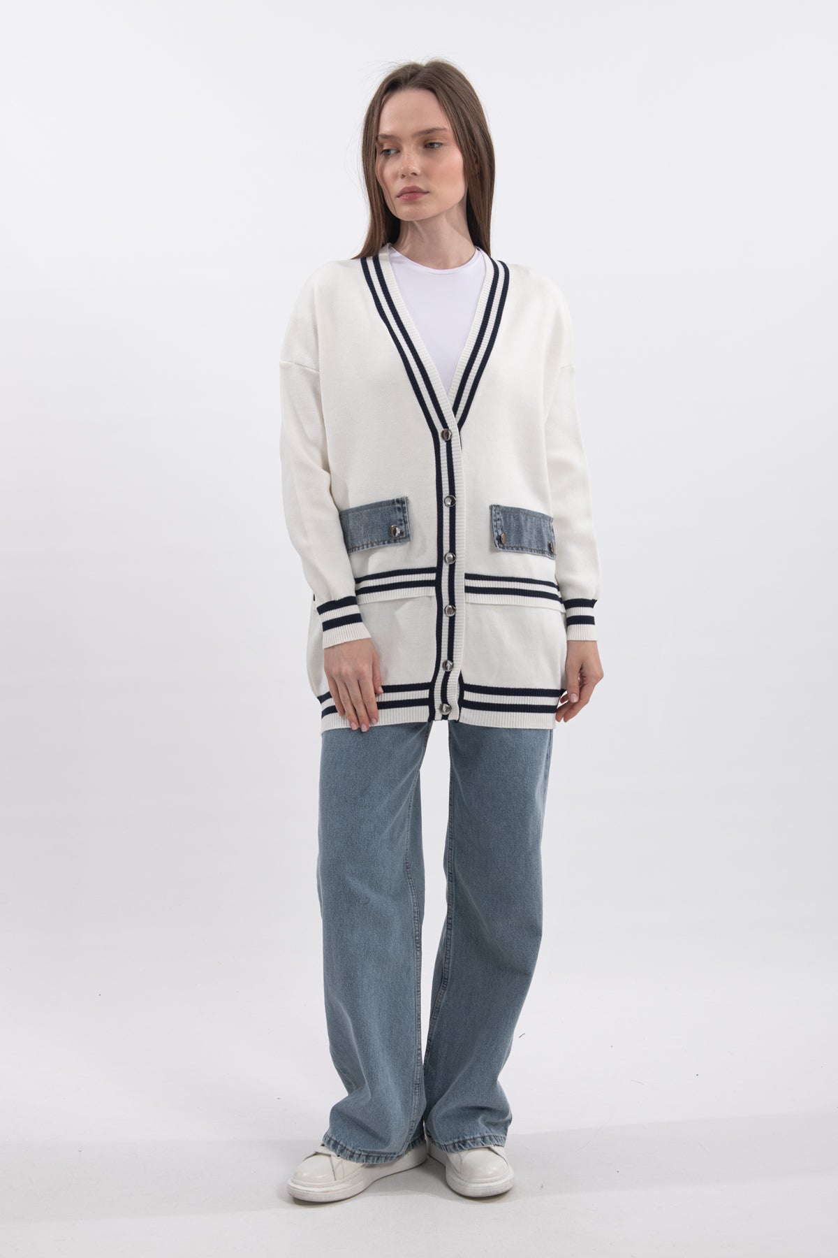 Anahtar Kelimeler: şerit detaylı hırka, denim cepli hırka, V yaka hırka, uzun kollu hırka, bej hırka, desenli hırka, sportif hırka, trend hırka, triko hırka, Hatunatila hırka