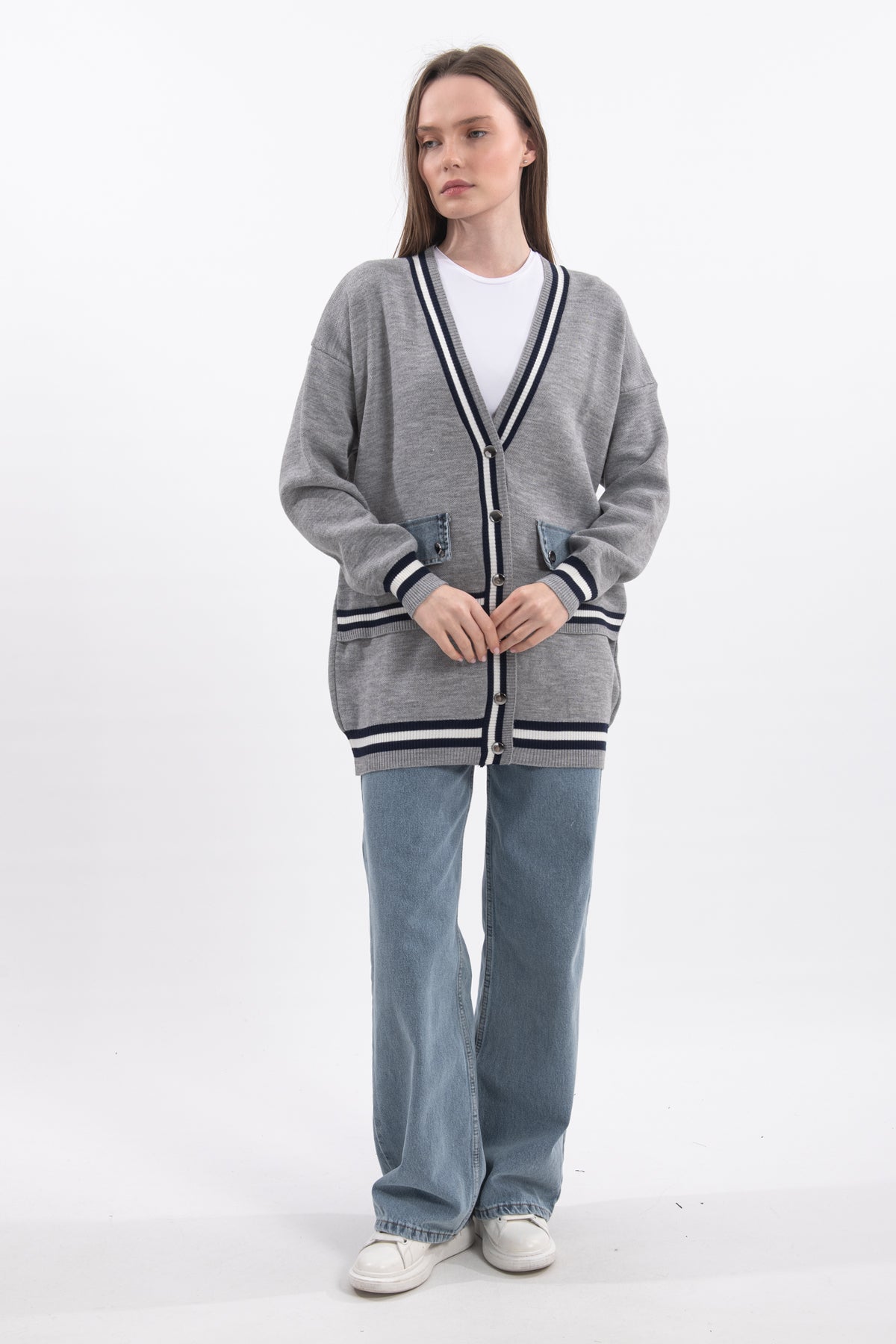 Şerit Detaylı Denim Cepli V Yaka Uzun Kollu Triko Hırka - Gri