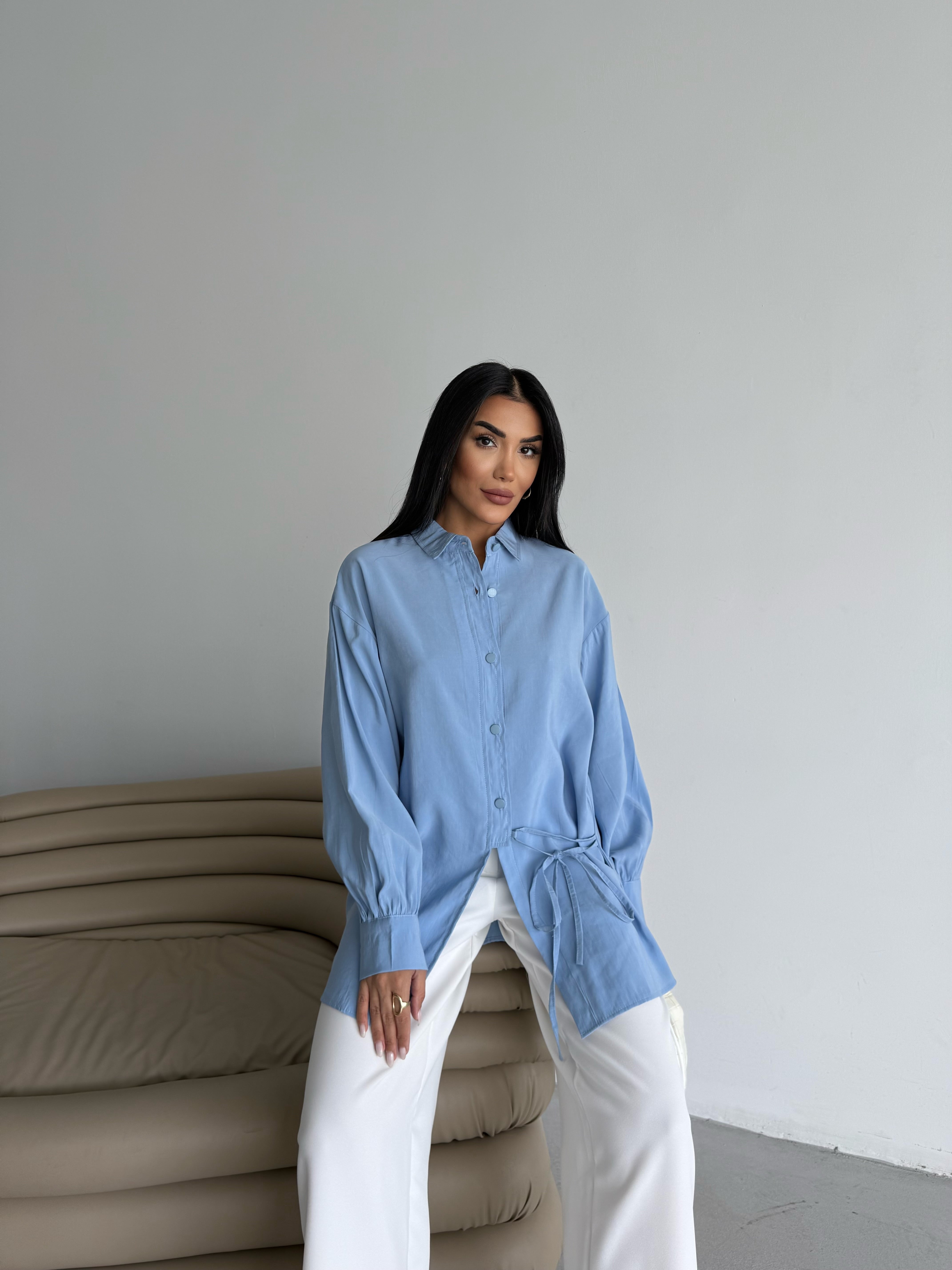 Özgün ve stil sahibi bir görünüm sunan yandan bağlamalı oversize uzun kollu gömlek, gardırobunuzun dikkat çekici parçalarından biri olmaya aday. Canlı mavi rengi enerjik bir hava yaratırken, yandan bağlama detayı gömleğe asimetrik ve modern bir dokunuş katıyor. Oversize kesimi rahat bir kullanım sunarken, uzun kollu yapısı farklı mevsimlerde stilinizi yansıtmanıza olanak tanır. Klasik yakası ve düğme kapamasıyla şık bir görünüm sunar.