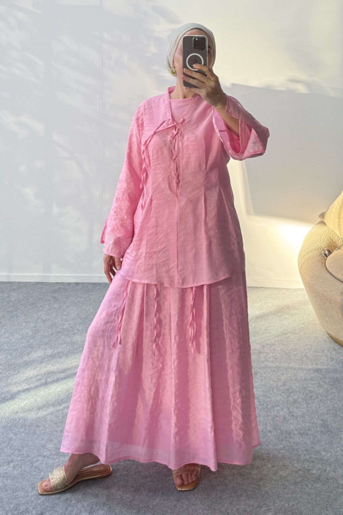 Zarafeti ve fonksiyonelliği bir araya getiren Astarlı V Yaka Bağlama Detaylı Bluz ve Uzun Etekli İkili Takım ile stilinize sofistike bir dokunuş katın. Canlı ama pastel pembe rengi ve şık kumaş dokusuyla öne çıkan bu takım, hem özel davetlerinizde hem de günlük kullanımınızda vazgeçilmeziniz olacak.