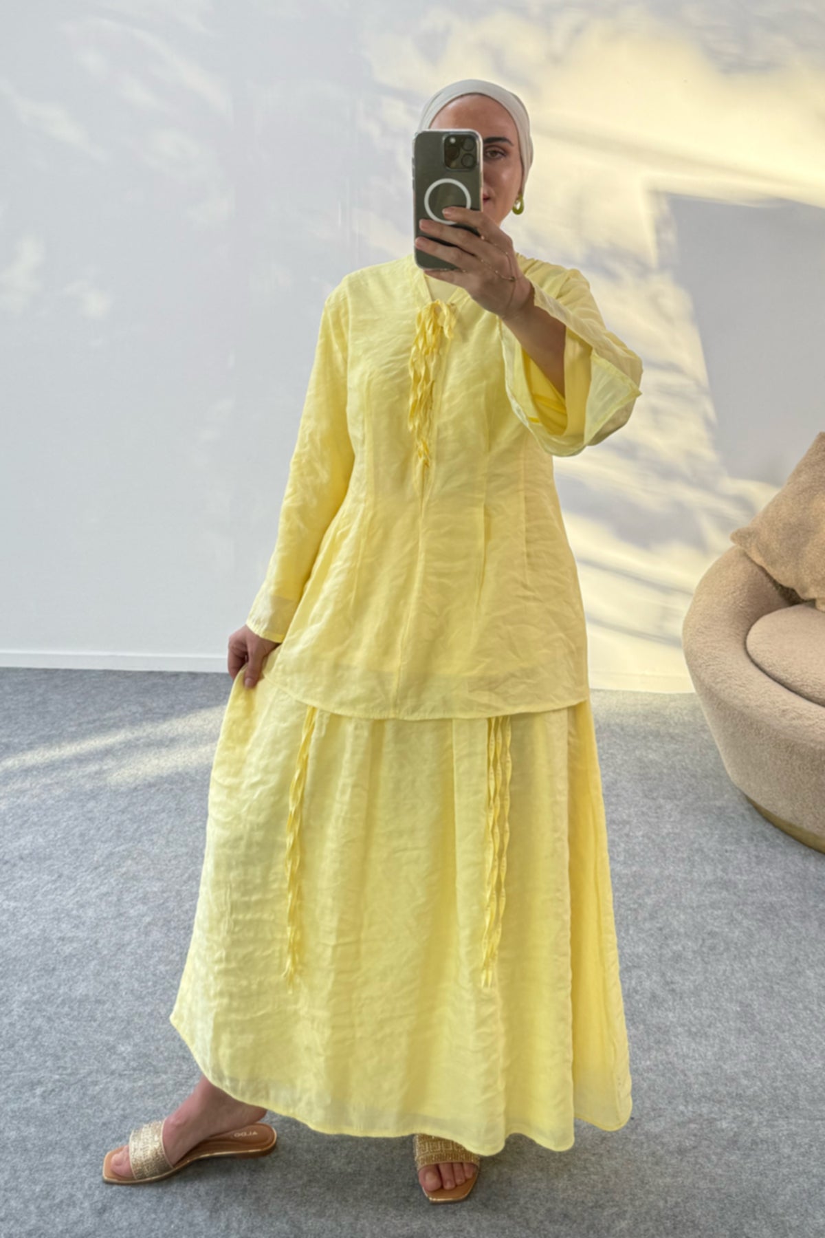 Zarafeti ve fonksiyonelliği bir araya getiren Astarlı V Yaka Bağlama Detaylı Bluz ve Uzun Etekli İkili Takım ile stilinize sofistike bir dokunuş katın. Canlı ama pastel sarı rengi ve şık kumaş dokusuyla öne çıkan bu takım, hem özel davetlerinizde hem de günlük kullanımınızda vazgeçilmeziniz olacak.