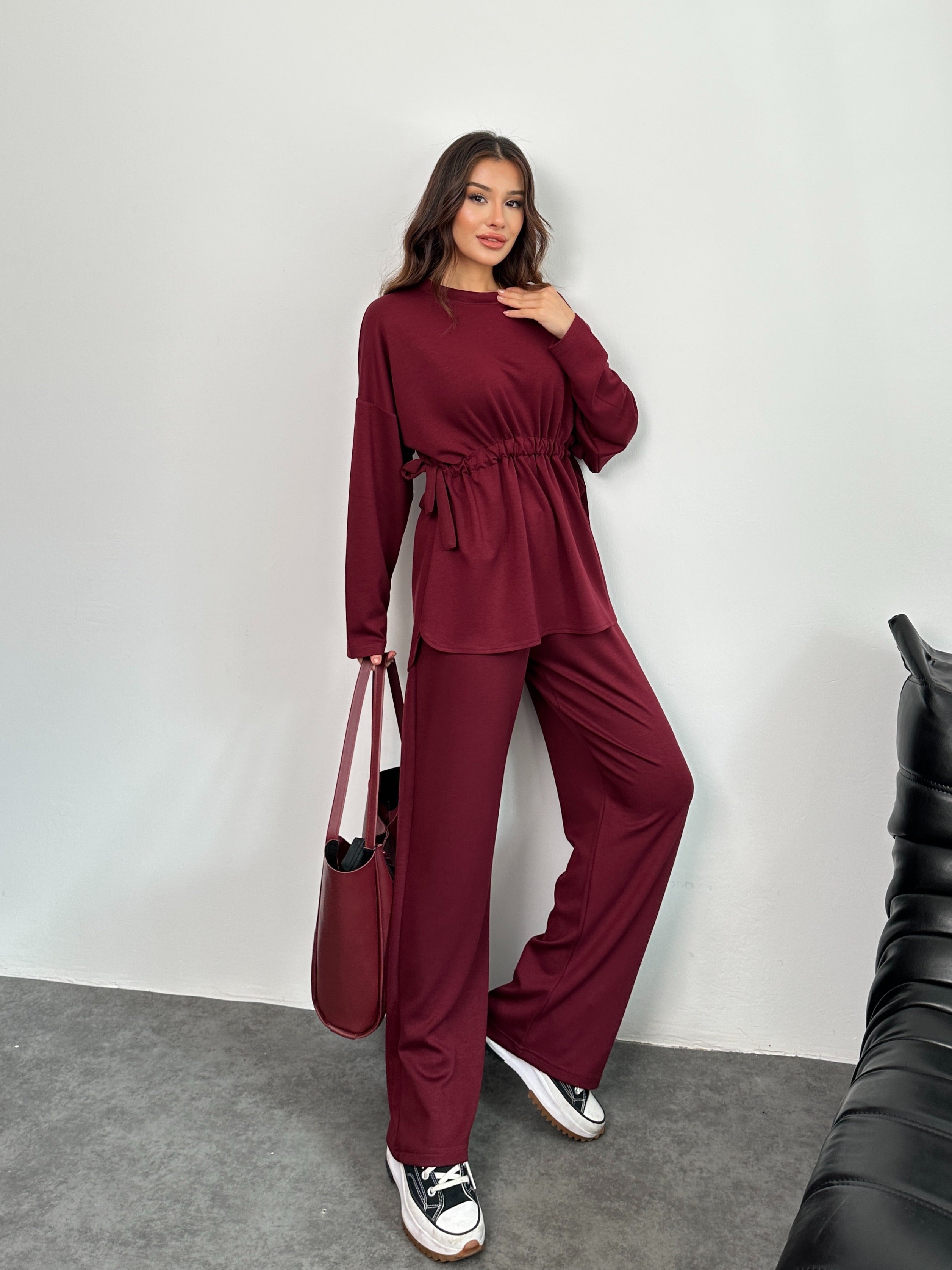 Takımın alt parçası olan bol paça pantolon, rahat ve akışkan kesimiyle gün boyu kullanım için idealdir. Pantolonun ve bluzun uyumlu bordo tonu, takıma monokrom ve şık bir görünüm katmaktadır.
