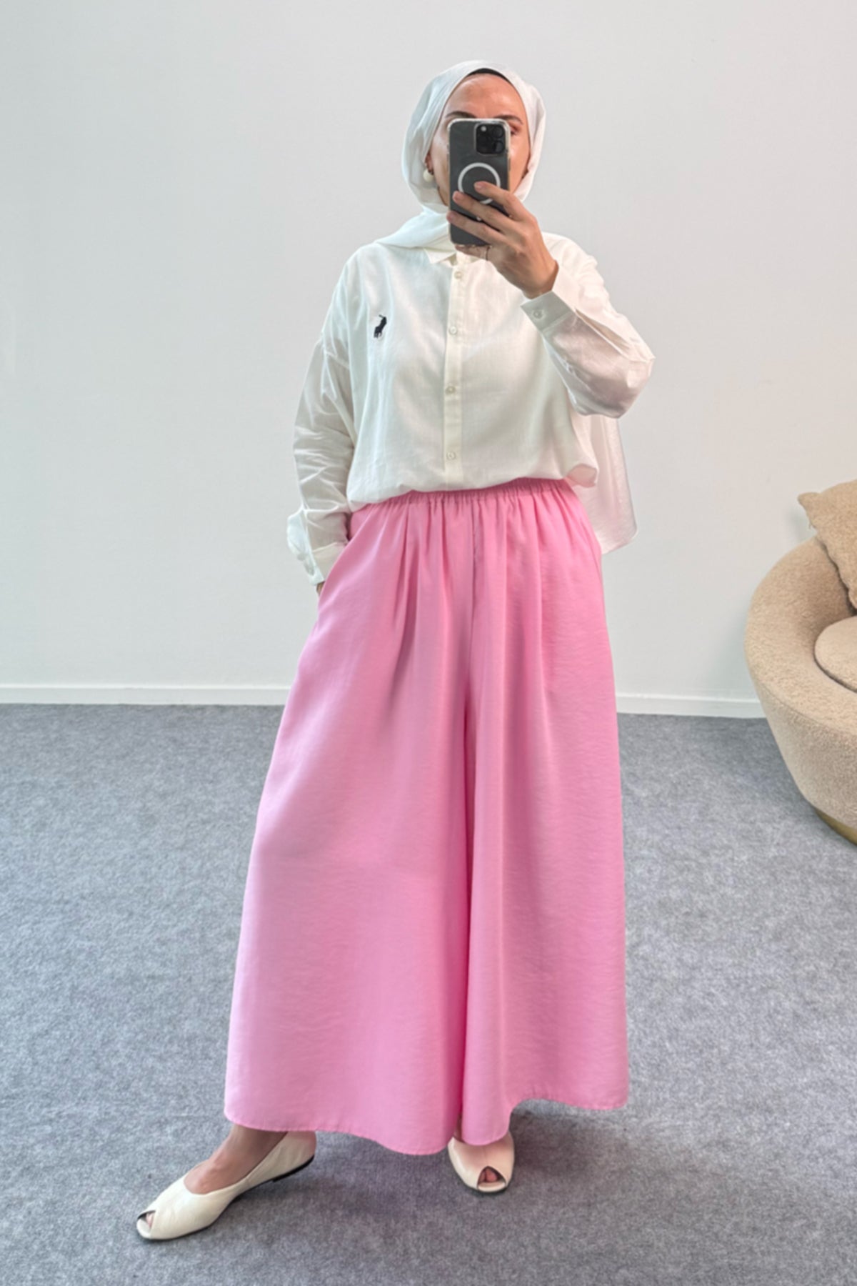 Gün boyu konfor ve şıklığı bir arada sunan beli lastikli geniş paça pantolon, gardırobunuzun vazgeçilmez parçalarından biri olmaya aday. Yumuşak ve hafif kumaşı sayesinde üzerinizde yokmuş gibi bir his yaratırken, beli lastikli yapısı kolayca üzerinize uyum sağlar ve rahat bir kullanım sunar. Geniş paça kesimi modern ve akıcı bir siluet oluştururken, pembe rengi her türlü üstle kolayca kombinlenebilme özelliği sunar.