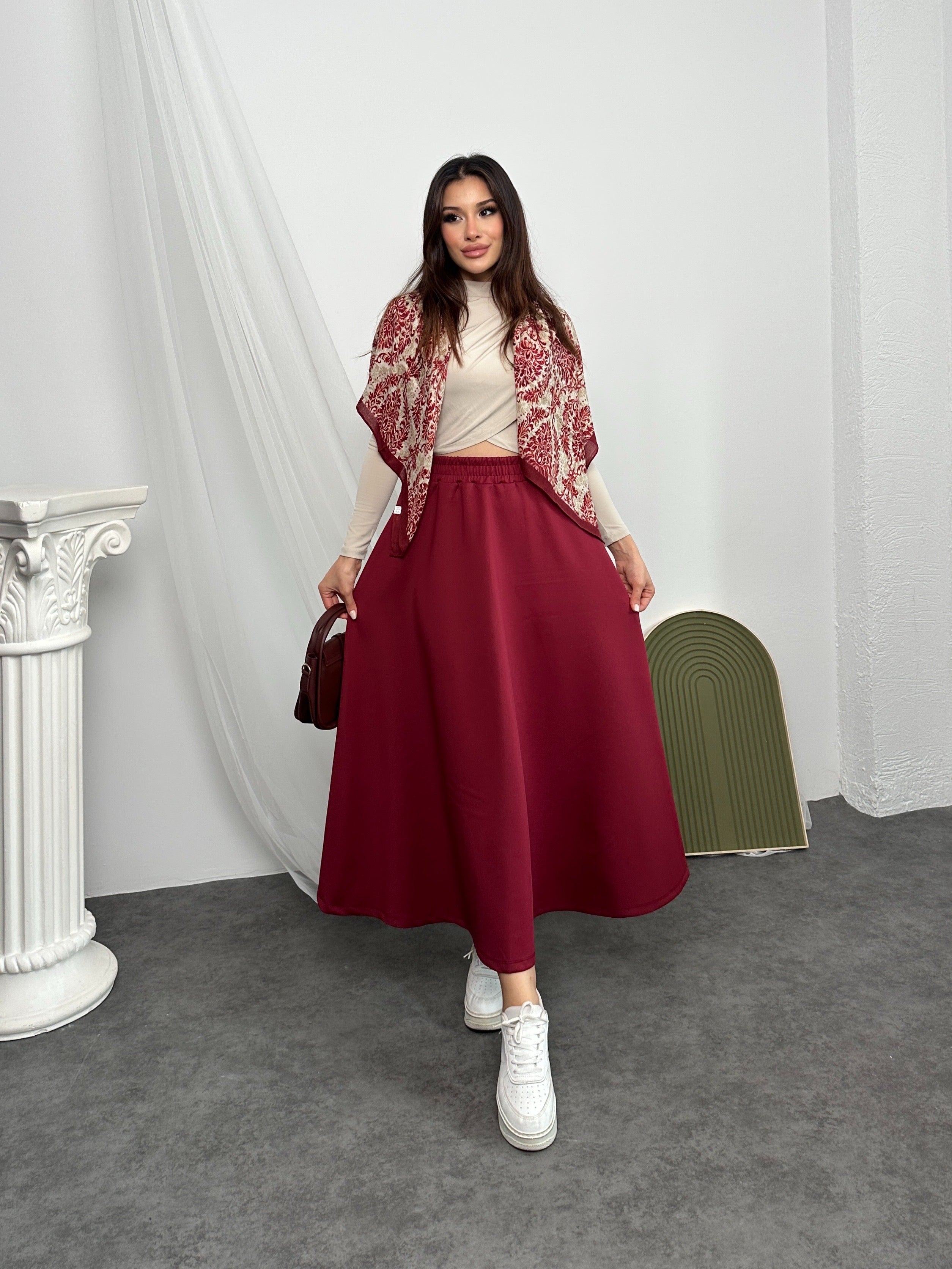 Beli Lastikli Scuba Kumaş Kloş Etek 8936 - Kırmızı
