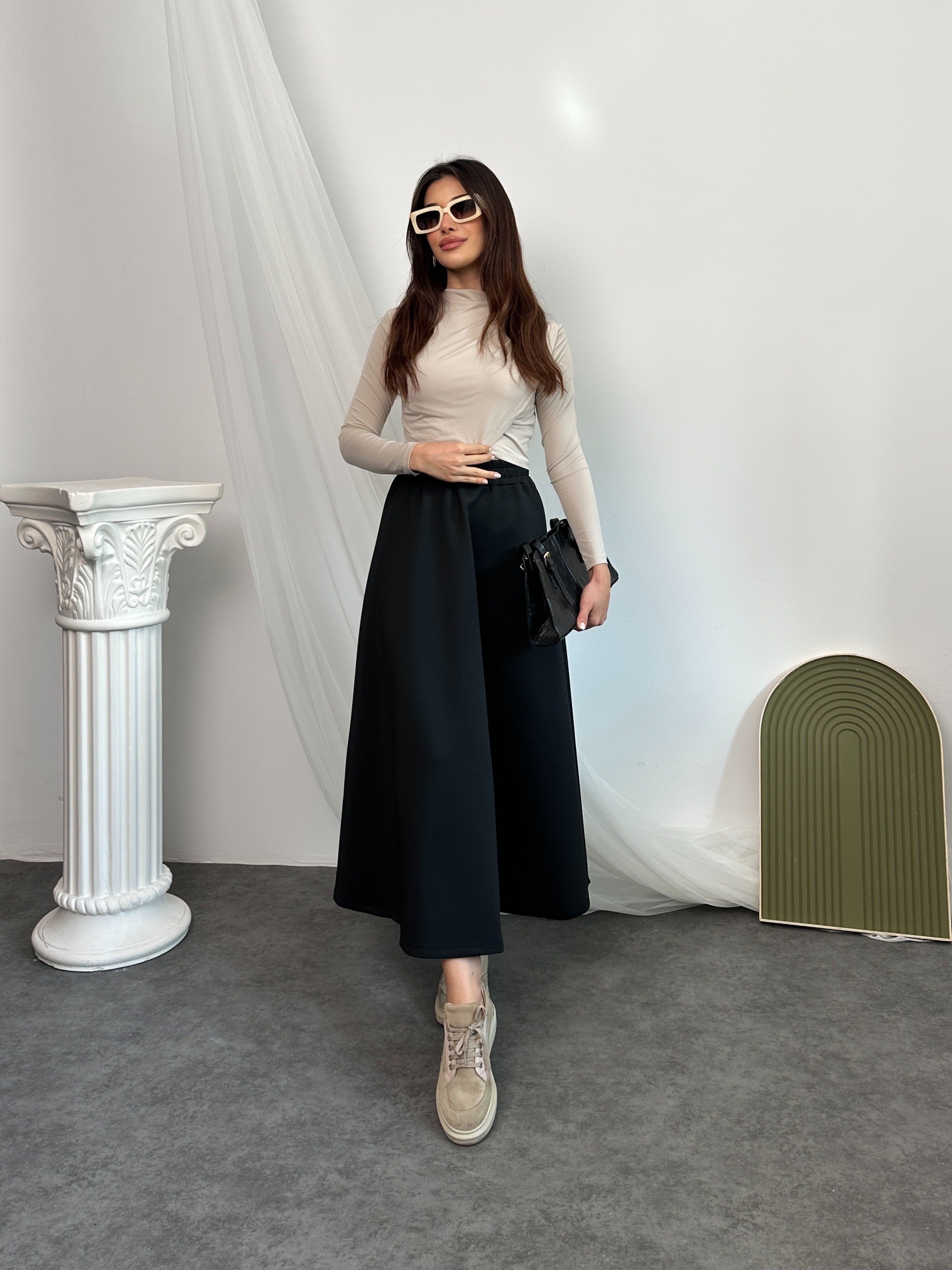 Bu scuba kumaş kloş etek ile şıklığı ve konforu bir arada yaşayın. Scuba kumaşın tok ve dökümlü yapısı, eteğin kloş kesiminin kusursuz durmasını sağlar ve etekteki formu korur. Lastikli yüksek bel tasarımı, hem rahat bir kullanım sunar hem de belinizi ince göstererek modern bir silüet oluşturur.