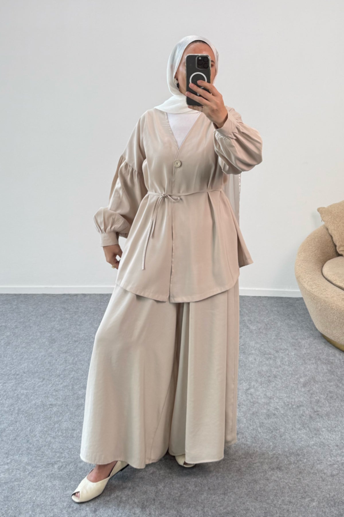 Büzgülü Balon Kollu Kemer Detaylı Bluz ve Geniş Paça Pantolonlu İkili Takım - Bej