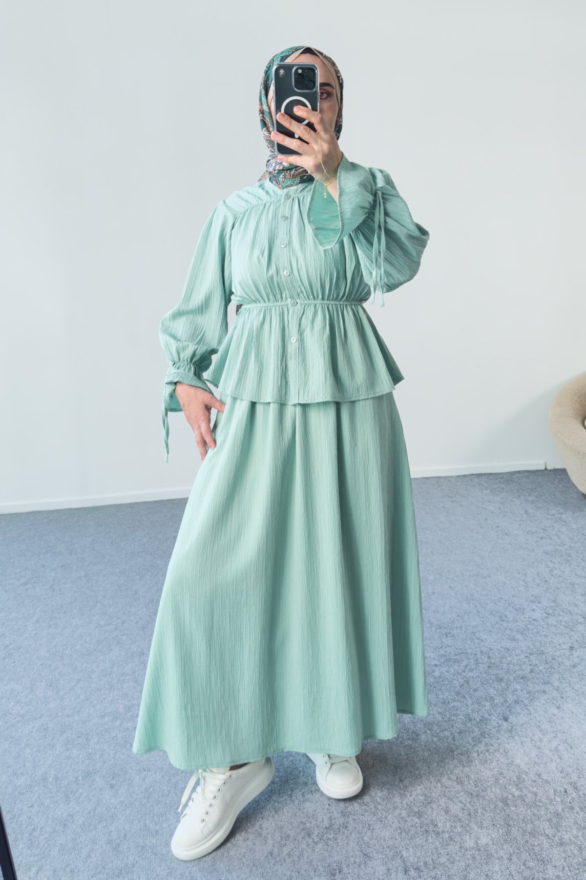 Büzgülü Ve Kat Kat Gömlek ve Etekli Takım 8025 - Su Yeşili