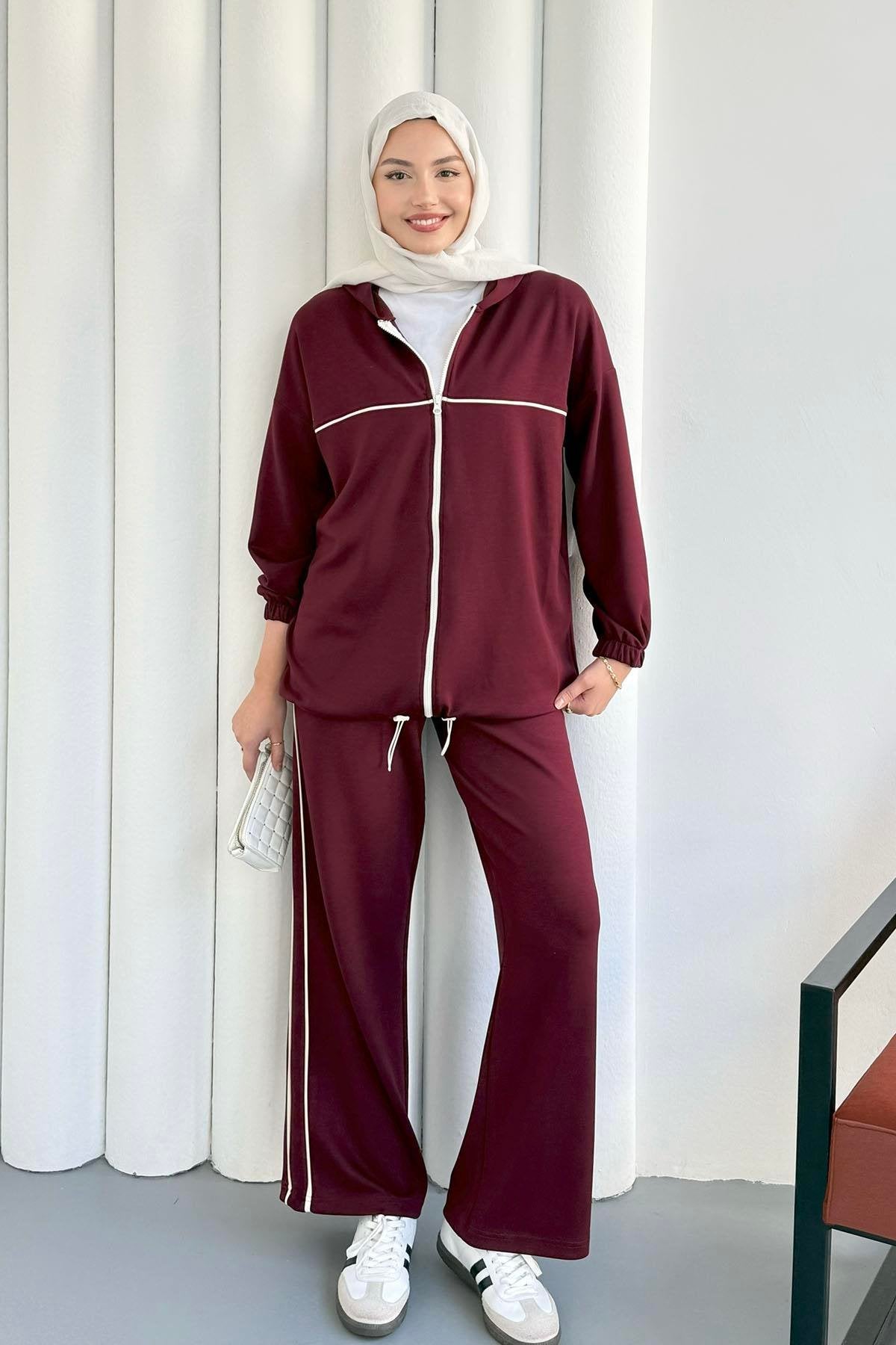 Çizgi Detaylı Fermuarlı Kapüşonlu İkili Takım 30111 - Bordo