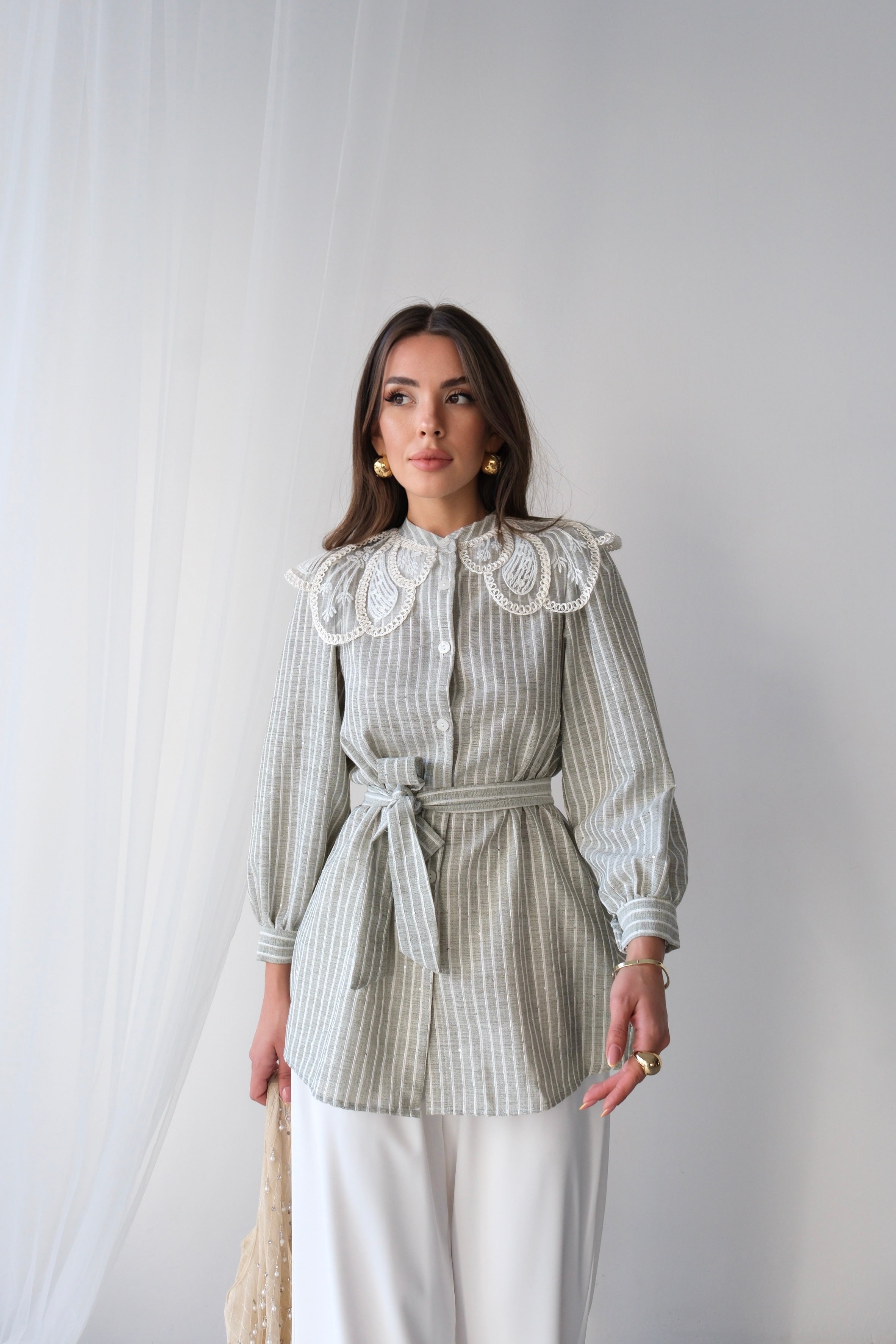 Zarif detayları ve rahat kesimiyle öne çıkan dantel yakalı çizgili kuşaklı uzun kollu tunik, gardırobunuza romantik bir dokunuş katmaya hazır. Klasik gri ve beyaz çizgili deseni zamansız bir şıklık sunarken, özenle işlenmiş dantel yakası feminen bir hava yaratır. Bel kısmındaki kuşak detayı sayesinde vücut hatlarınızı zarifçe vurgulayabilir ve farklı bağlama şekilleriyle stilinizi kişiselleştirebilirsiniz. Uzun kollu ve hafif kumaşı sayesinde farklı mevsimlerde rahatlıkla kullanabilirsiniz.